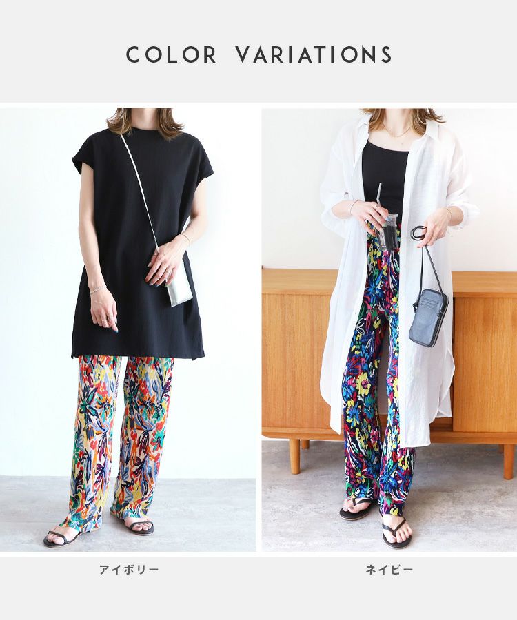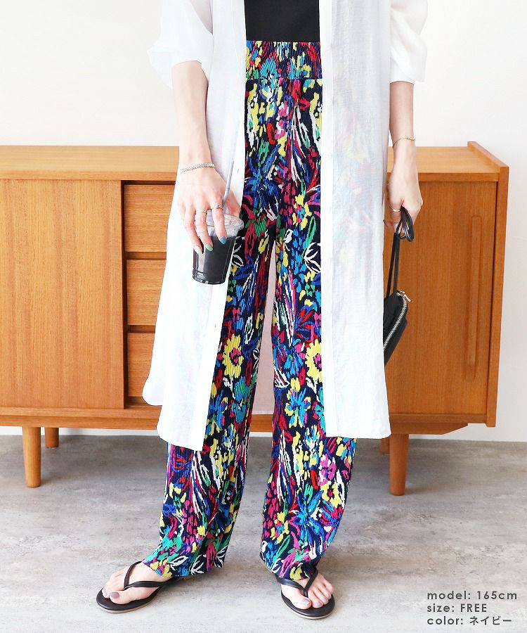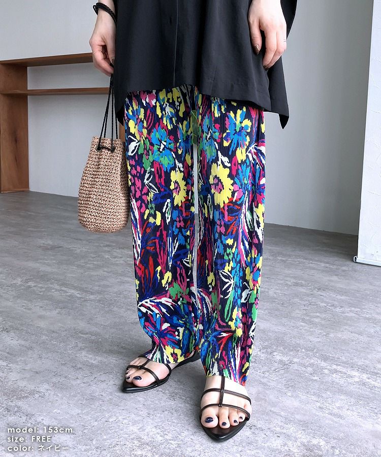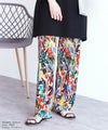 レディース ボトムス ロング ウエストゴム 楽ちん 柄パンツ 総柄 花柄 デザインパンツ リラックスパンツ イージーパンツ カジュアル 華やか リゾート ビーチ 夏 大人女子 30代ファッション 30代コーデ ママコーデ トレンドコーデ カラフル ネイビー アイボリー