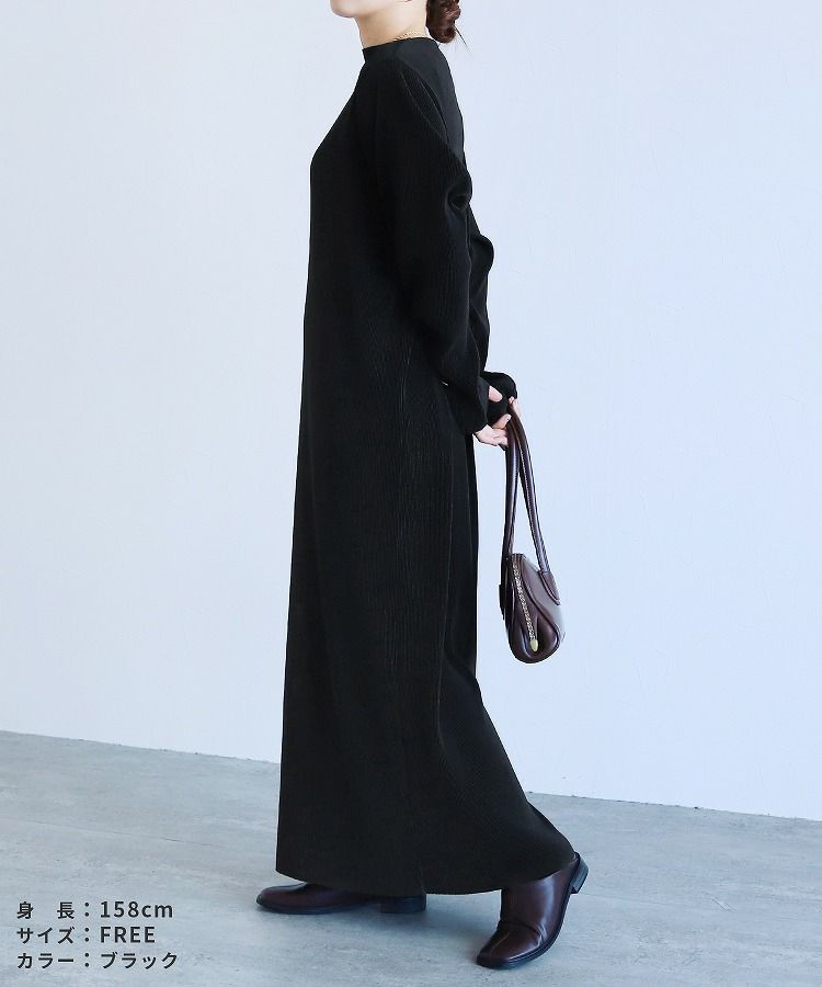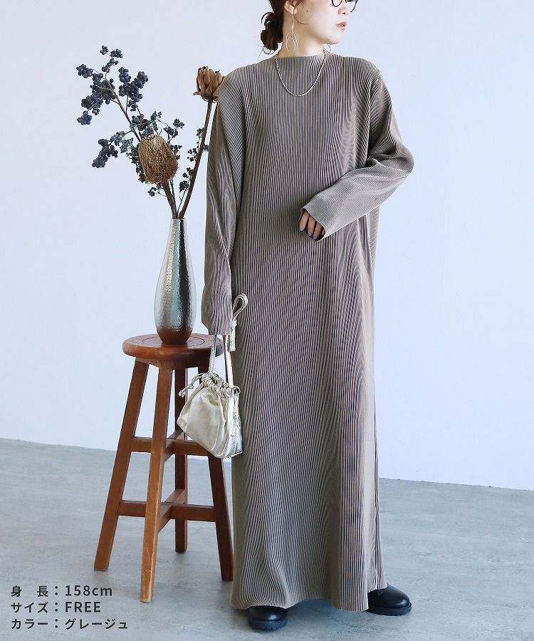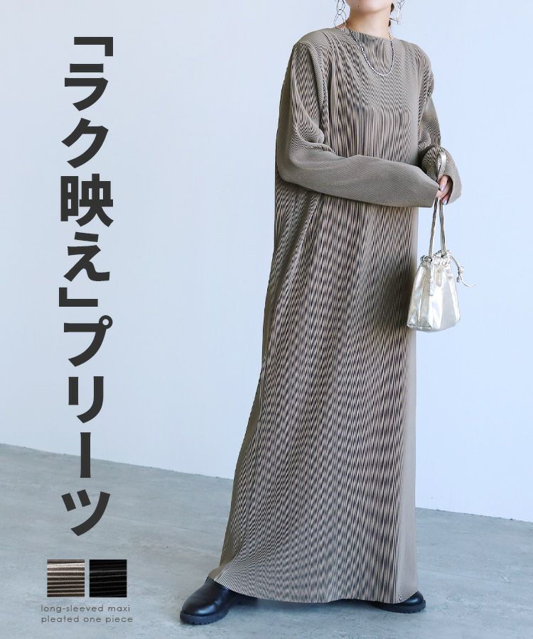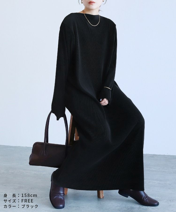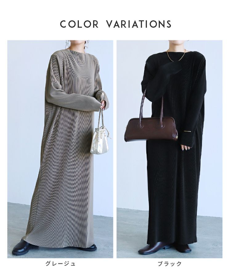 レディース ワンピース ロング マキシ プルオーバー セルフカット カットオフ プリーツ アコーディオンプリーツ ゆったり 長袖 クルーネック 丸首 アイロン要らず キレイめ キレカジ カジュアル ワンマイルウェア イージーケア 楽ちん 妊婦 マタニティ 時短 落ち感 シンプル 大人女子 30代ファッション 30代コーデ 無地 グレージュ グレーダークベージュ ブラック 黒 くすみカラー
