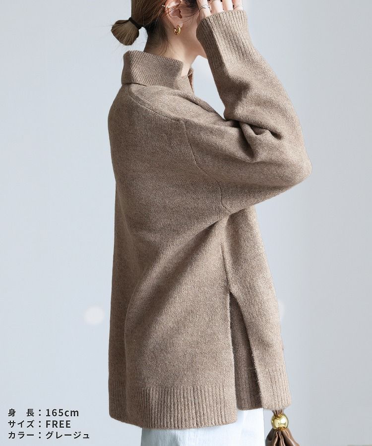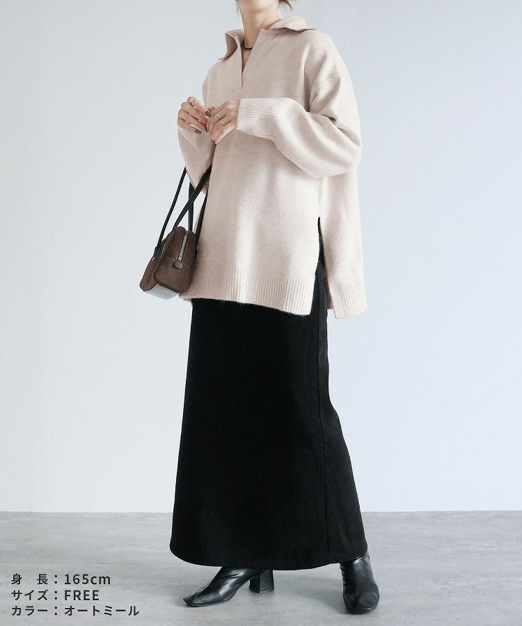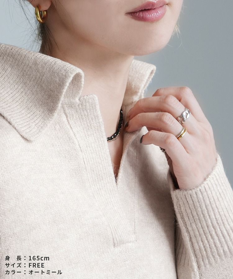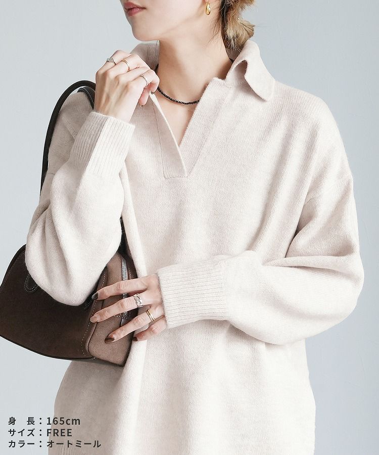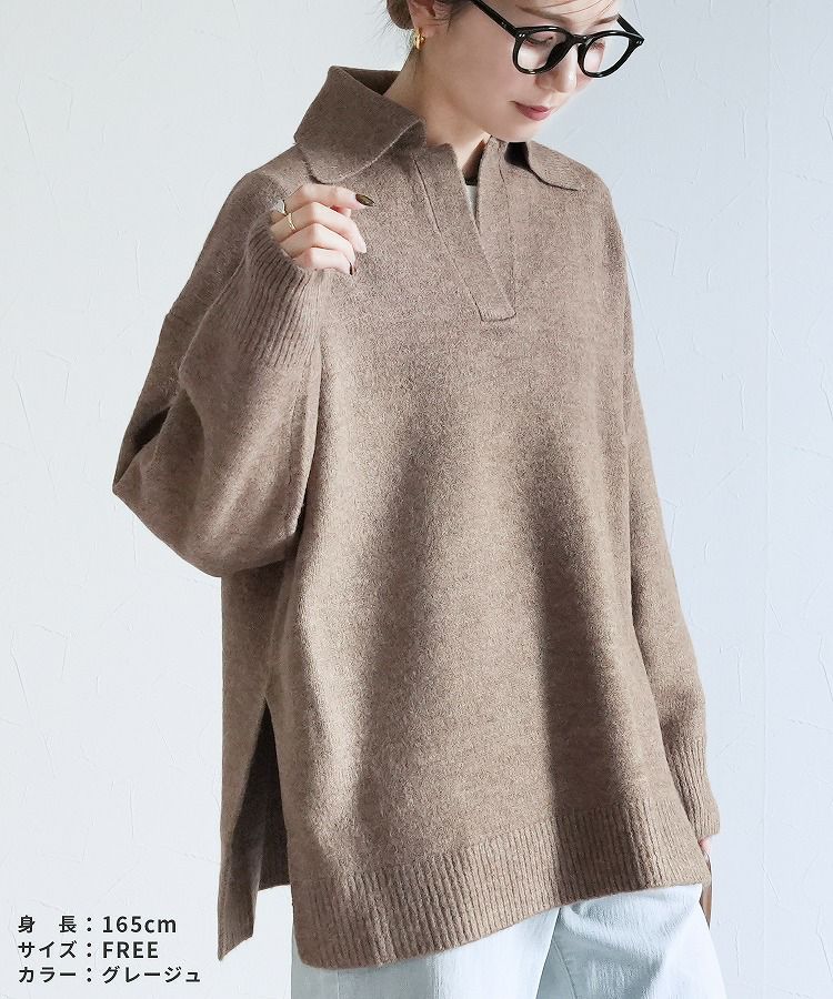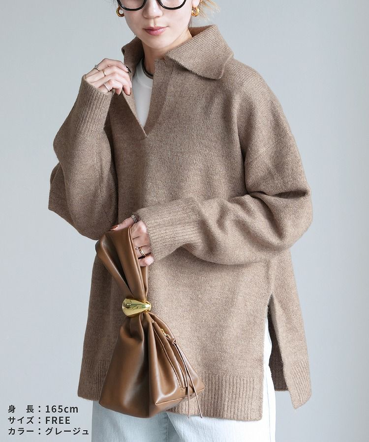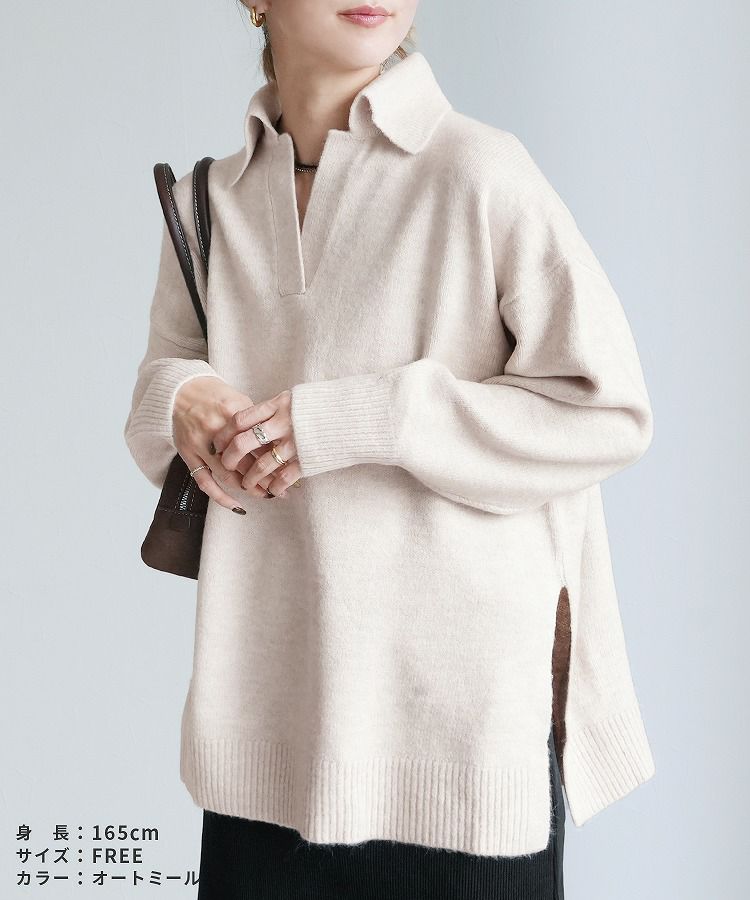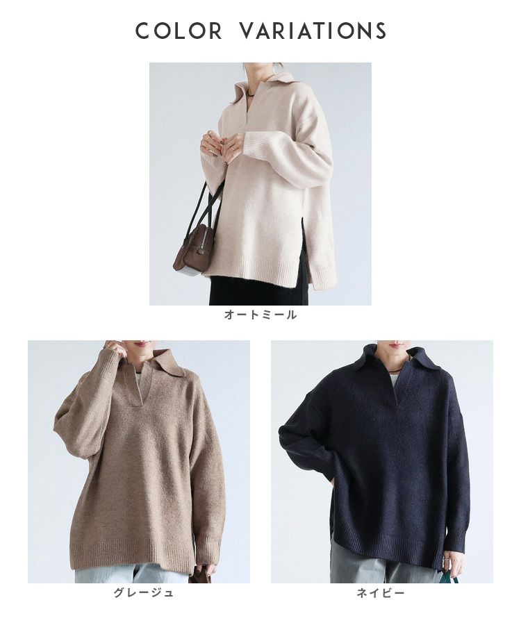 レディース トップス プルオーバー ニット セーター 無地 長袖 Vネック スキッパー 襟付きニット キレカジ カジュアル シンプル サイドスリット 長め丈 体型カバー ゆったり 大人女子 30代ファッション 30代コーデ もちもち チクチクしない ベージュ グレージュ オートミール アイボリー ネイビー