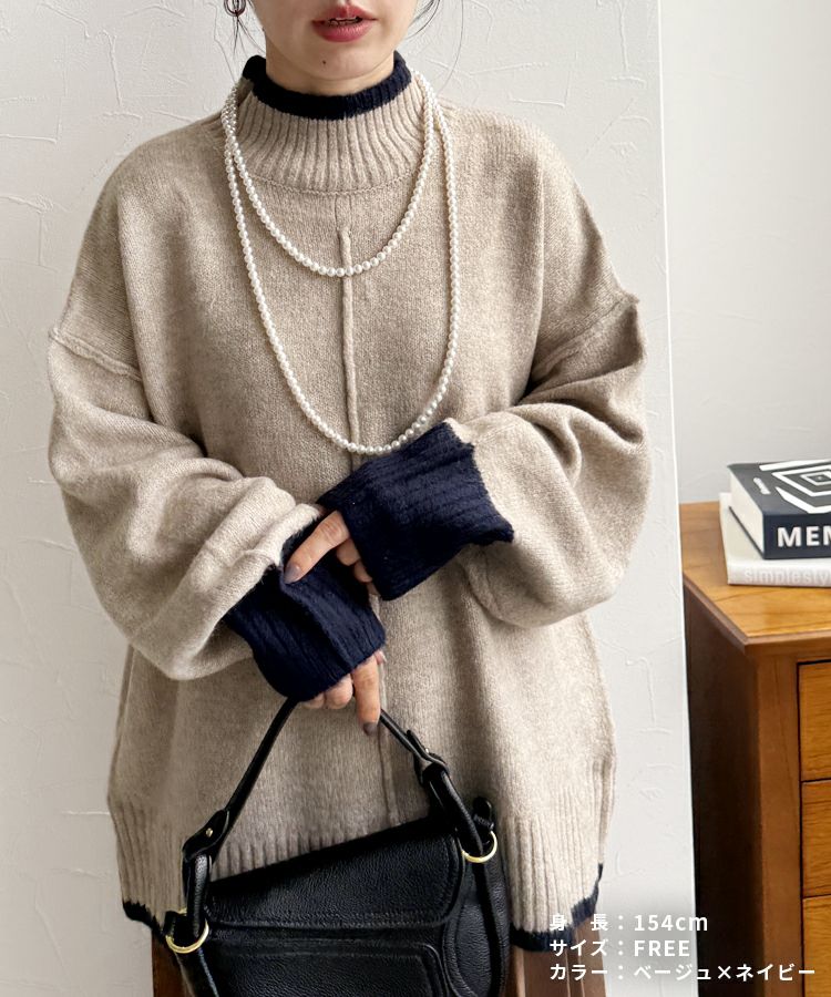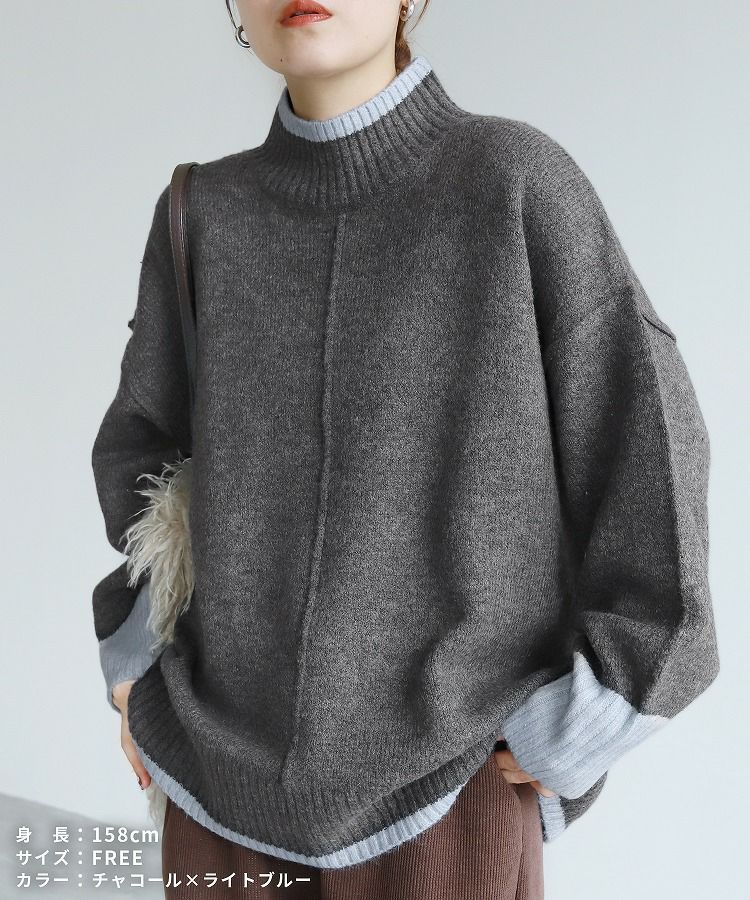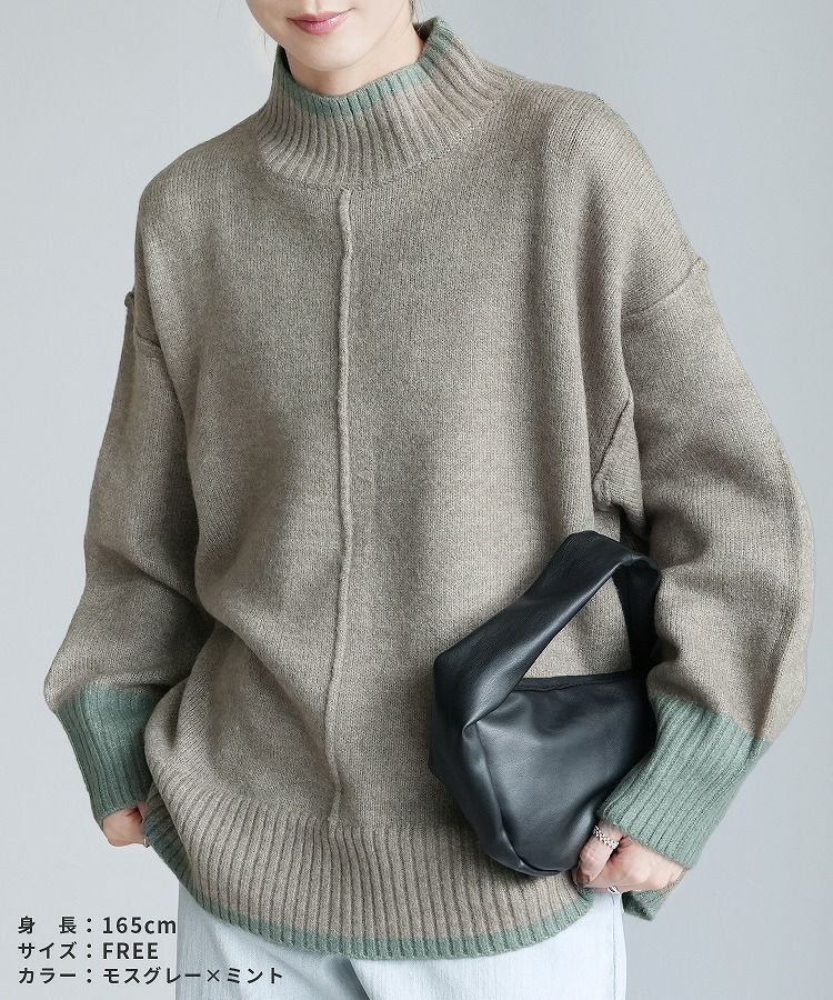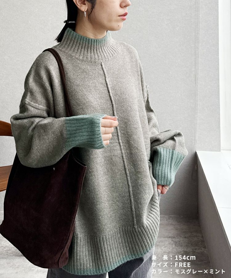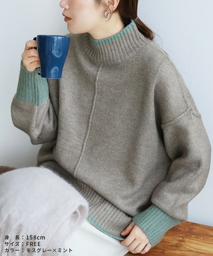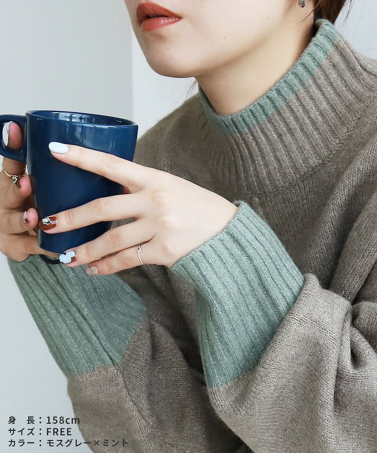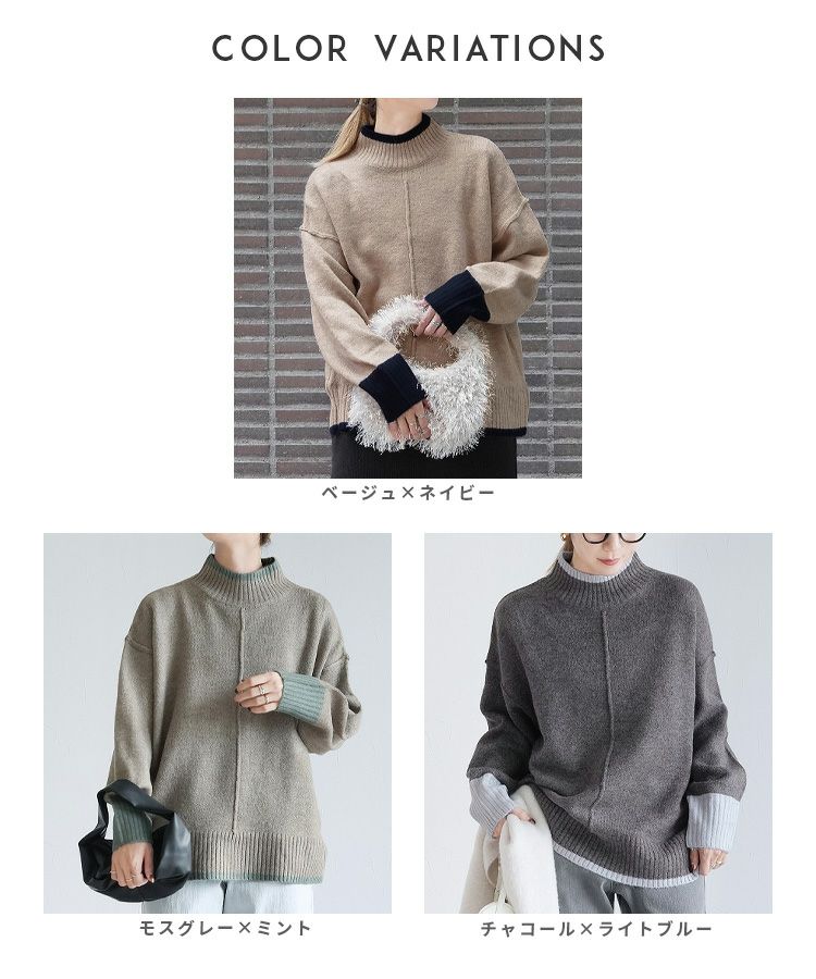 レディース トップス プルオーバー ニット セーター 長袖 ゆったり 楽ちん 体型カバー バイカラー 配色ニット ハイネック モックネック カジュアル シンプル 大人女子 30代ファッション 30代コーデ オートミール ベージュ チャコール グレー ミント ブルー ネイビー