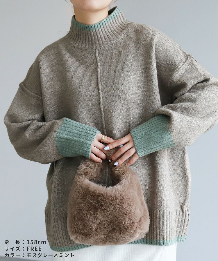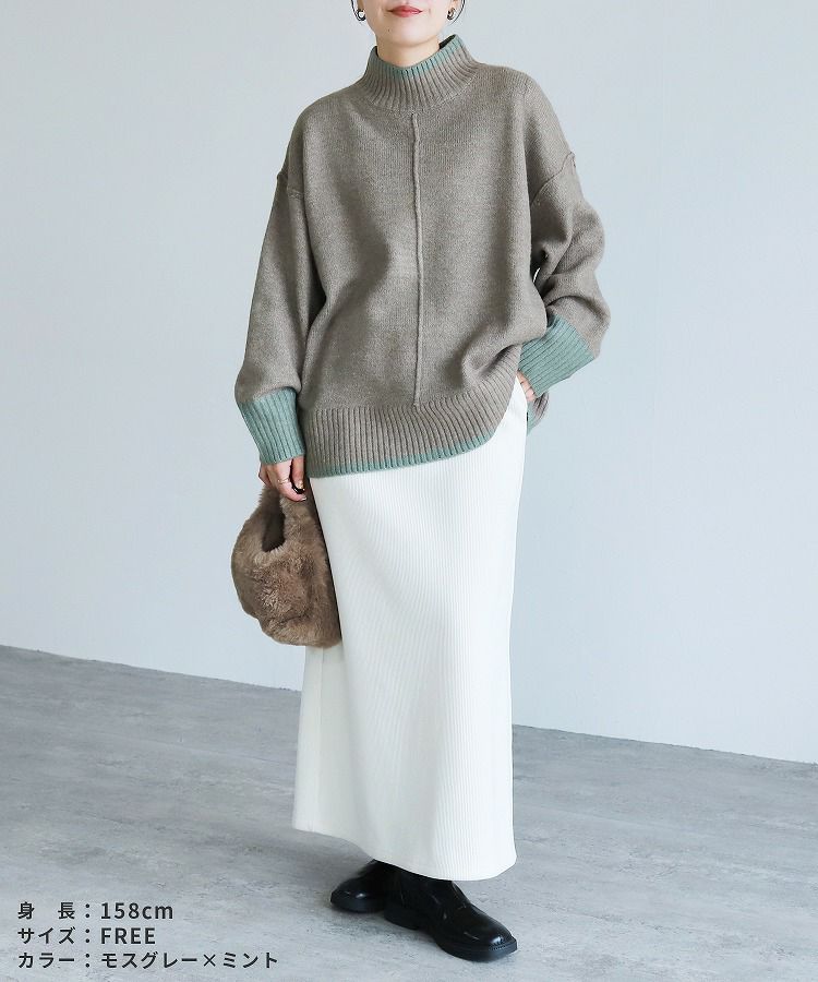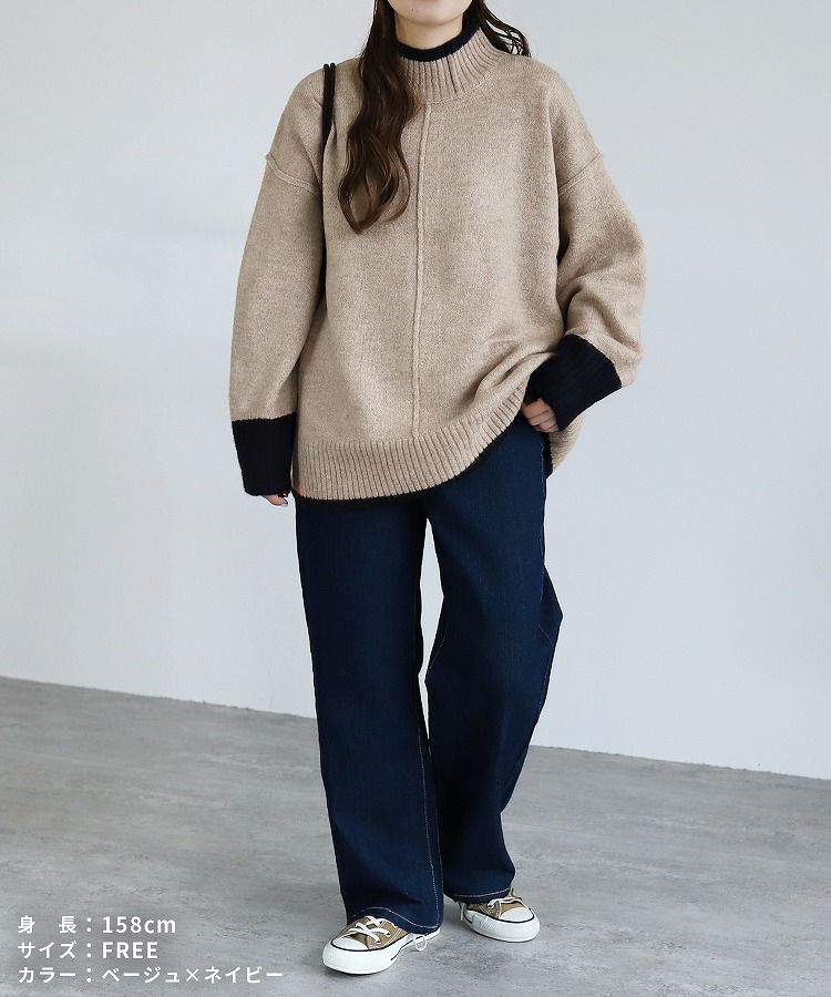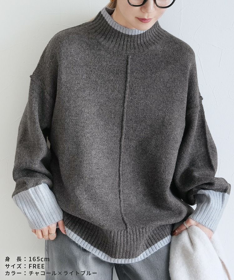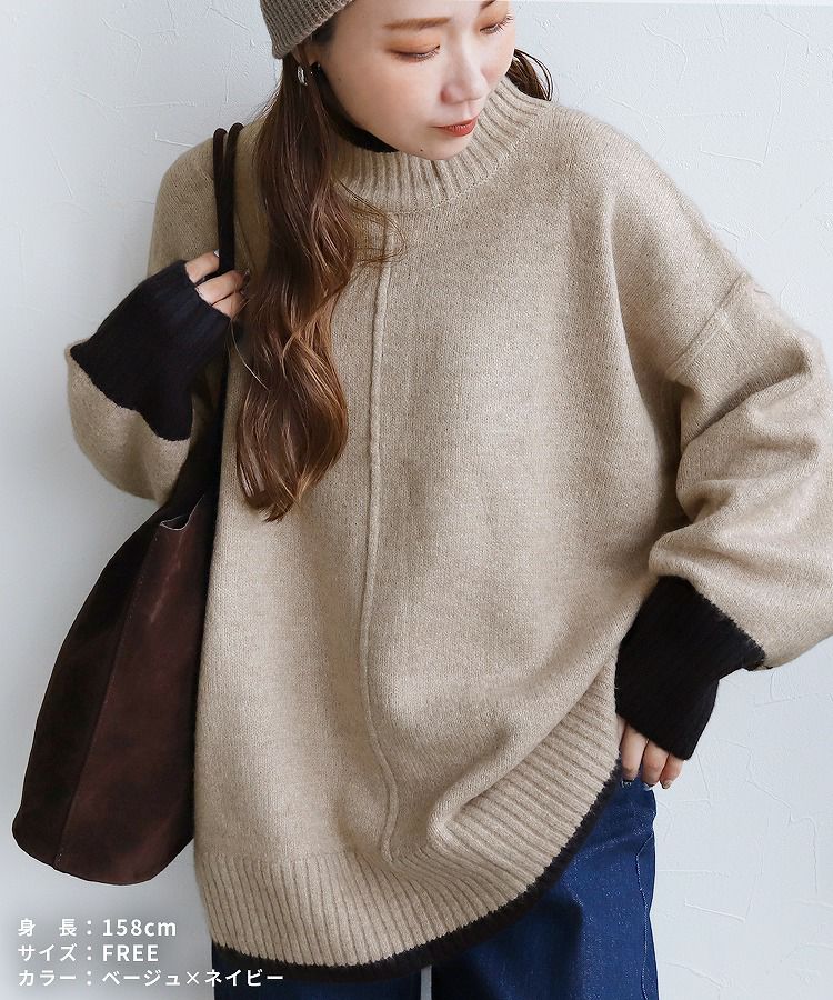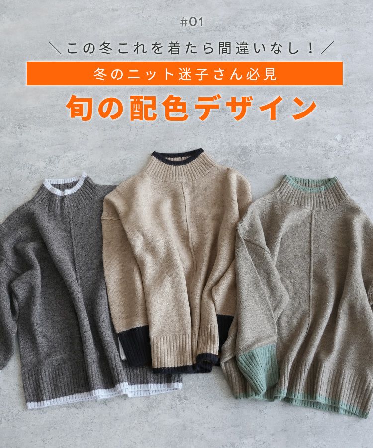レディース トップス プルオーバー ニット セーター 長袖 ゆったり 楽ちん 体型カバー バイカラー 配色ニット ハイネック モックネック カジュアル シンプル 大人女子 30代ファッション 30代コーデ オートミール ベージュ チャコール グレー ミント ブルー ネイビー