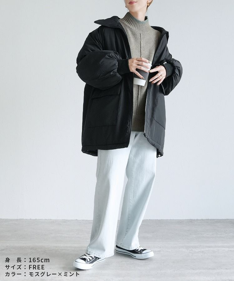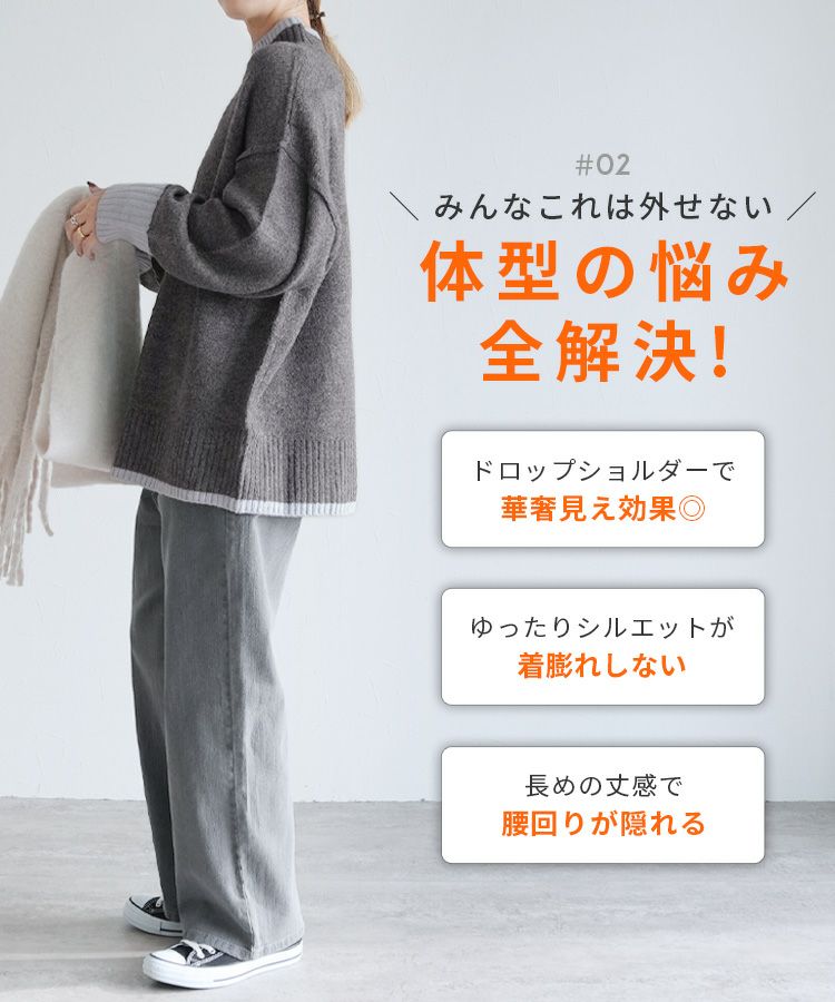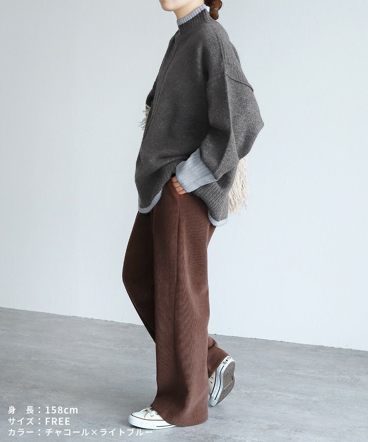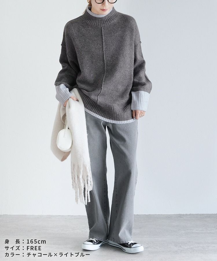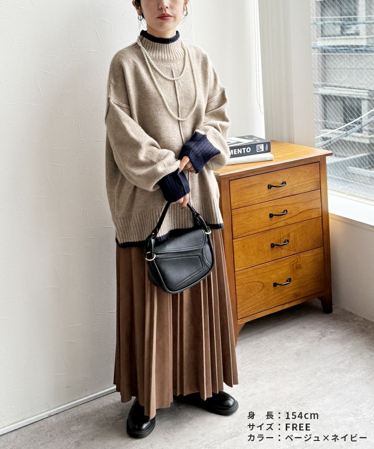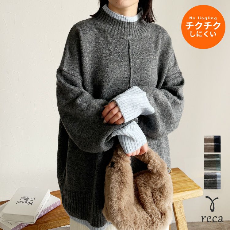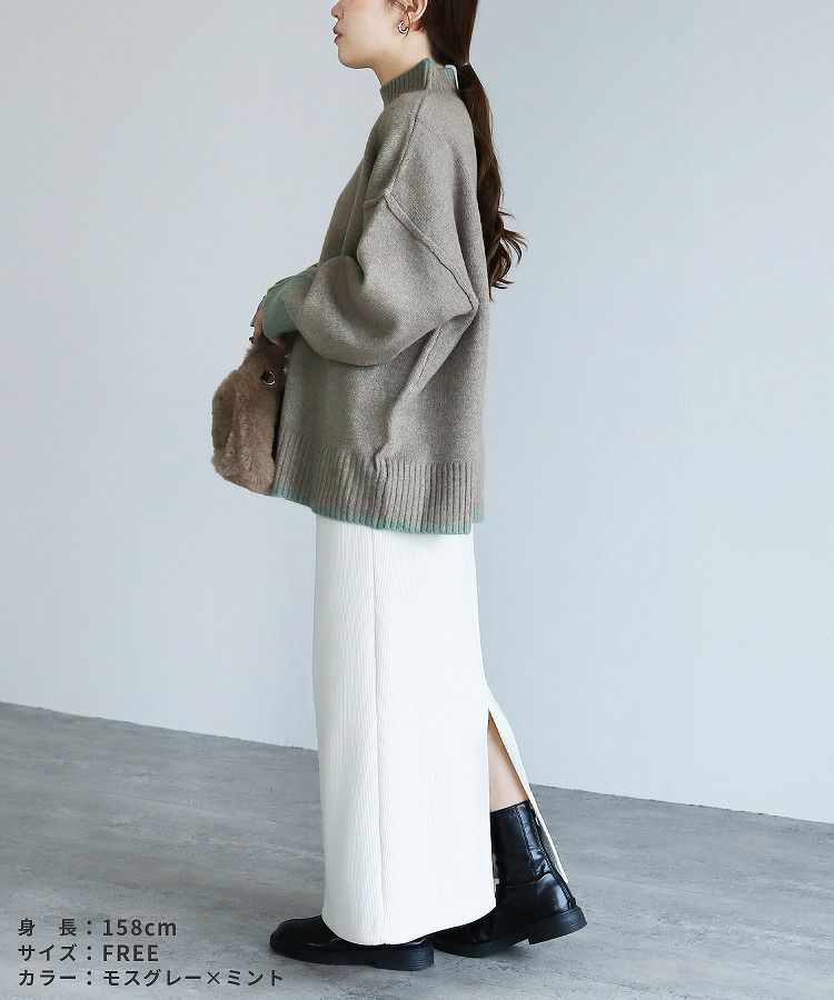 レディース トップス プルオーバー ニット セーター 長袖 ゆったり 楽ちん 体型カバー バイカラー 配色ニット ハイネック モックネック カジュアル シンプル 大人女子 30代ファッション 30代コーデ オートミール ベージュ チャコール グレー ミント ブルー ネイビー