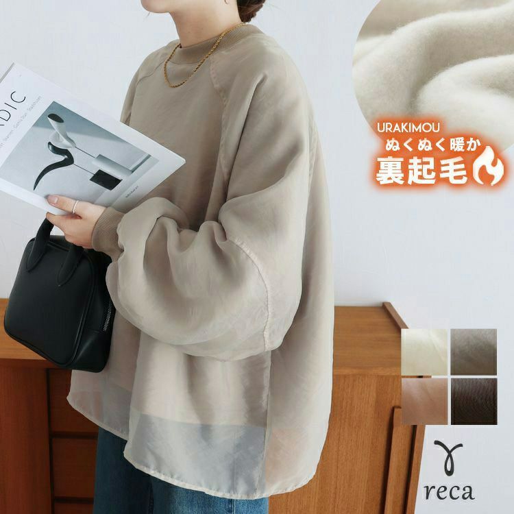 レディース トップス スウェット トレーナー プルオーバー 裏起毛 オーガンジー シアー 透け感 長袖 クルーネック 丸首 ボリューム袖 異素材 ラグラン カジュアル シンプル 大人女子 30代ファッション 30代コーデ アイボリー ピンク グレージュ ブラウン