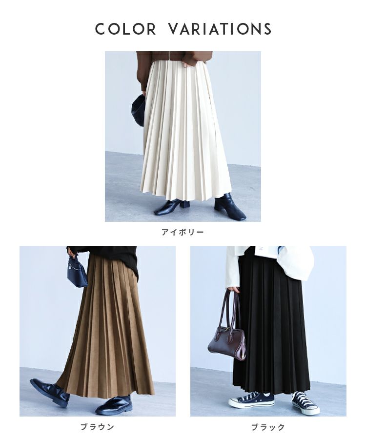 レディース ボトムス スカート プリーツ スウェード ロング 丈 ボリューム ひざ丈 ミモレ丈 ロングスカート プリーツスカート aライン マキシ 丈 フレアスカート フレア スエードタッチ スエード調 スエード風 キレカジ キレイめ カジュアル シンプル お呼ばれ 大人女子 女子会 30代ファッション 30代コーデ 無地 アイボリー ホワイト 白 ブラック 黒 ブラウン 茶