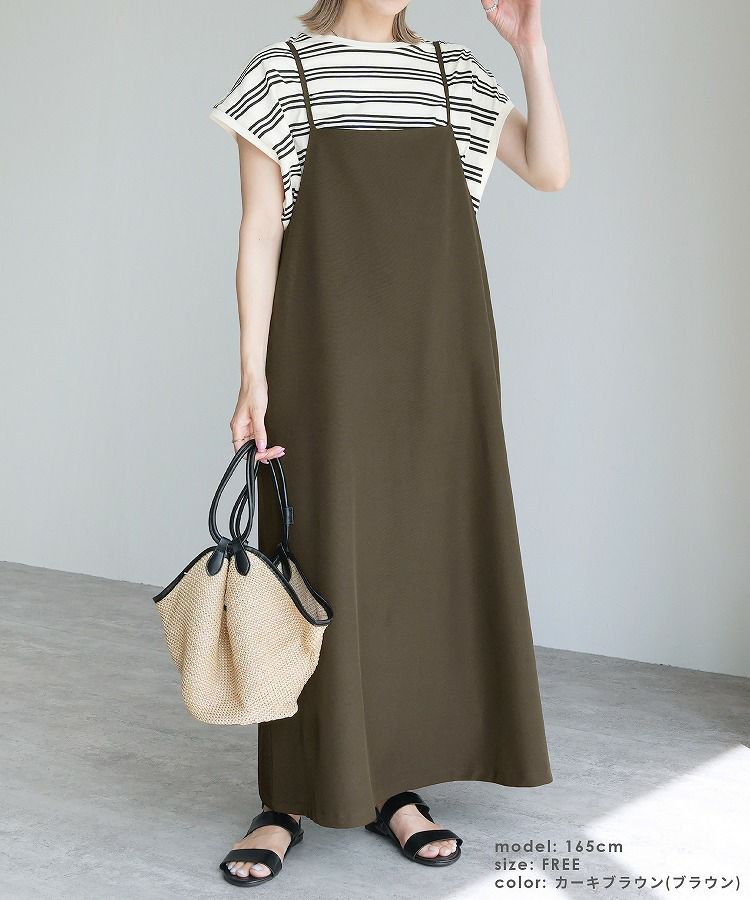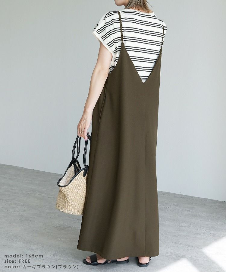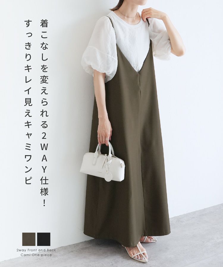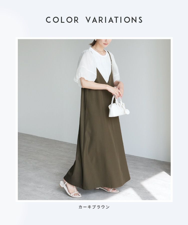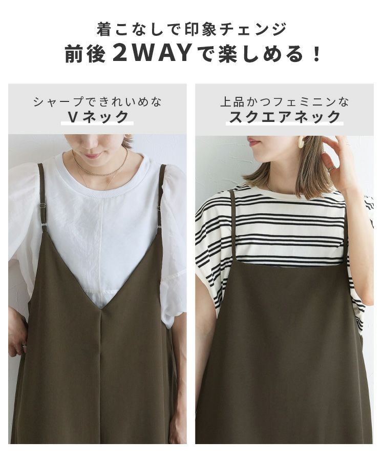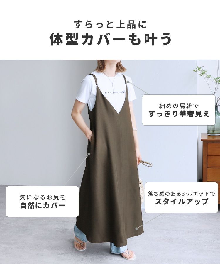 レディース トップス ワンピース キャミソール キャミワンピ キャミワンピース プルオーバー 無地 前後 2WAY Vネック ディープVネック スクエアネック アジャスター ロング丈 ロング マキシ丈 キレイめ きれカジ カジュアル シンプル 大人女子 30代ファッション 30代コーデ オールシーズン フレア フレアシルエット 体型カバー ポケット ブラック 黒 ブラウン カーキブラウン