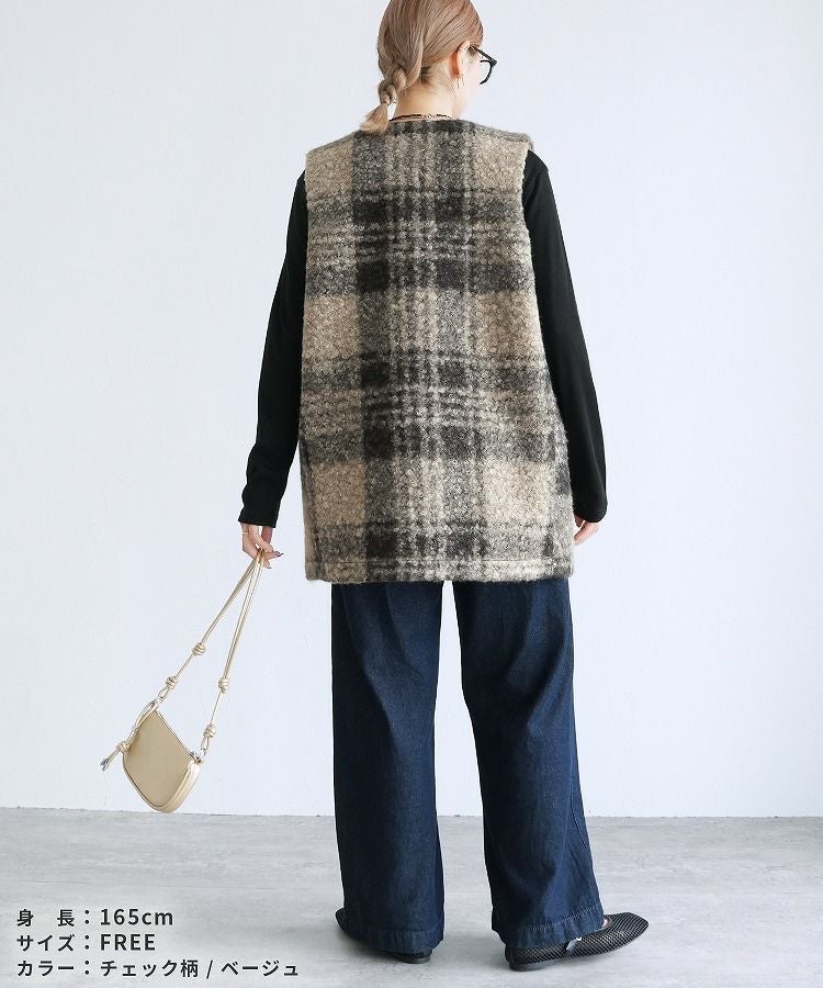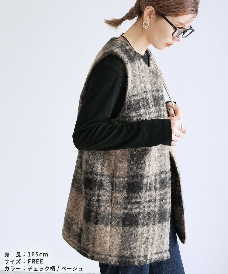 レディース トップス アウター ベスト ジレ 無地 チェック柄 ブークレ ブークレー 体型カバー スナップボタン ボタン仕様 ポケット付き ポケット ふわふわ ノースリーブ クルーネック 丸首 キレイめ カジュアル フォーマル シンプル 七五三 お祝い 入学式 大人女子 30代ファッション 30代コーデ ママ ママコーデ ホワイト エクリュ 白 チャコール グレー ベージュ
