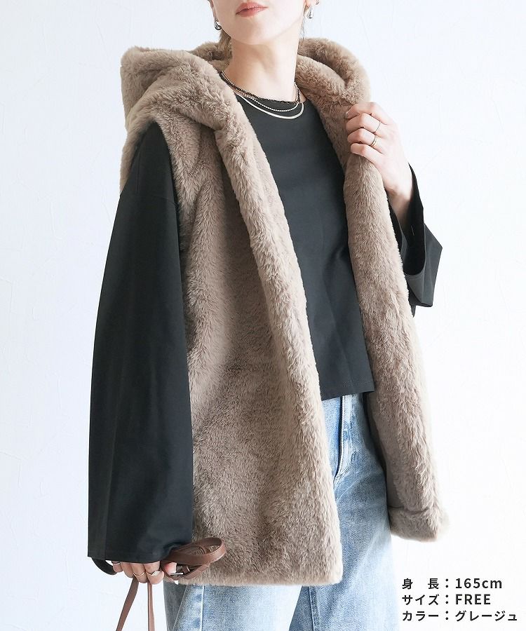レディース 2025年秋新作 アウター ベスト ファーベスト フード ファー ポケット もこもこ 暖かい カジュアル シンプル 楽ちん 秋 大人女子 30代ファッション 30代コーデ グレージュ グレー