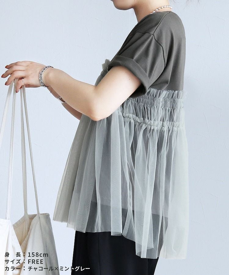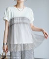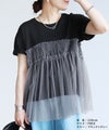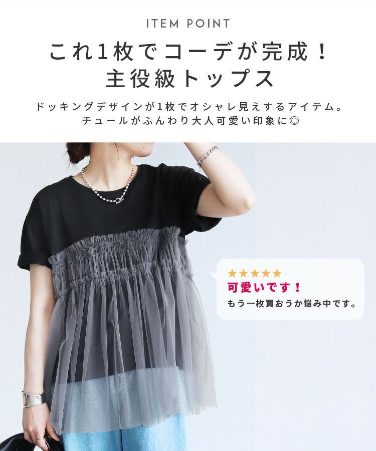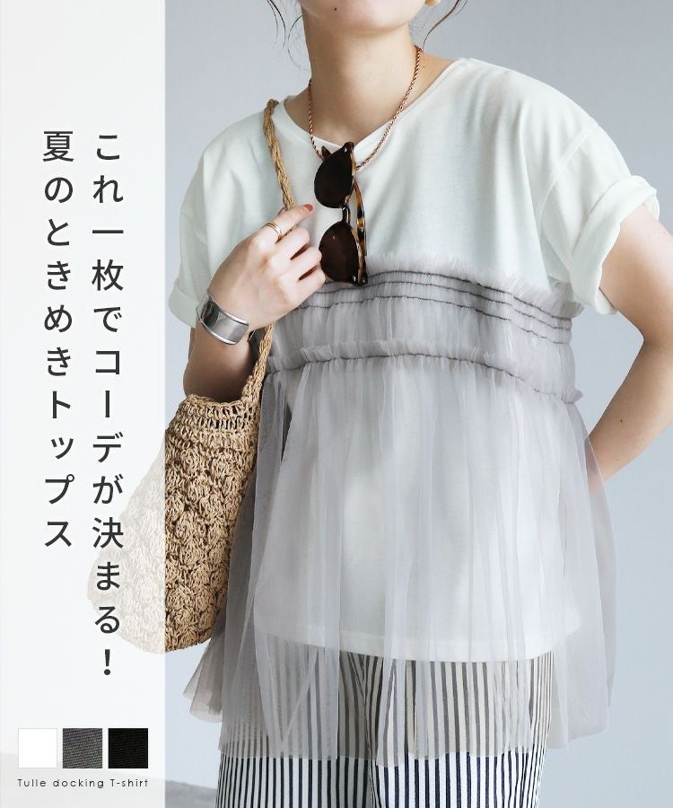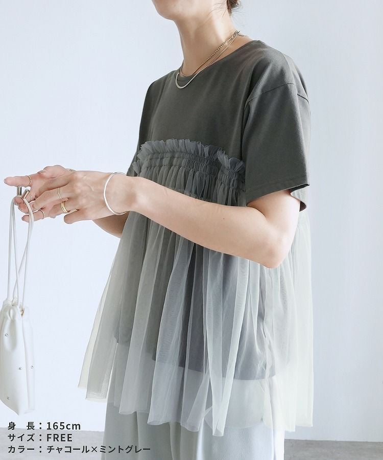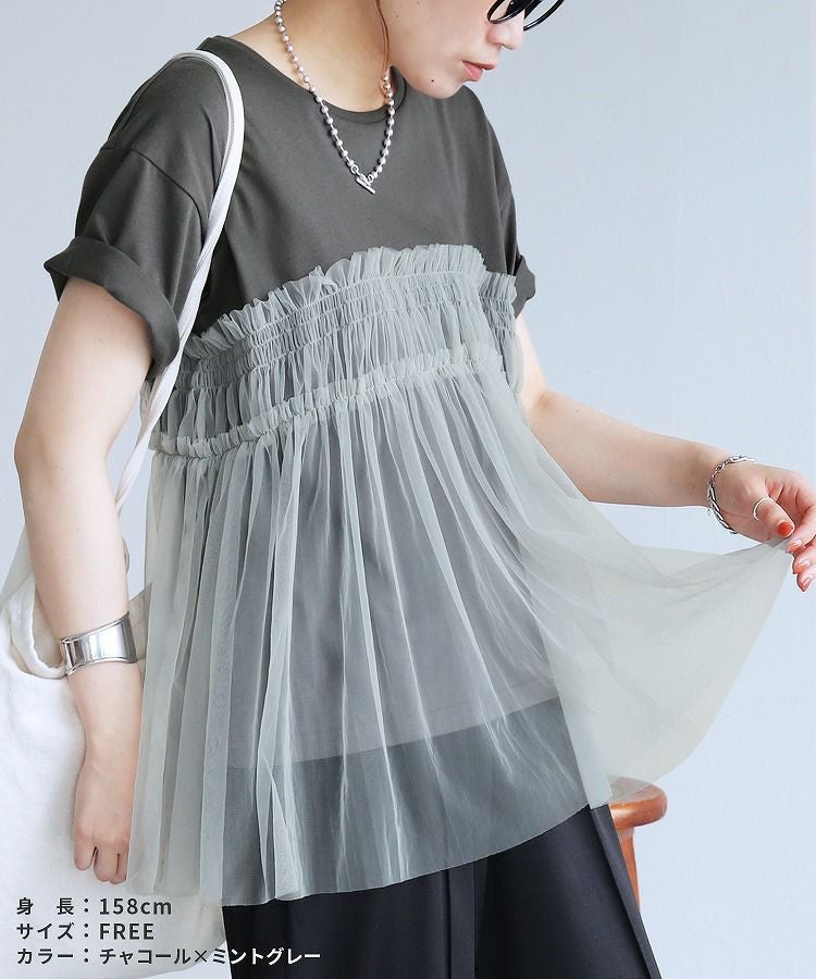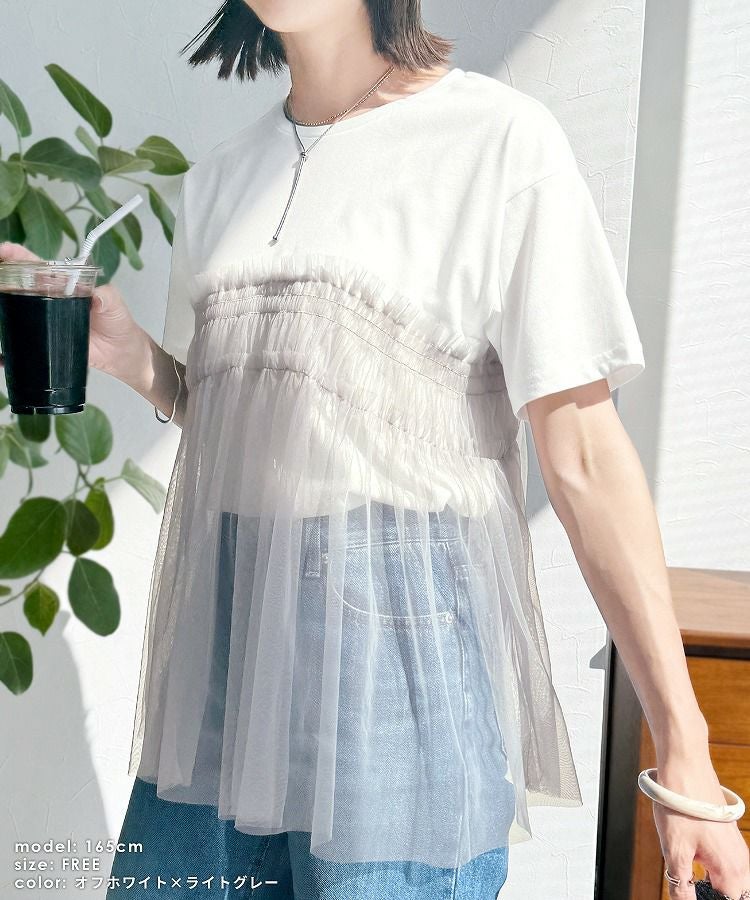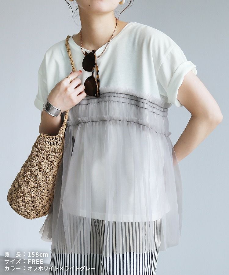 レディース トップス カットソー Tシャツ チュール ドッキング カジュアル シンプル 楽ちん 半袖 夏 トレンド 大人女子 30代ファッション 30代コーデ オフホワイト 白 ライトグレー チャコール ミントグレー ブラック 黒 グレー
