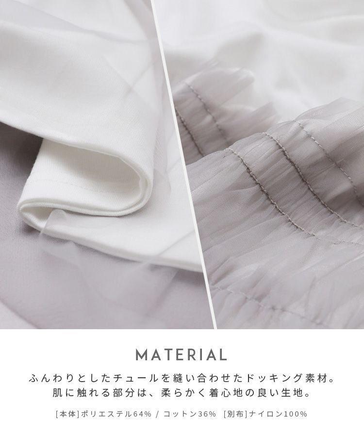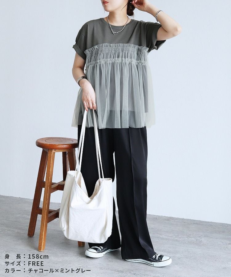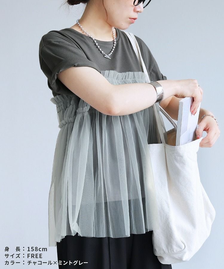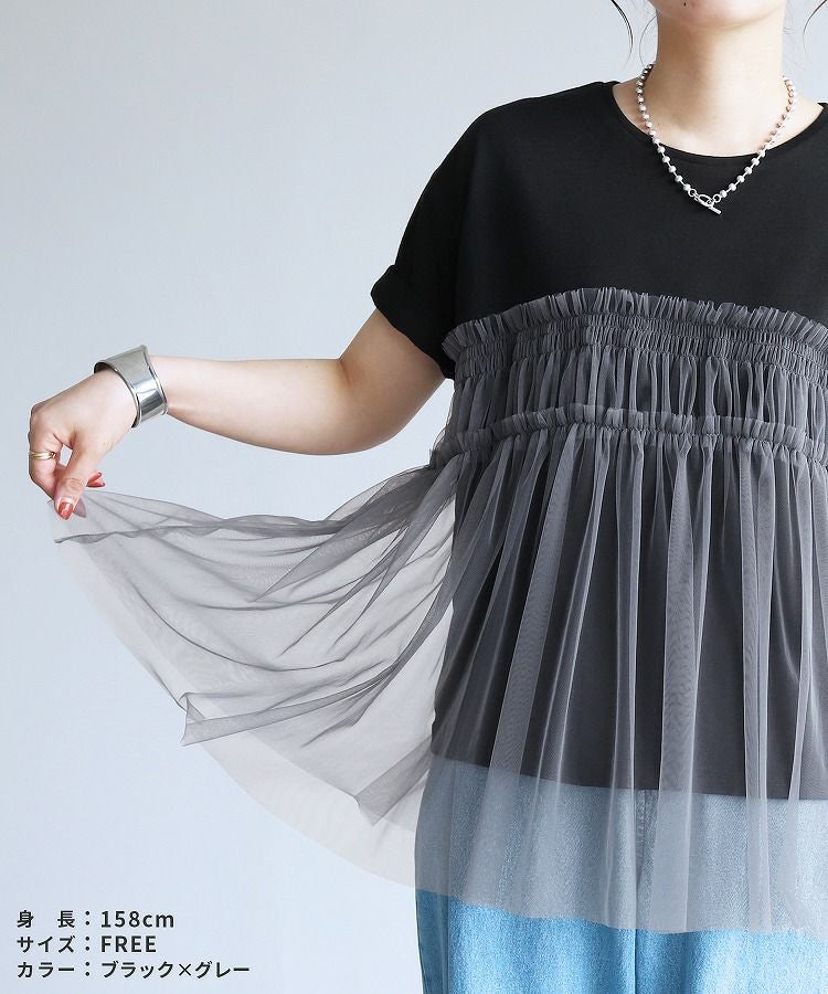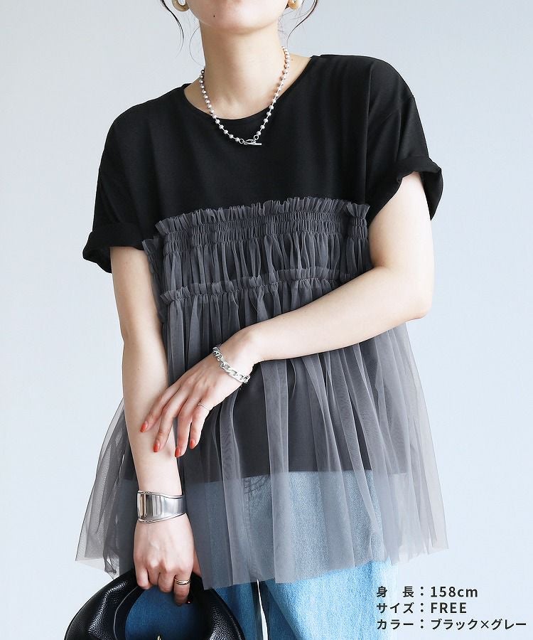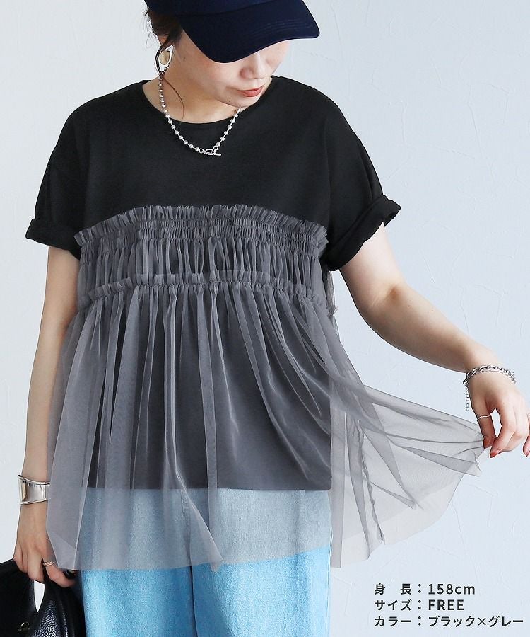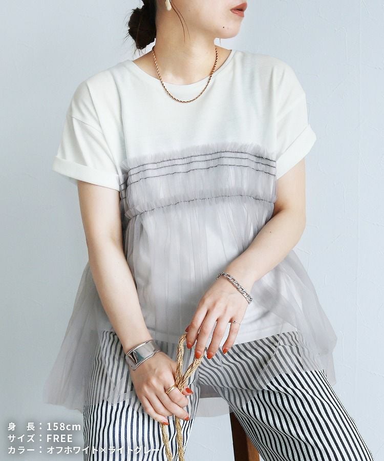 レディース トップス カットソー Tシャツ チュール ドッキング カジュアル シンプル 楽ちん 半袖 夏 トレンド 大人女子 30代ファッション 30代コーデ オフホワイト 白 ライトグレー チャコール ミントグレー ブラック 黒 グレー