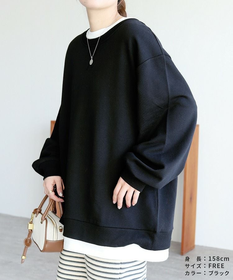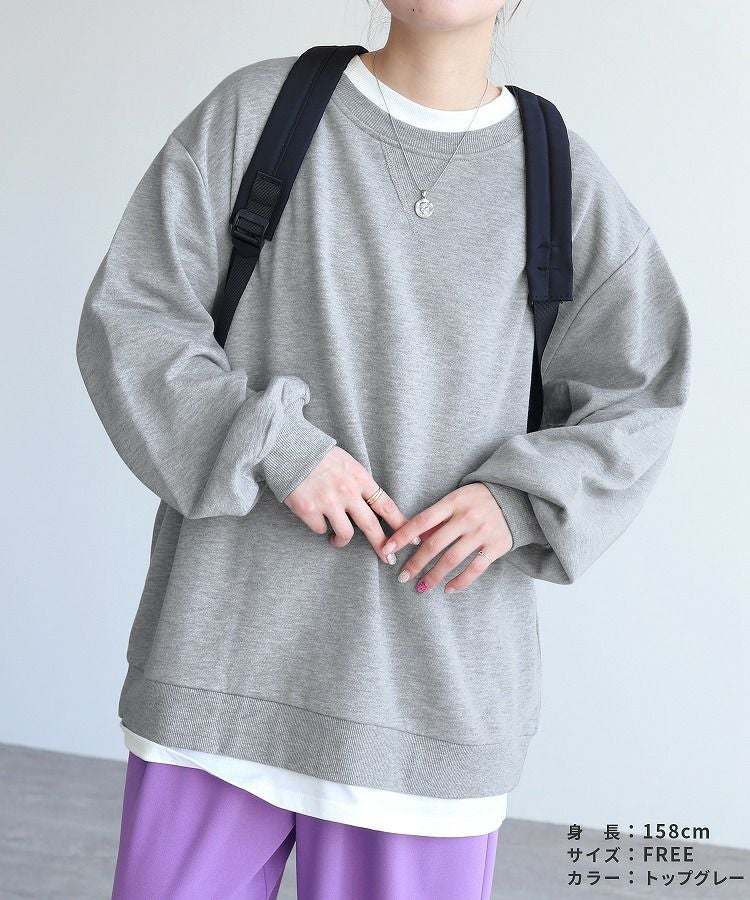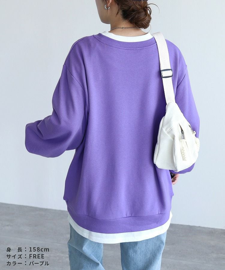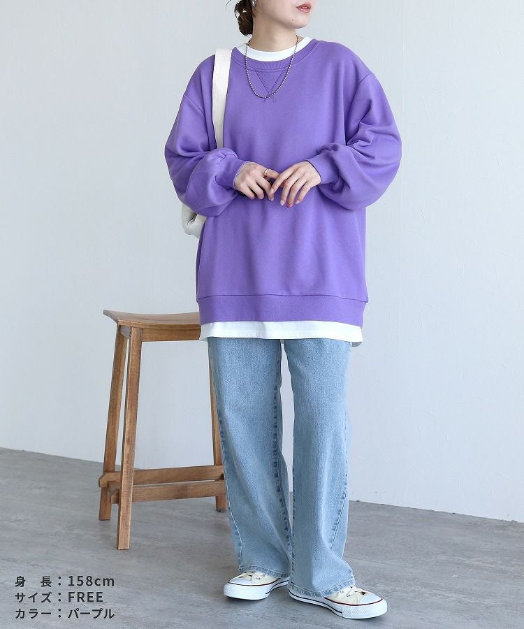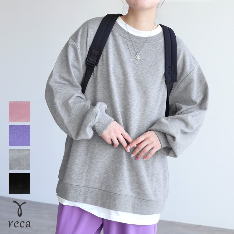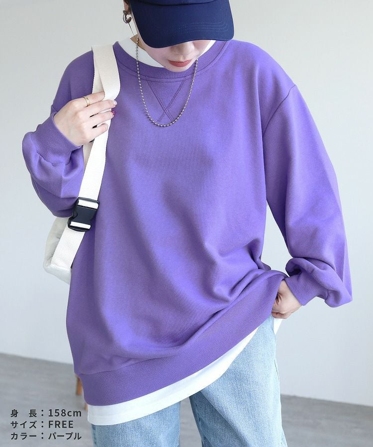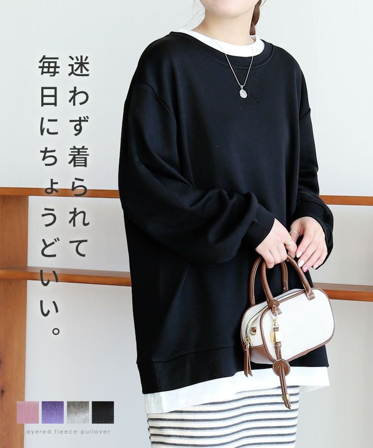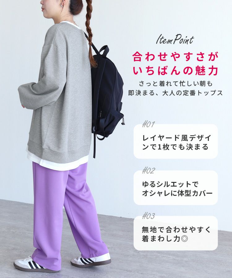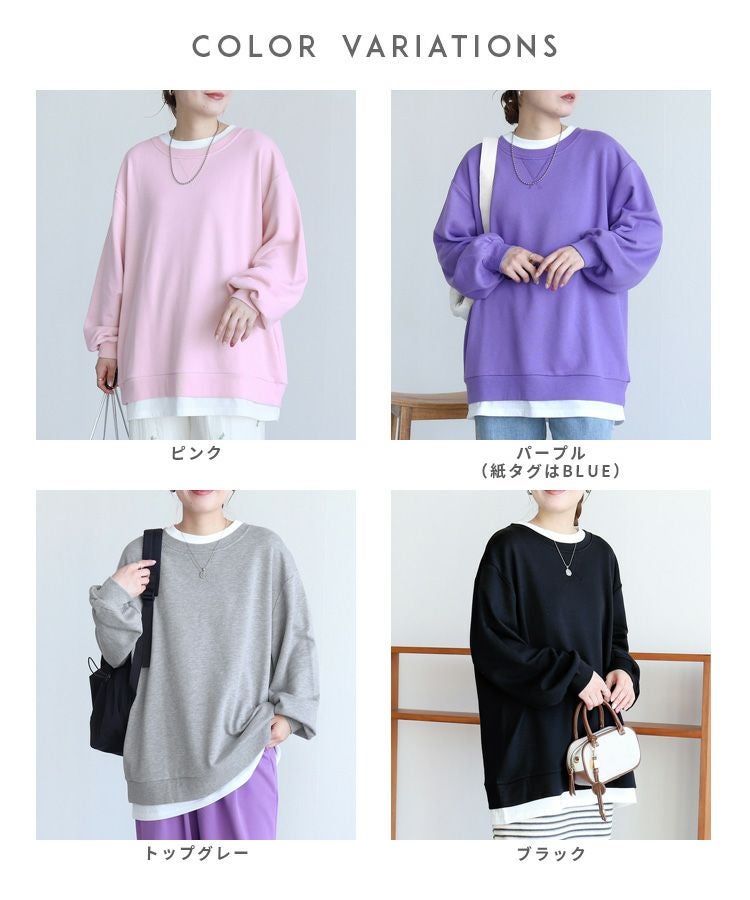 レディース シンプル カジュアル スウェット トレーナー プルオーバー トップス 長袖 重ね着 レイヤード風 楽ちん ゆったり 着回し 春 秋 大人女子 30代ファッション 30代コーデ 40代コーデ ママ 母 ママコーデ 黒 ブラック グレー ピンク パープル