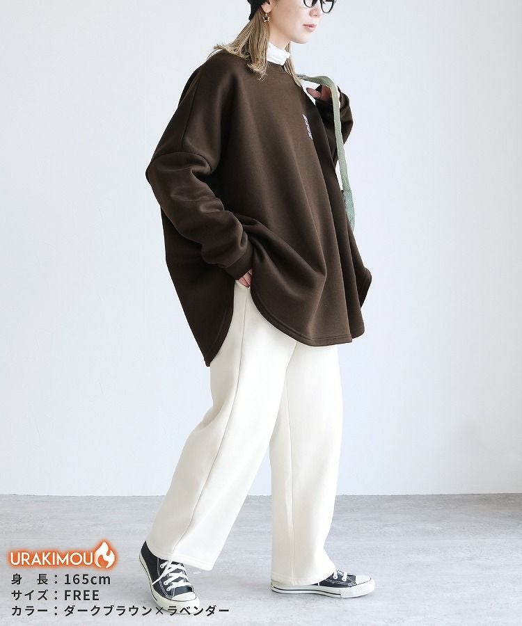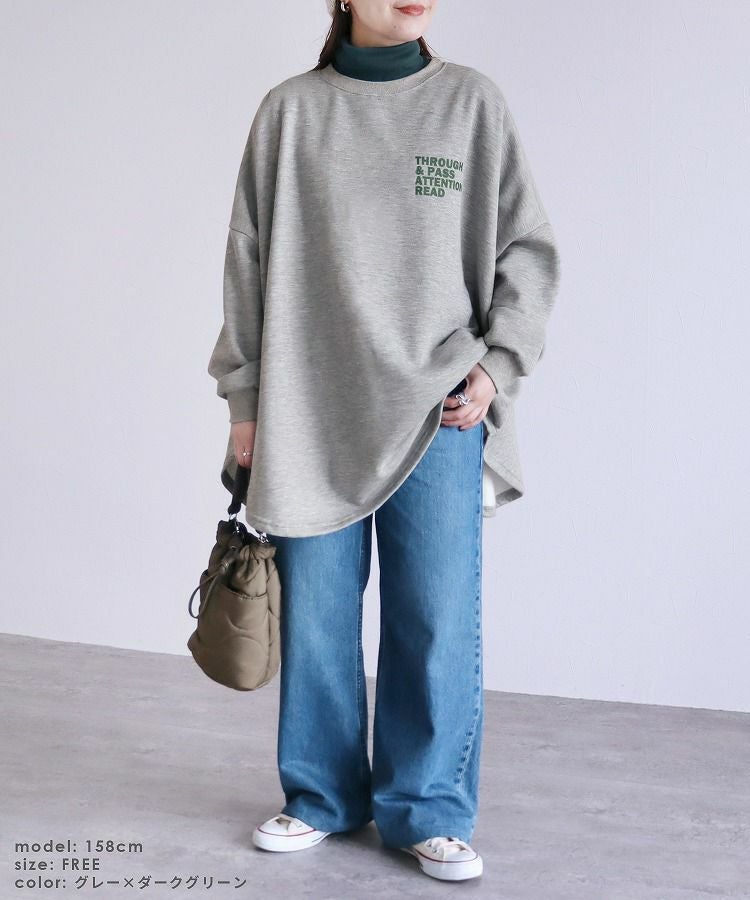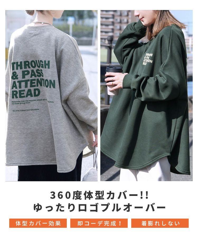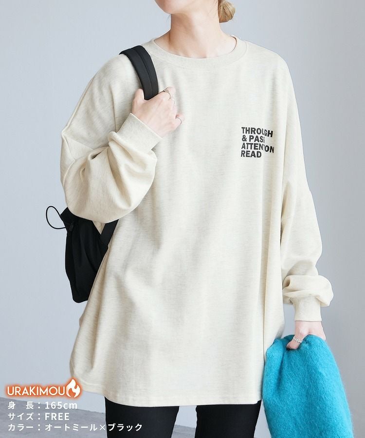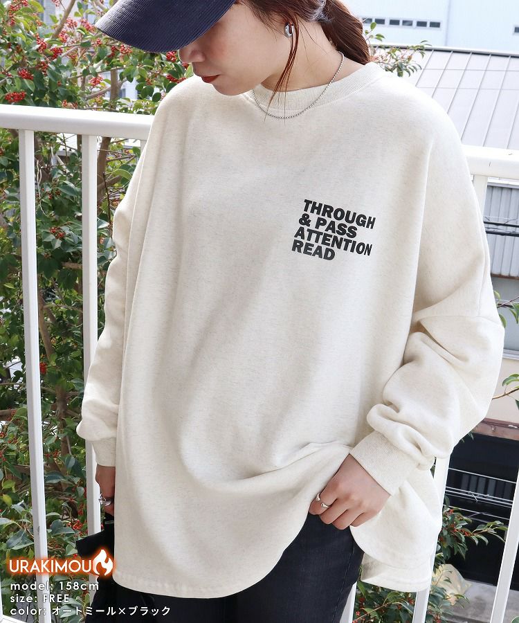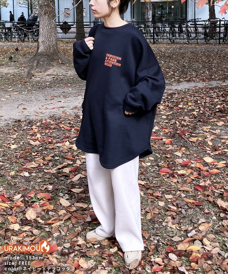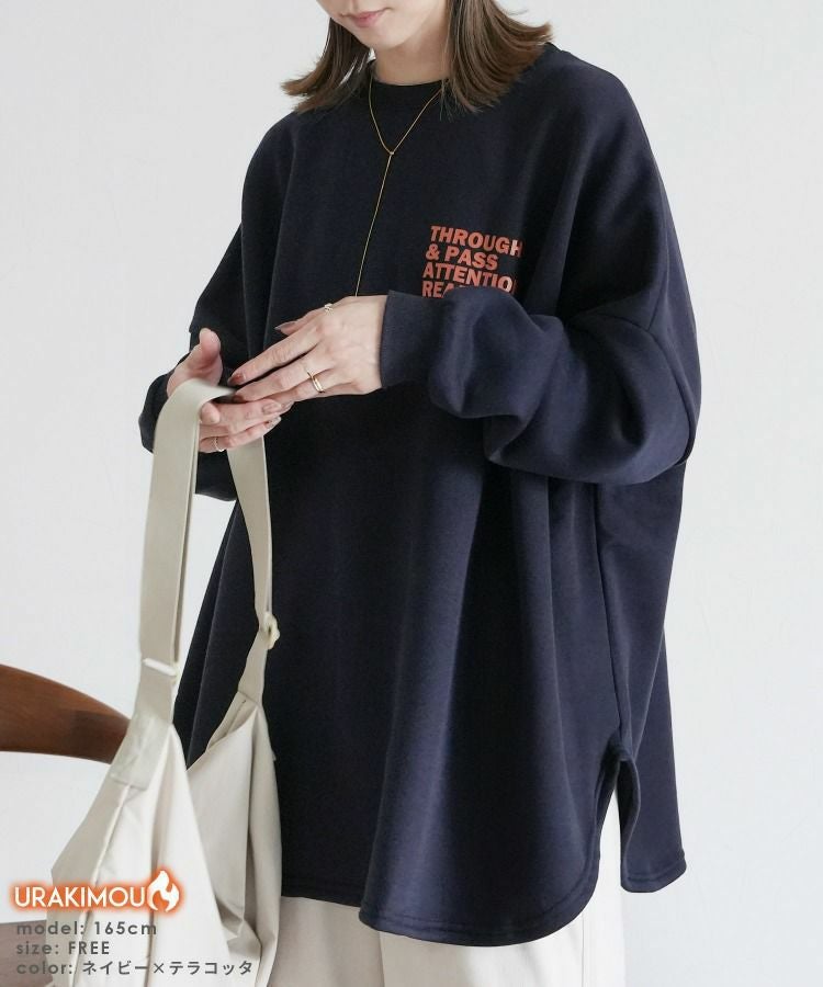 レディース トップス 裏起毛 長袖 スウェット トレーナー プルオーバー チュニック オーバーサイズ ビッグシルエット ロゴ 体型カバー 大きめ ゆったり 防寒 防寒対策 暖かい 楽ちん カジュアル 秋 冬 大人女子 30代ファッション 30代コーデ オートミール 白 ホワイト ネイビー 紺 グレー 灰色