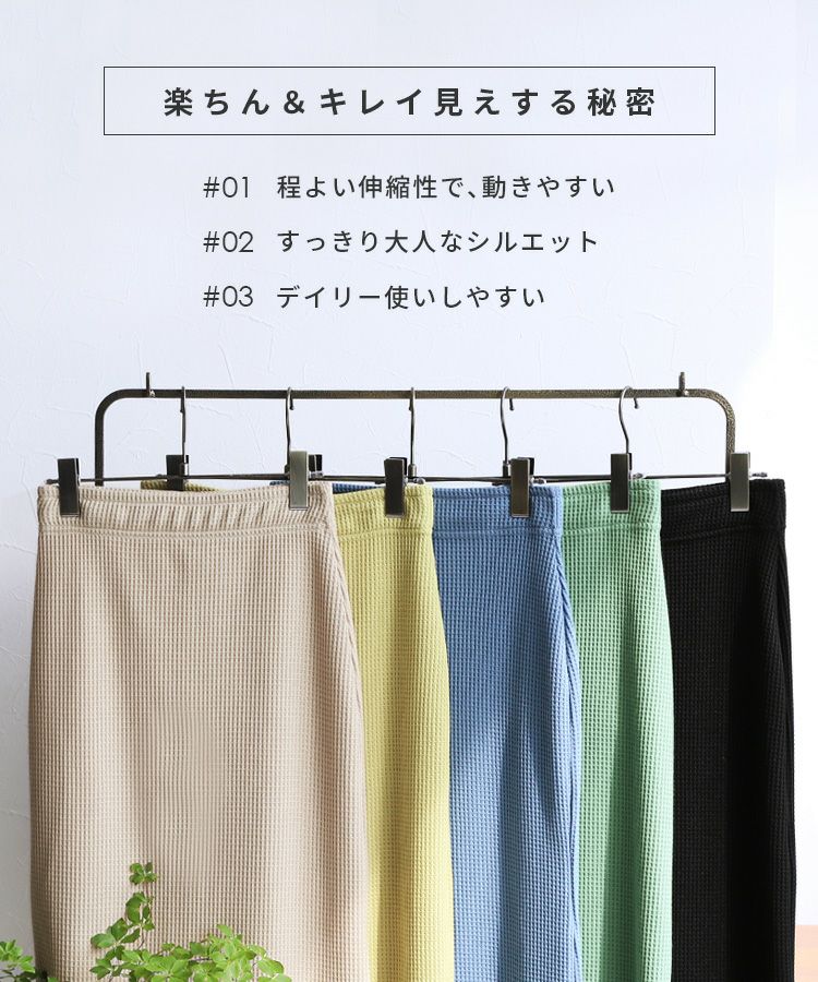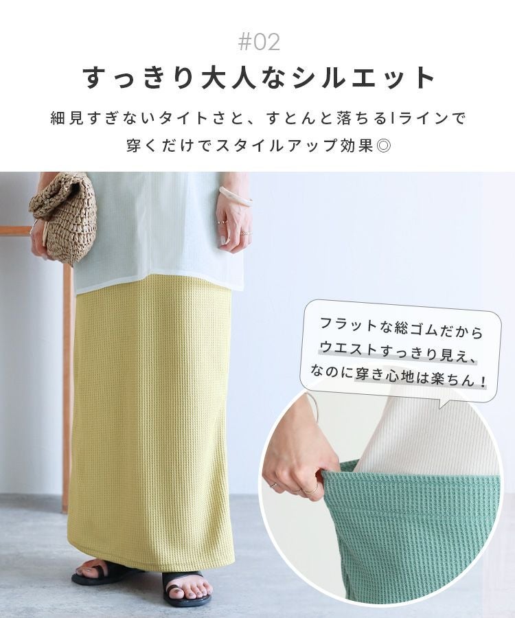 レディース ロングスカート タイトスカート スカート レディース ボトムス ワッフル ウエストゴム ストレッチ バックスリット ロング丈 マキシ丈 キレイめ カジュアル キレカジ シンプル 大人女子 30代ファッション 30代コーデ プリント ベージュ イエローグリーン イエロー 黄 ブラック 黒 ブルー スモークブルー グリーン セットアップ可