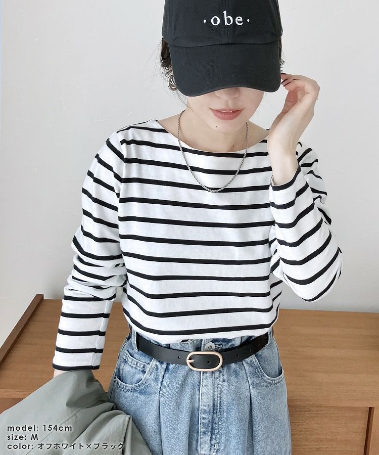 レディース ボーダー カットソー Tシャツ プルオーバー トップス 薄手 長袖 着回し 楽ちん カジュアル シンプル コンパクト ジャストサイズ Mサイズ Lサイズ コットン100% 綿 秋服 春服 女性 オフホワイト 白 ブラック 黒