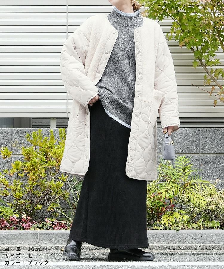 コーデアイテム: ノーカラーボア×ひょうたんキルトコート /配色ハイネックニット