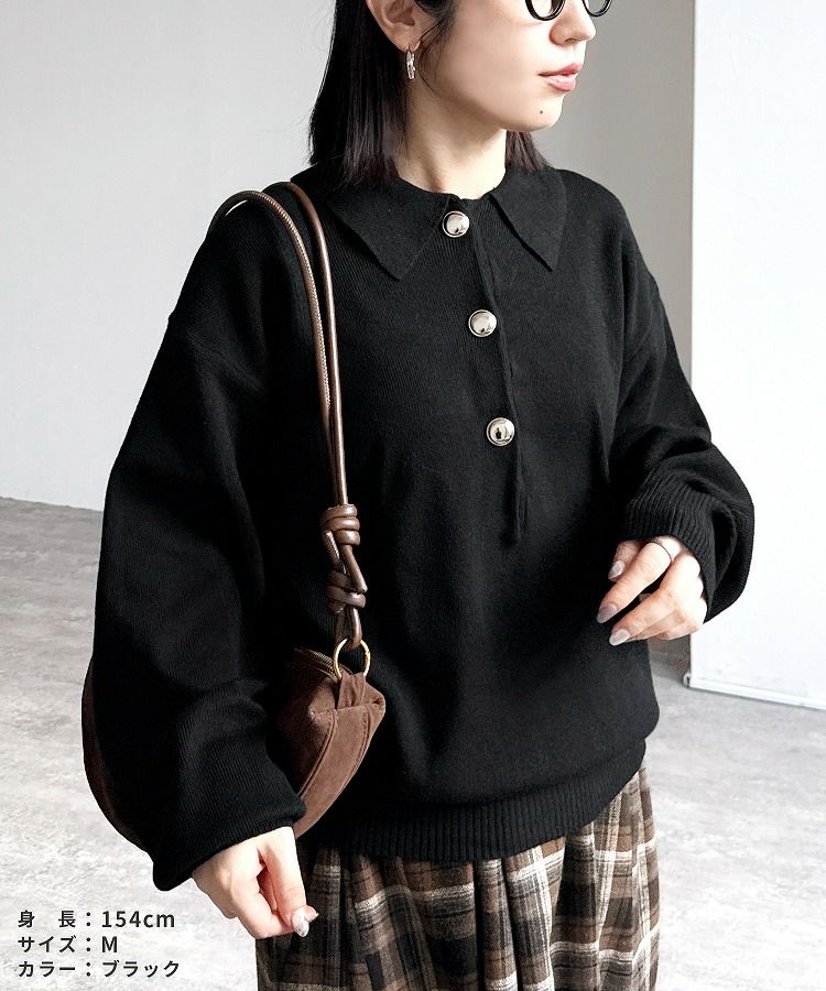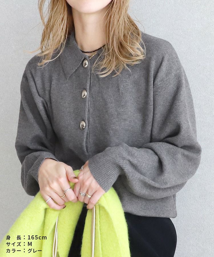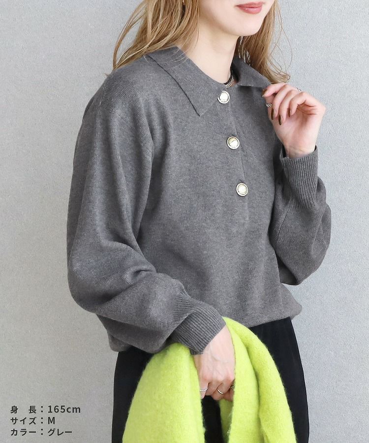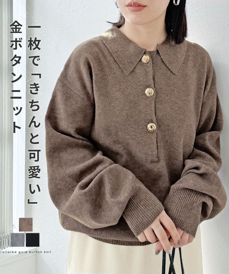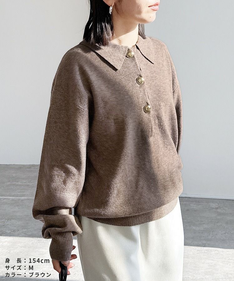 レディース トップス ニット セーター 長袖 襟付き 襟付きニット 釦 ボリューム袖 たぽん袖 ローゲージニット キレイめ カジュアル シンプル 大人女子 30代ファッション 30代コーデ ブラウン ブラック グレー ゴールド釦