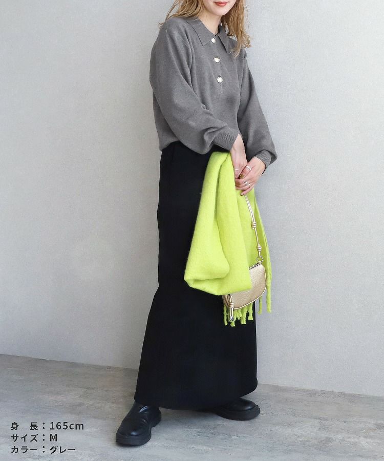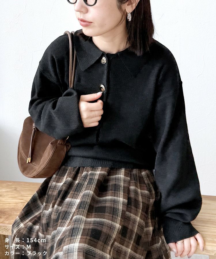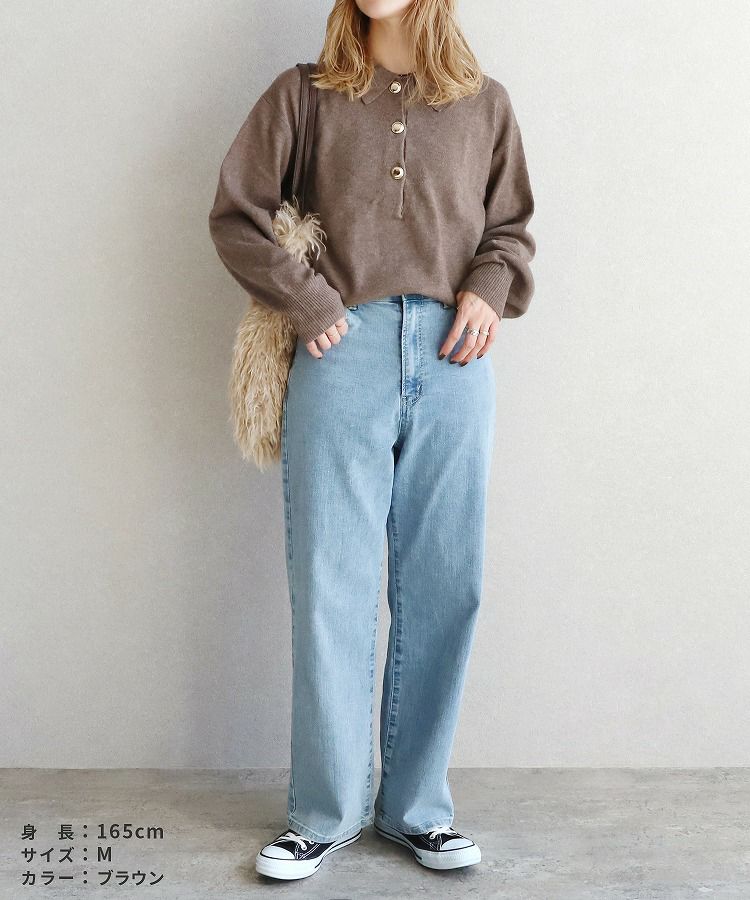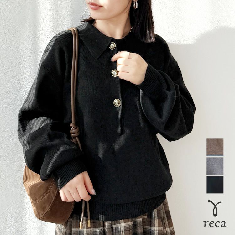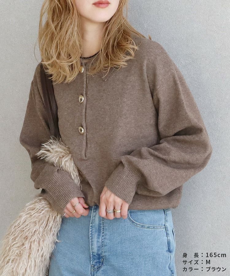 レディース トップス ニット セーター 長袖 襟付き 襟付きニット 釦 ボリューム袖 たぽん袖 ローゲージニット キレイめ カジュアル シンプル 大人女子 30代ファッション 30代コーデ ブラウン ブラック グレー ゴールド釦