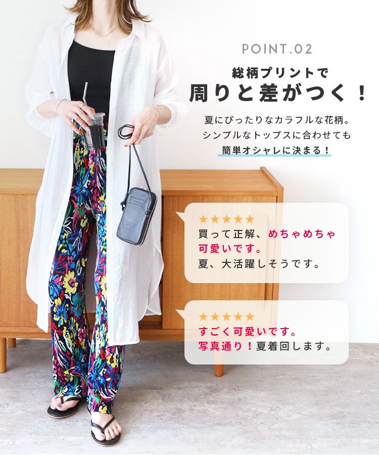 レディース ボトムス ロング ウエストゴム 楽ちん 柄パンツ 総柄 花柄 デザインパンツ リラックスパンツ イージーパンツ カジュアル 華やか リゾート ビーチ 夏 大人女子 30代ファッション 30代コーデ ママコーデ トレンドコーデ カラフル ネイビー アイボリー