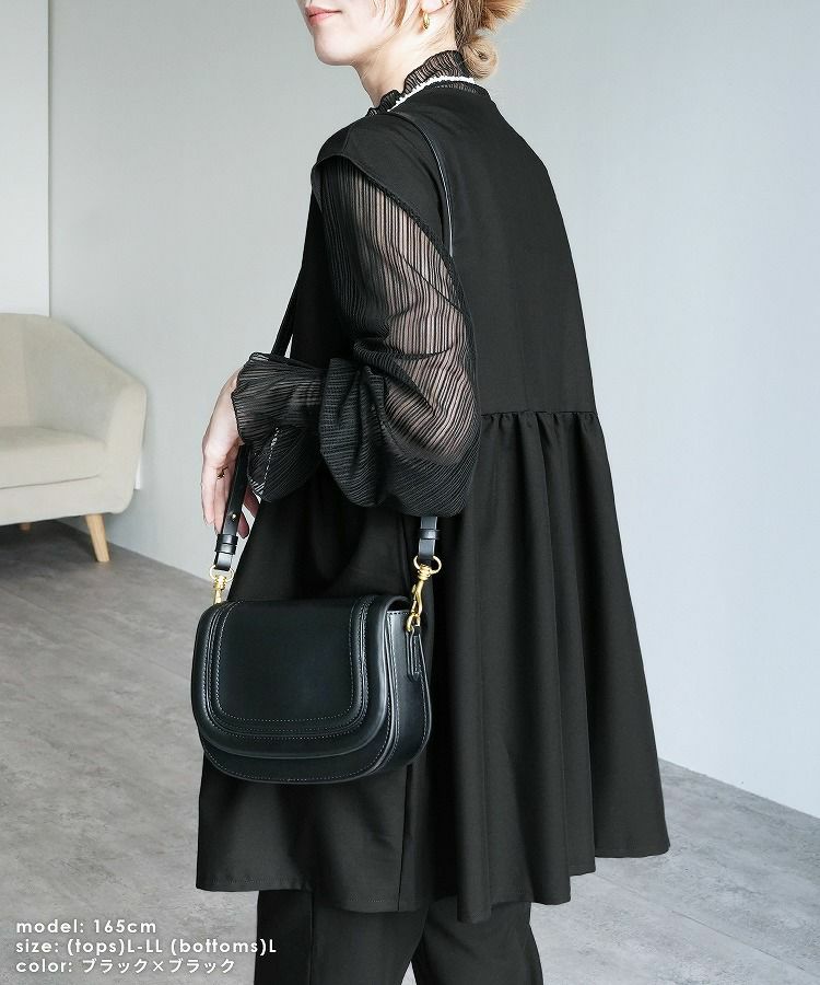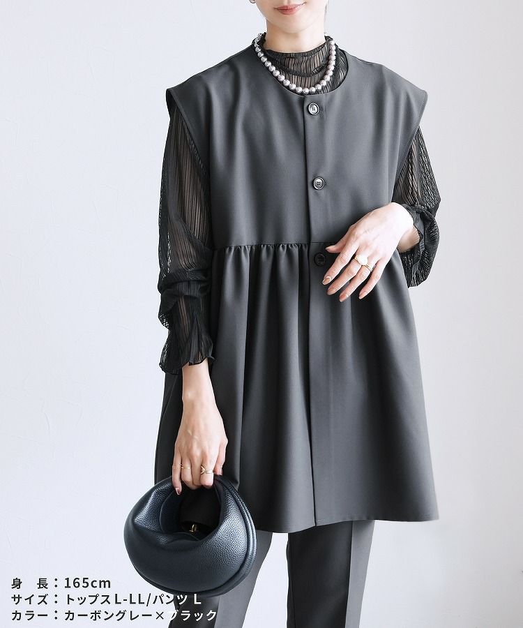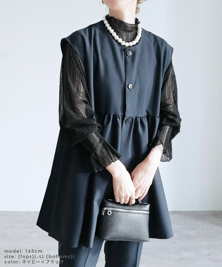 レディース セットアップ セレモニースーツ パンツスーツ ペプラムギャザーベスト ジレ テーパードパンツ トップス 薄手 レイヤード カットソー シアー ストライプ 透け感 無地 フレアスリーブ キャンディ袖 タック 長袖 ボトルネック カジュアル シンプル 楽ちん オケージョン 卒業式 入学式 卒園式 服装 母親 ママ おしゃれ 春 大人女子 30代ファッション 30代コーデ ネイビー グレージュ ブラック