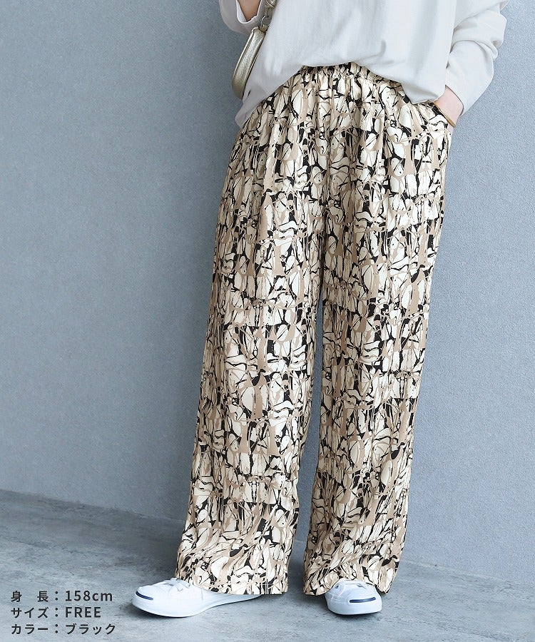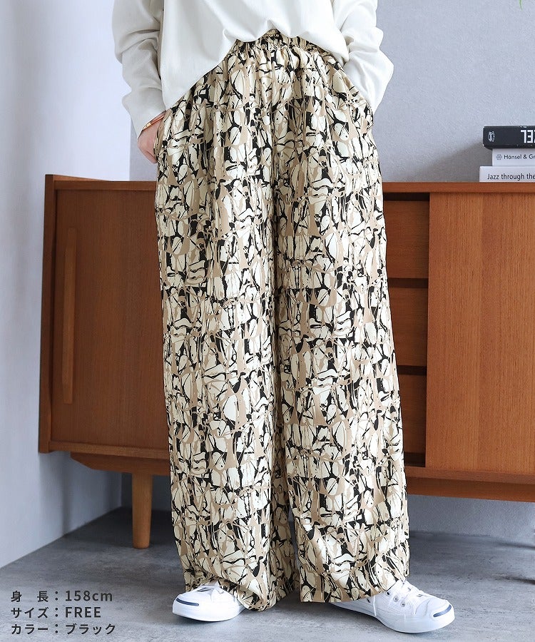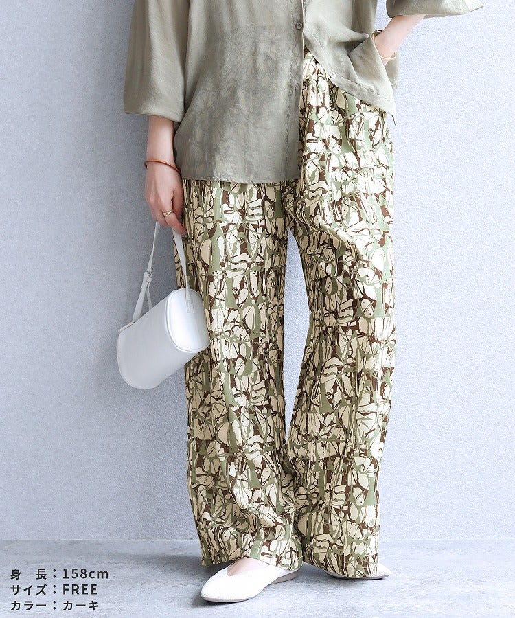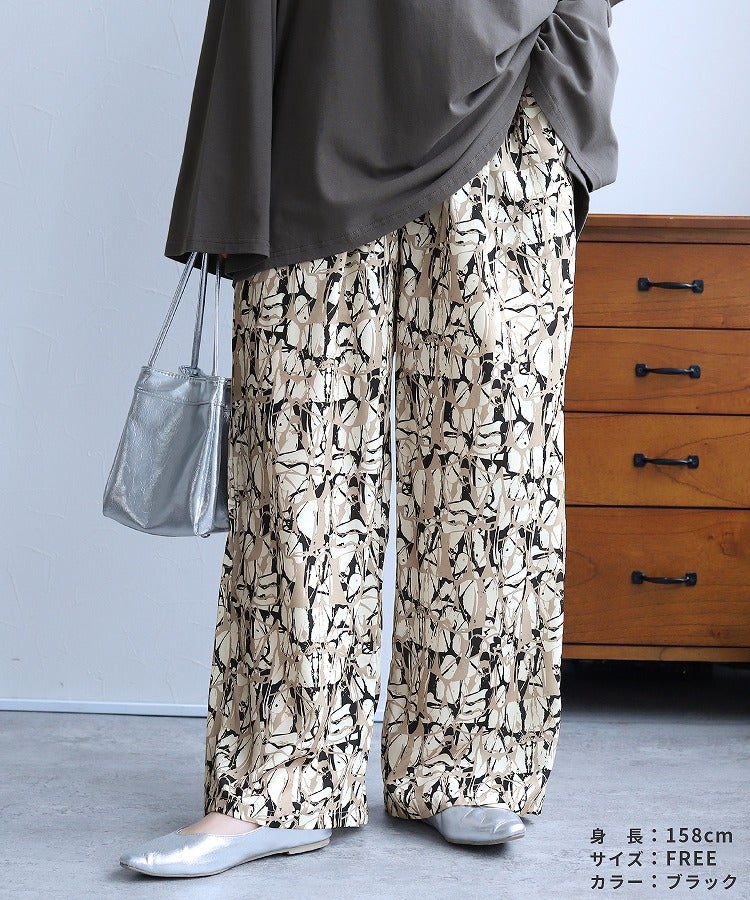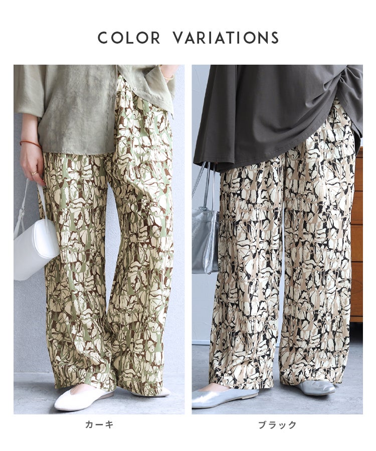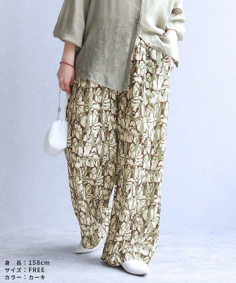 レディース パンツ ボトムス ワイド ワイド幅 ワイドパンツ イージーパンツ ロング丈 ロング プリント ペイント柄 アンティーク 総柄 ルーズ リラクシー ウエストゴム ウエスト紐 ウエスト調整 ポケット付き 小物収納 機能性 体型カバー 裏地 裏地付き 軽やか シアー 透け感 カジュアル シンプル キレカジ ナチュラル 大人女子 30代ファッション 30代コーデ ポリエステル キナリ カーキ ブラック 黒 くすみカラー
