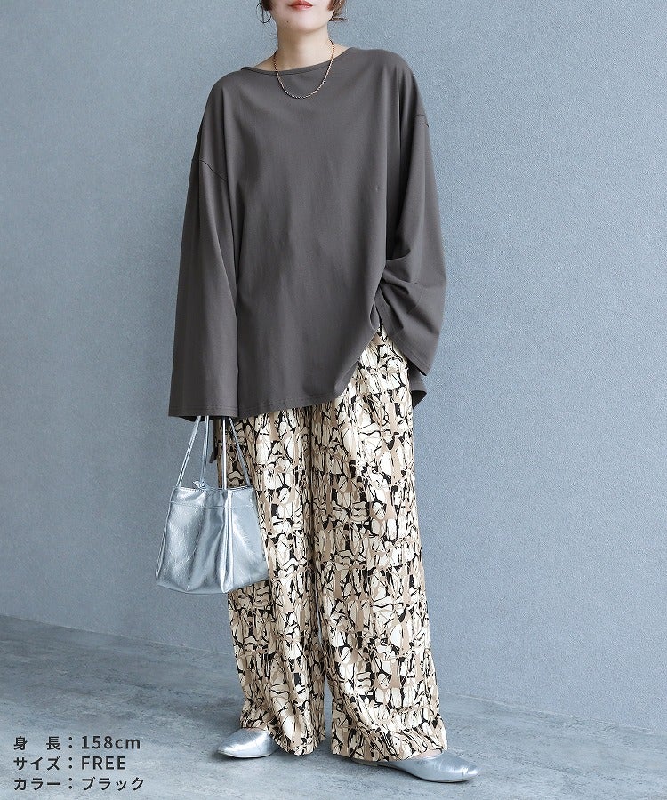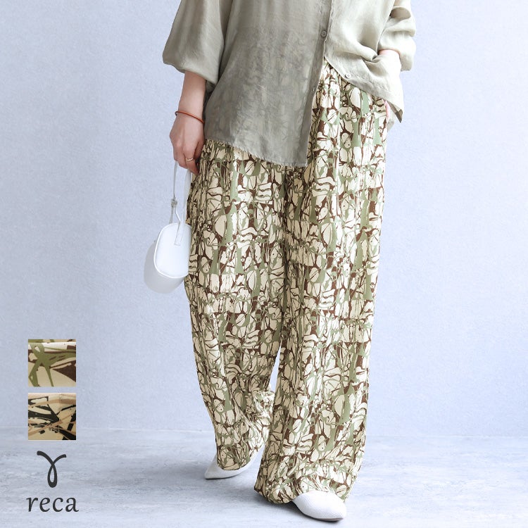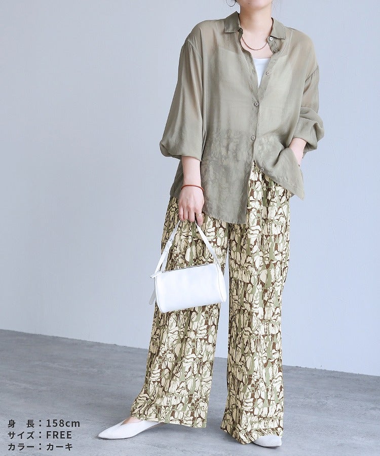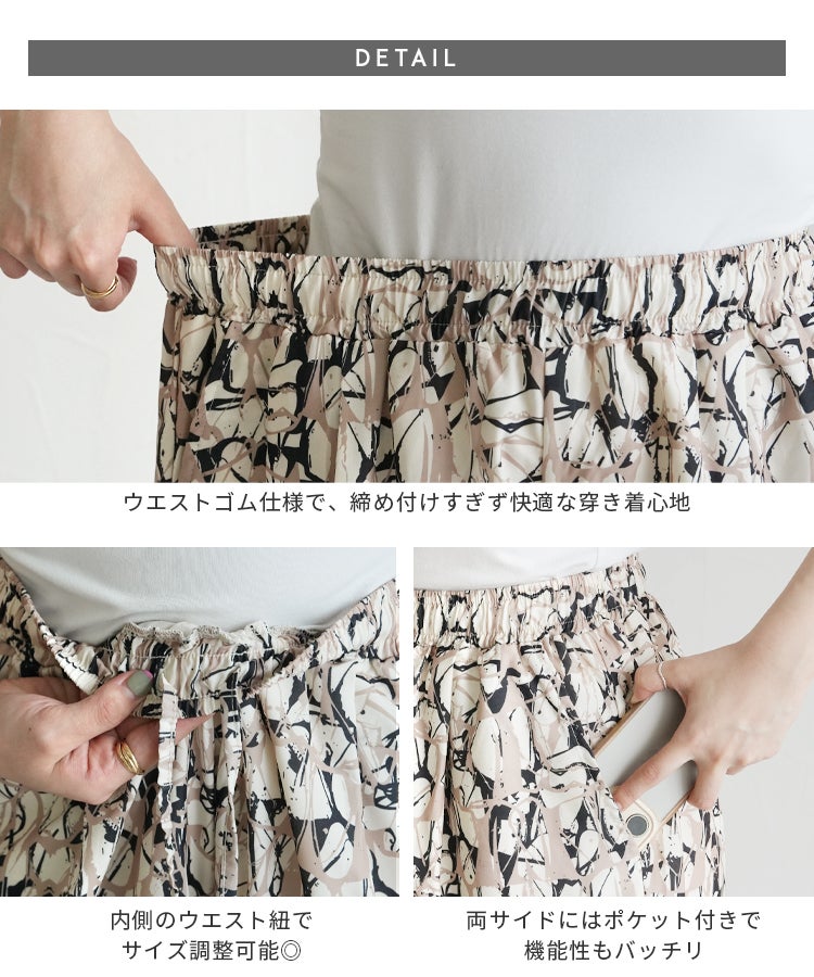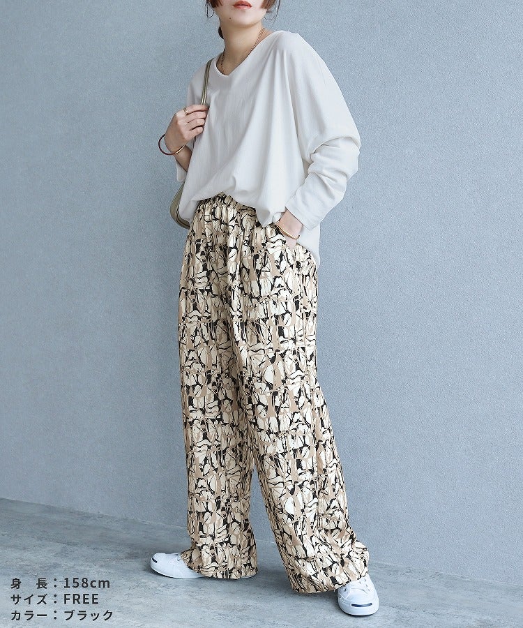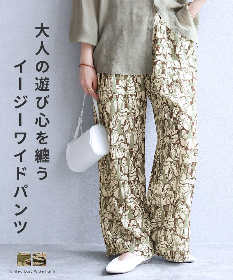 レディース パンツ ボトムス ワイド ワイド幅 ワイドパンツ イージーパンツ ロング丈 ロング プリント ペイント柄 アンティーク 総柄 ルーズ リラクシー ウエストゴム ウエスト紐 ウエスト調整 ポケット付き 小物収納 機能性 体型カバー 裏地 裏地付き 軽やか シアー 透け感 カジュアル シンプル キレカジ ナチュラル 大人女子 30代ファッション 30代コーデ ポリエステル キナリ カーキ ブラック 黒 くすみカラー
