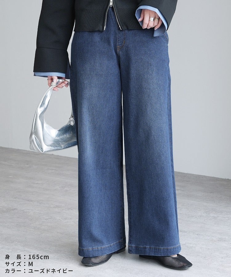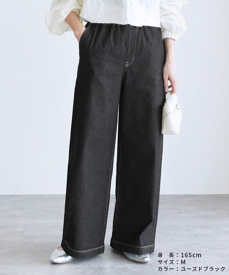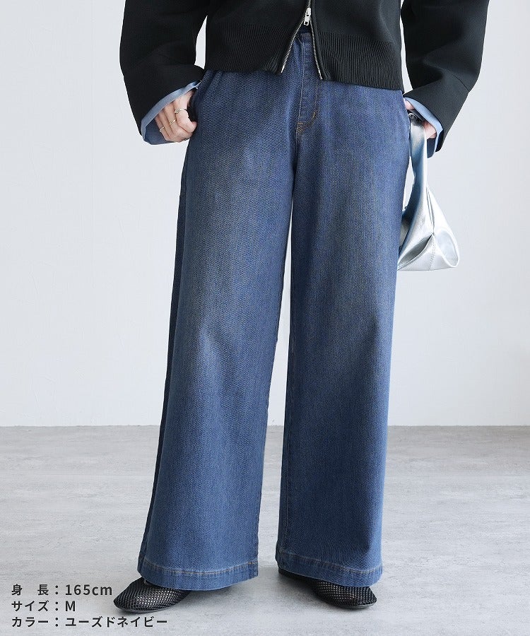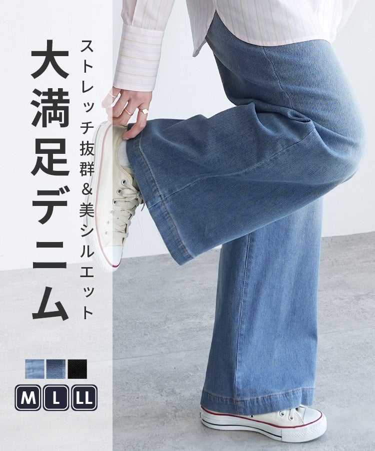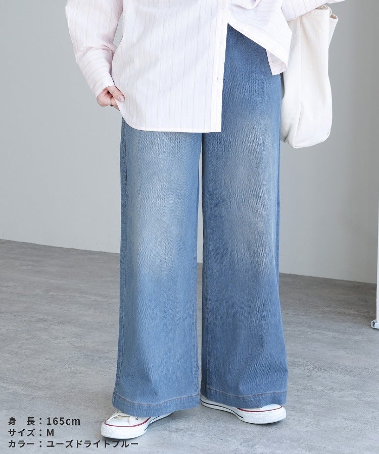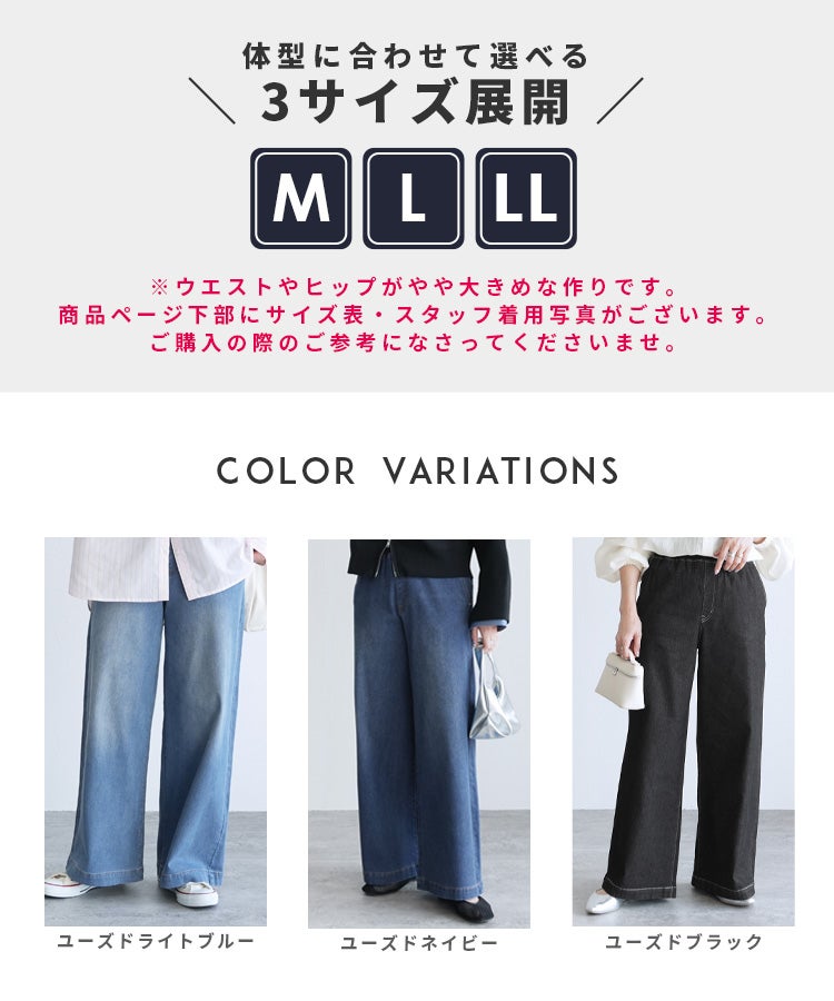 レディース ボトムス パンツ デニム デニムパンツ ワイドパンツ ワイドデニム ストレッチパンツ 薄色デニム ジーンズ ジーパン ウエストゴム バッグゴム 柔らかい ストレッチ 伸縮性 薄手 ポケット シンプル カジュアル 大人女子 30代ファッション 30代コーデ コットン 綿 ブルー ネイビー 紺色 ブラック ステッチ オールシーズン M L LL 大きいサイズ ゆったり 楽ちん 履きやすい 伸びる 通気性