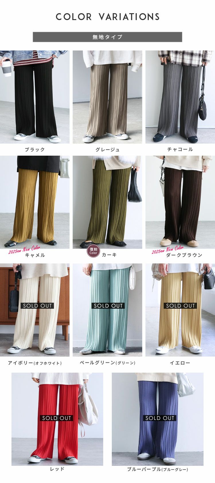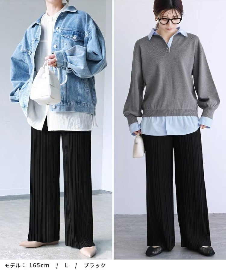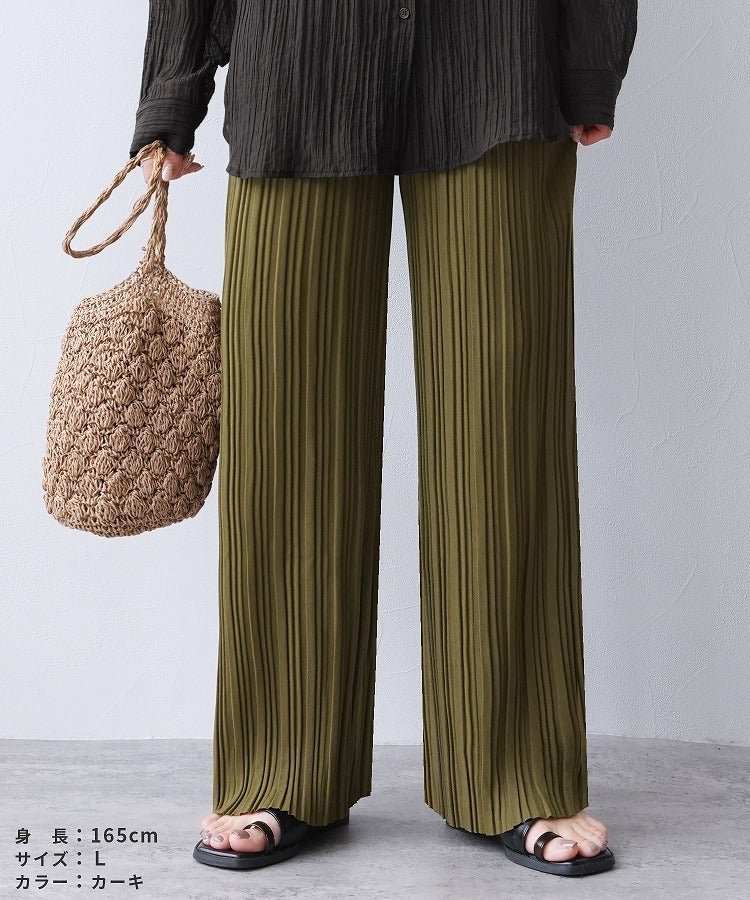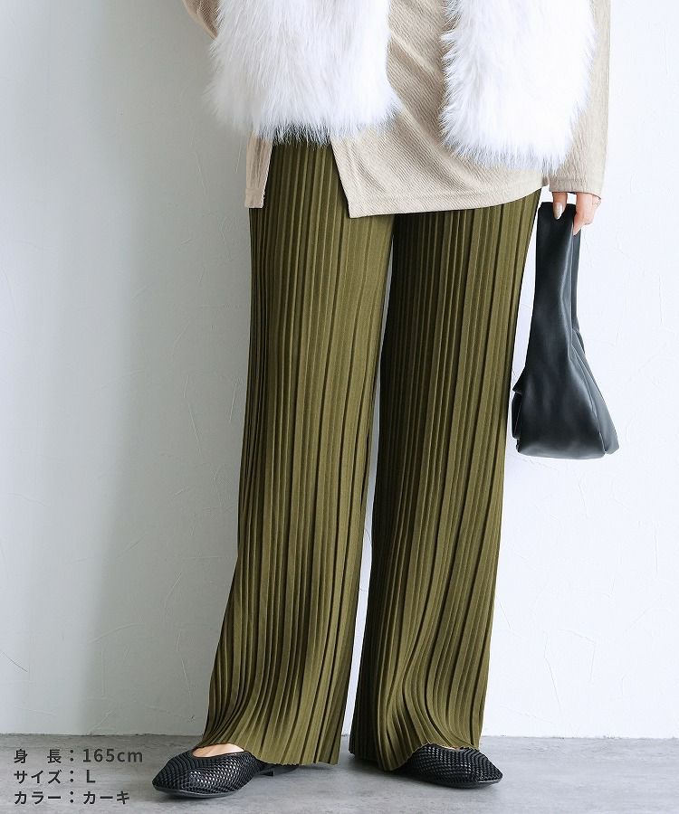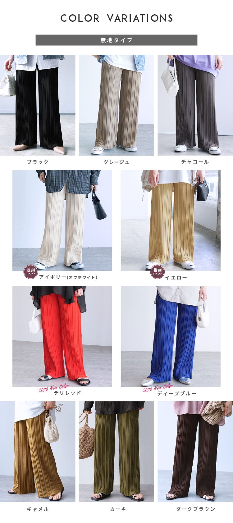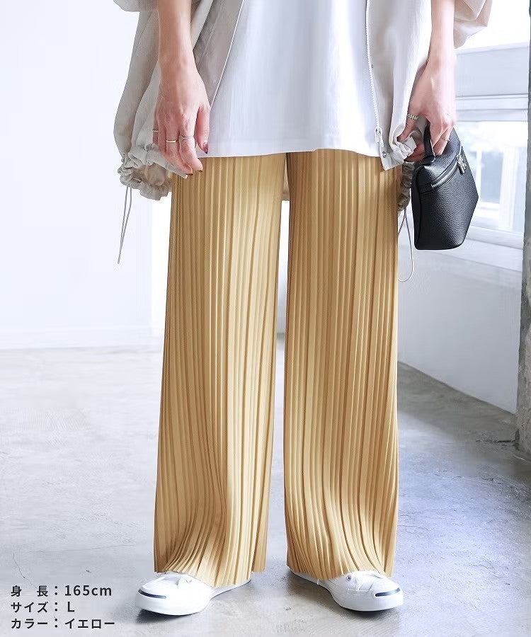 レディース ボトムス ロング ウエストゴム 楽ちん イージーパンツ 無地 プリーツ ランダムプリーツ リラックスパンツ キレイめ カジュアル 高見え 華やか 秋 大人女子 30代ファッション 30代コーデ ママコーデ トレンドコーデ くすみカラー スモーキーピンク グレージュ イエロー ライトグリーン ブラック 黒