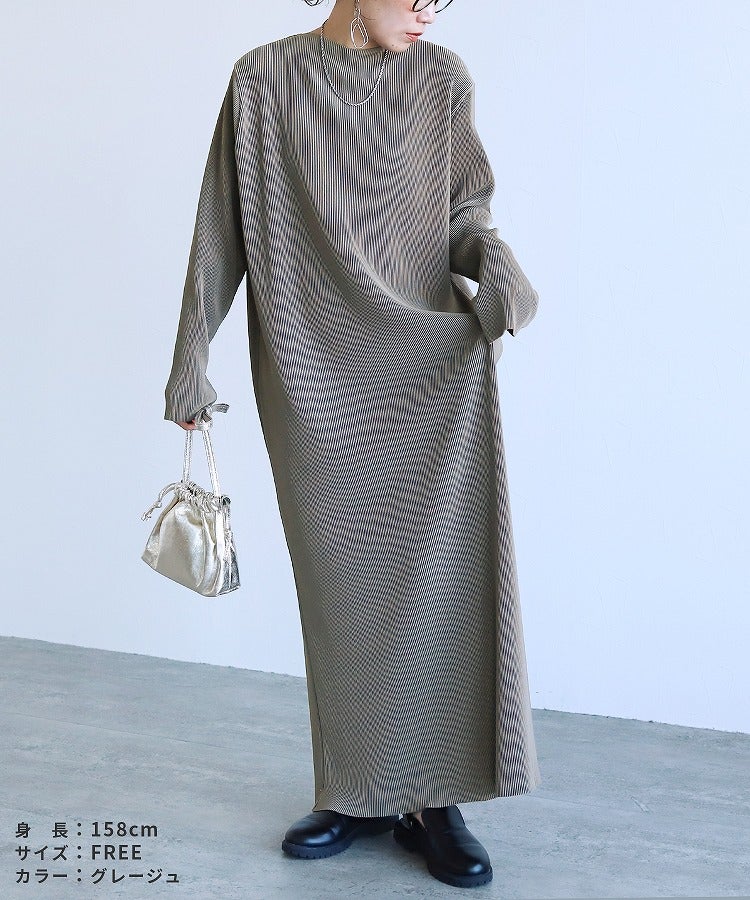 レディース ワンピース ロング マキシ プルオーバー セルフカット カットオフ プリーツ アコーディオンプリーツ ゆったり 長袖 クルーネック 丸首 アイロン要らず キレイめ キレカジ カジュアル ワンマイルウェア イージーケア 楽ちん 妊婦 マタニティ 時短 落ち感 シンプル 大人女子 30代ファッション 30代コーデ 無地 グレージュ グレーダークベージュ ブラック 黒 くすみカラー