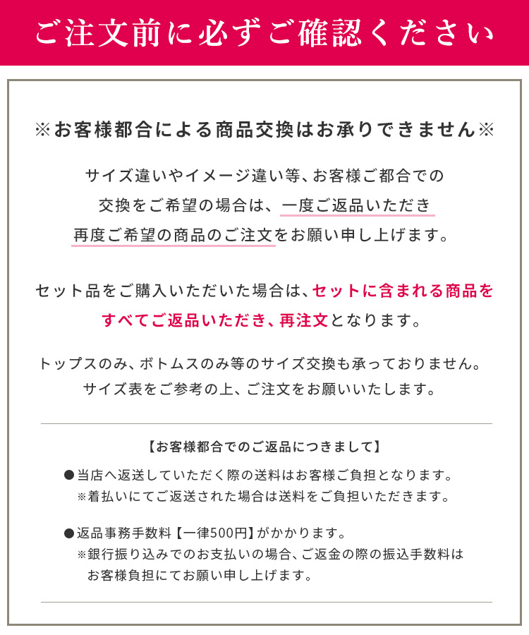 不良・商品間違い等以外のご返品は『お客様都合』にてお受けいたします。ご返送前に必ず弊社までメールまたはお電話にてお知らせください。