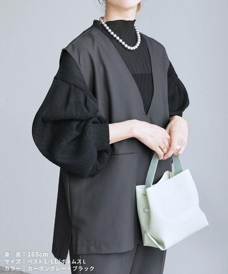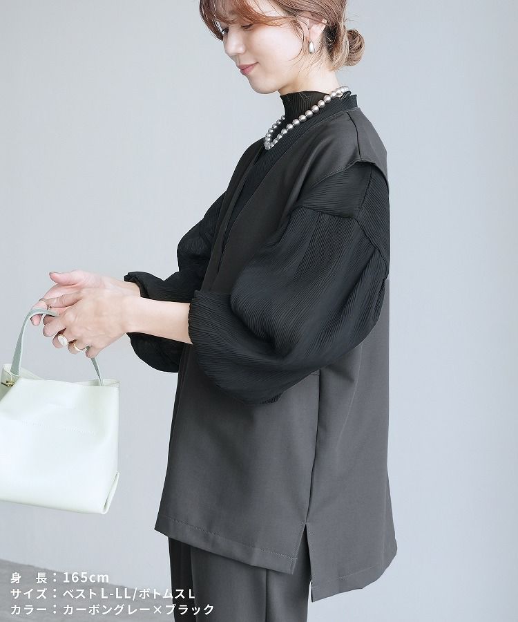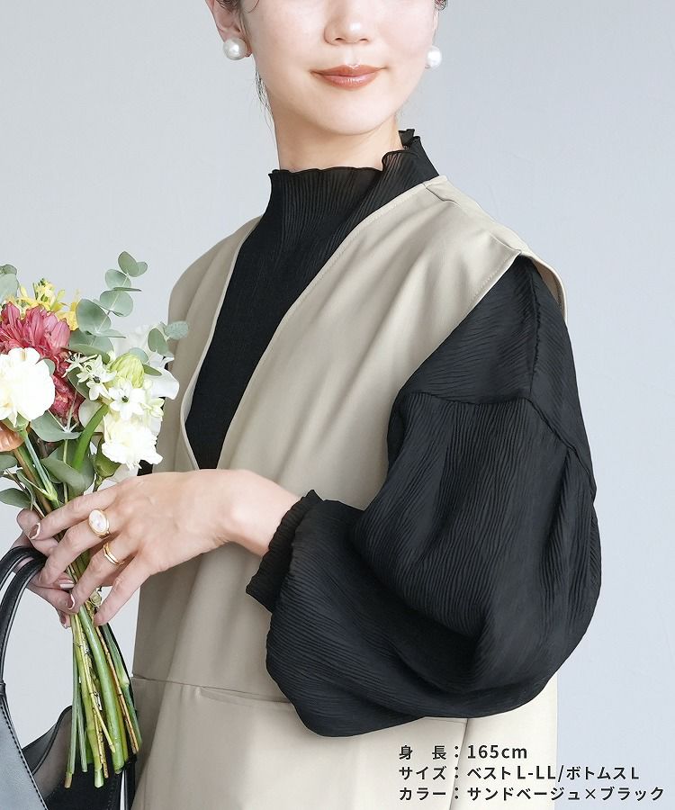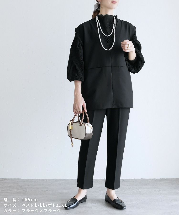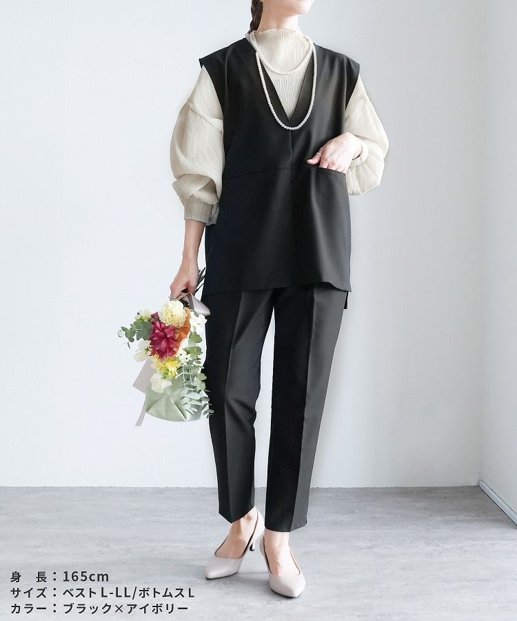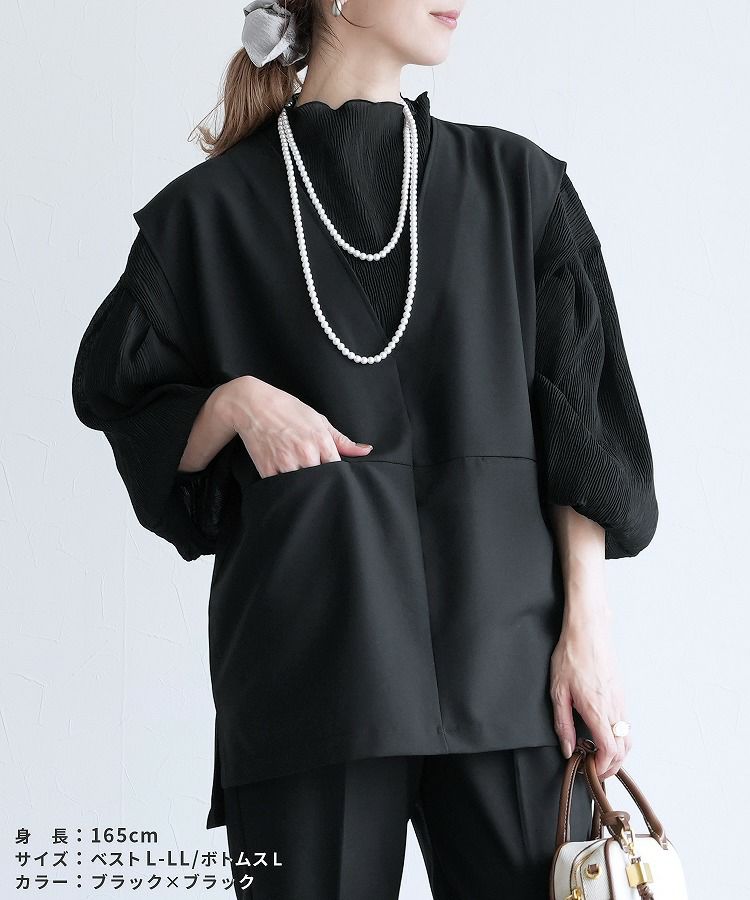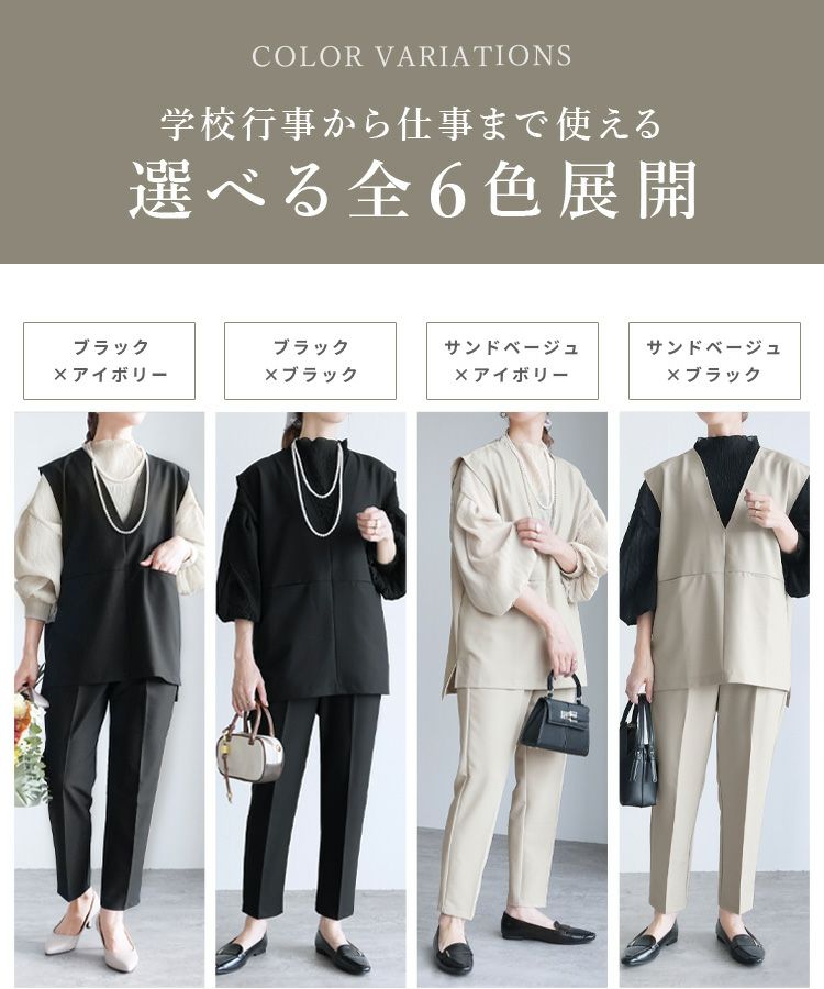 レディース セットアップ セレモニースーツ パンツスーツ Vネックベスト ジレ テーパードパンツ トップス 薄手 レイヤード ブラウス カットソー シアー ストライプ 透け感 無地 フレアスリーブ キャンディ袖 タック 長袖 ボトルネック カジュアル シンプル 楽ちん オケージョン 卒業式 入学式 卒園式 服装 母親 ママ おしゃれ 春 大人女子 30代ファッション 30代コーデ ブラック