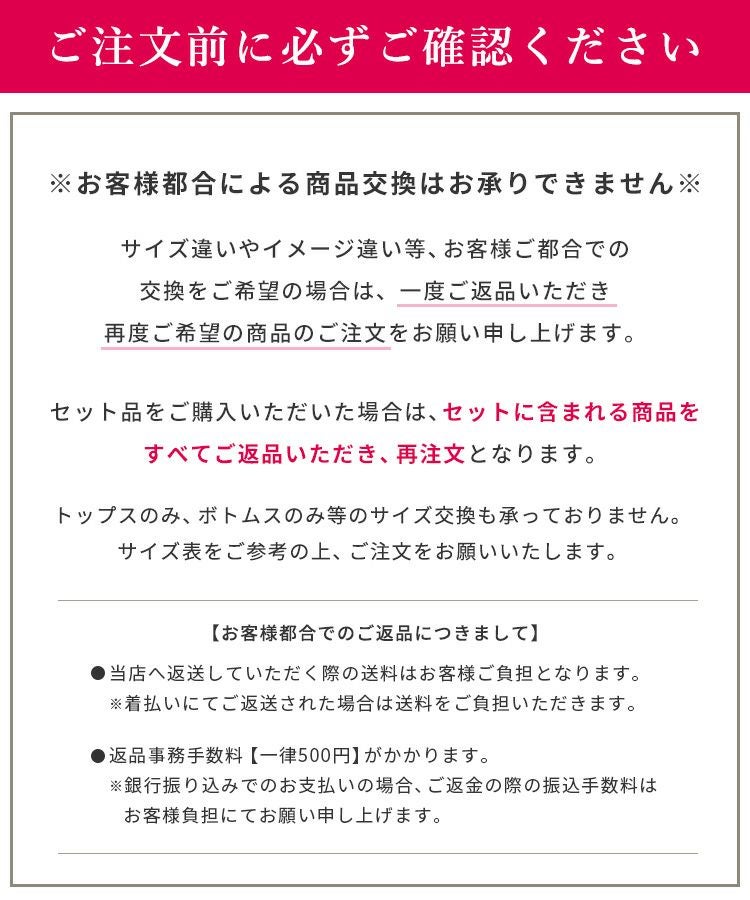 不良・商品間違い等以外のご返品は『お客様都合』にてお受けいたします。ご返送前に必ず弊社までメールまたはお電話にてお知らせください。