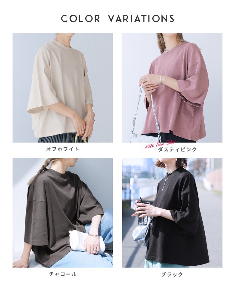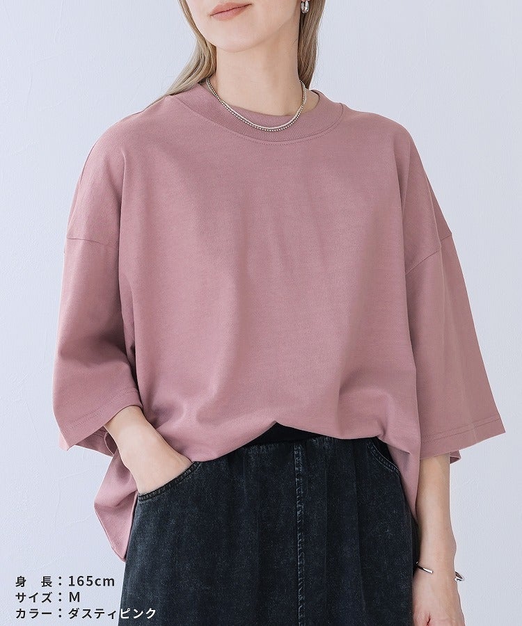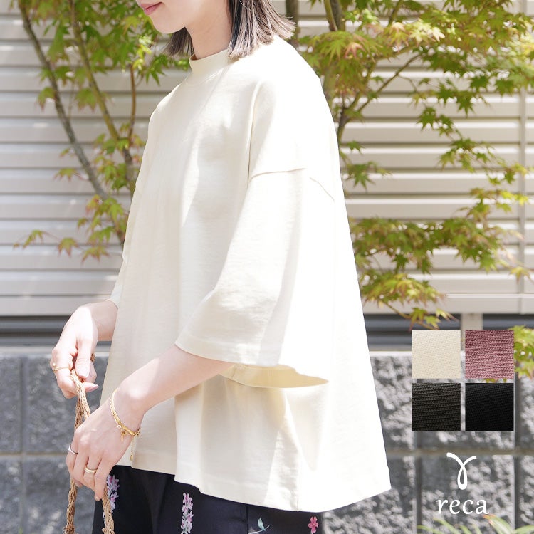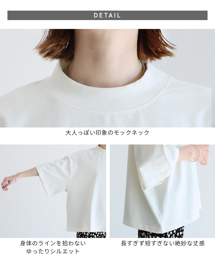 レディース カットソー 五分袖 モックネック カジュアル シンプル 楽ちん トップス 綿 コットン 大人女子 30代ファッション 30代コーデ ホワイト 白 ブラック 黒 ベージュ コーラル チャコール