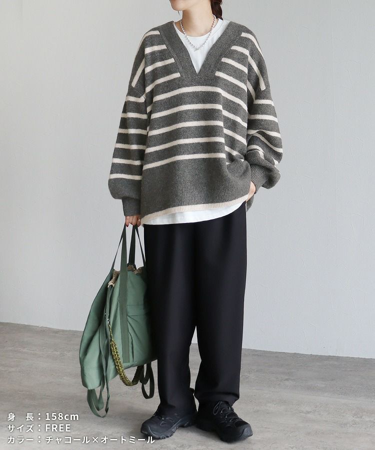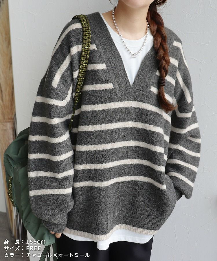 レディース トップス プルオーバー ニット セーター ボーダー 配色 バイカラー シック 長袖 Vネック 深V キレカジ カジュアル シンプル 大人女子 30代ファッション 30代コーデ もちもち モカ チャコール ブルーグレー ベージュ グレー ミント オートミール アイボリー ブラック