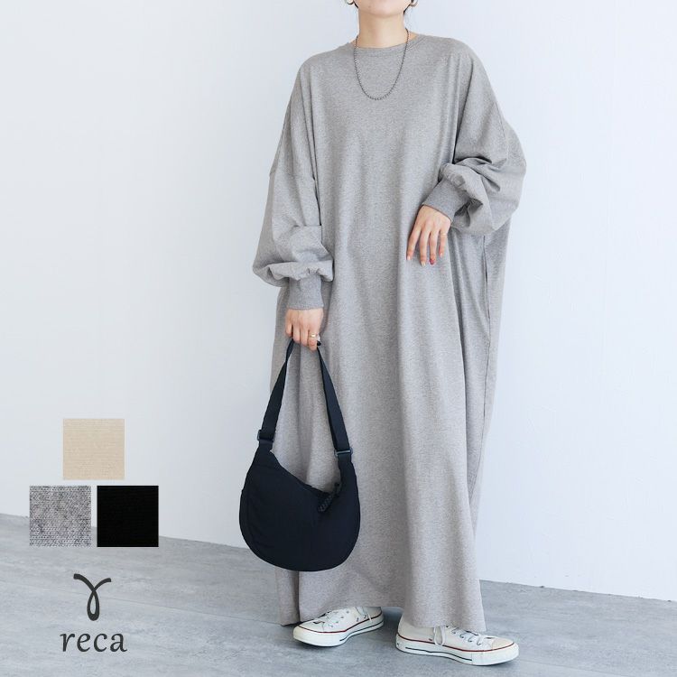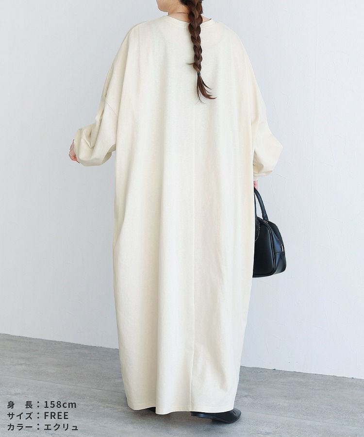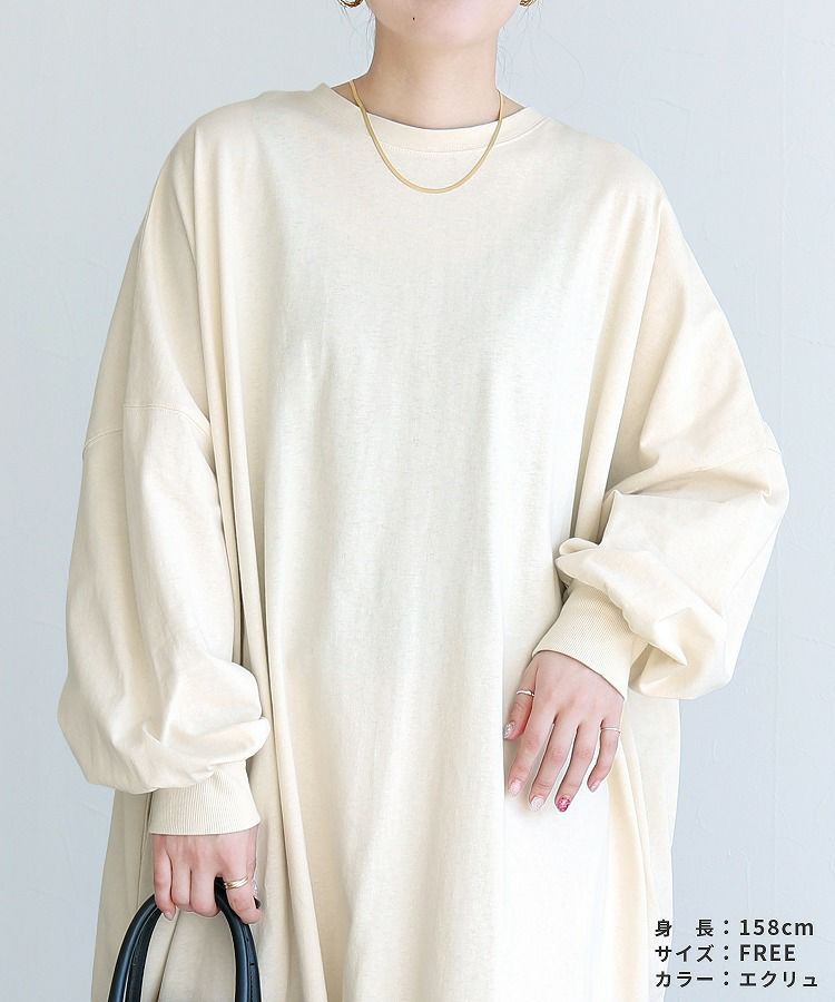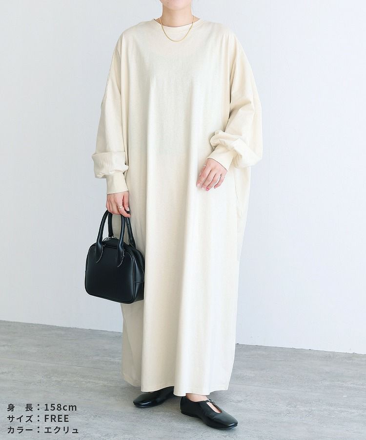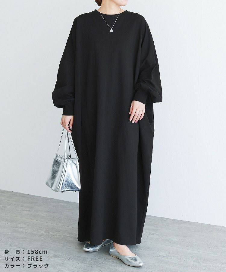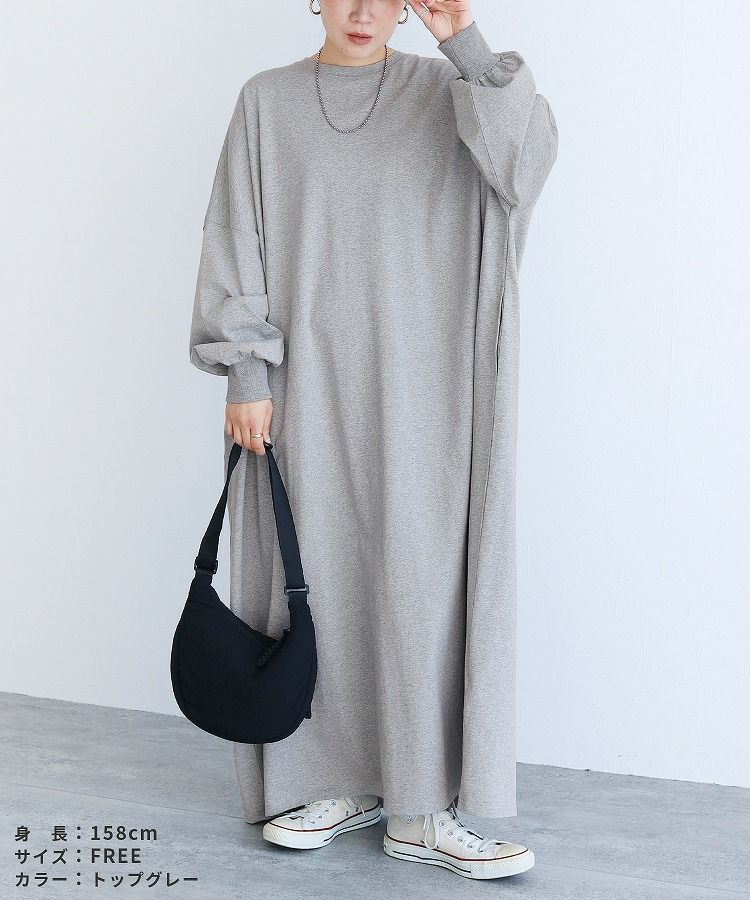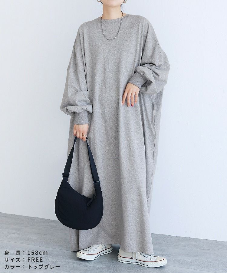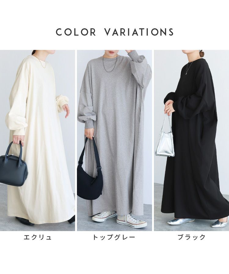 レディース ワンピース 薄手 カットソー ゆったり オーバーサイズ ビッグサイズ ビッグシルエット ボリューム袖 ロング マキシ カジュアル シンプル 楽ちん 体型カバー 長袖 クルーネック 丸首 大人女子 30代ファッション 30代コーデ 40代ファッション 40代コーデ エクリュ トップグレー 杢グレー 黒 ブラック