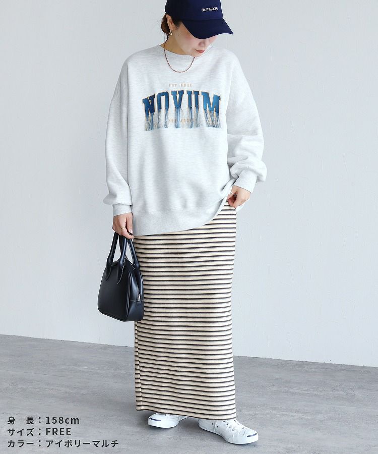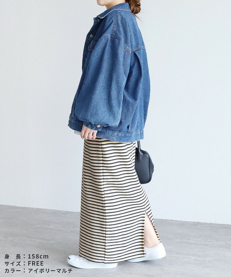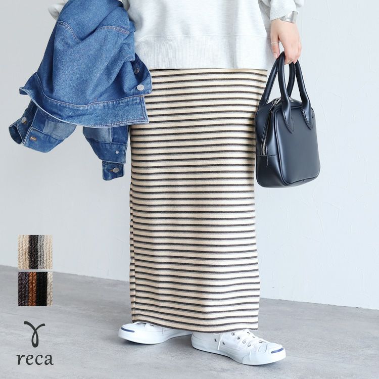 レディース ボトムス スカート ロング マキシ ナロー カジュアル シンプル 楽ちん ボーダー 配色 ウエストゴム 調整 調節 伸縮性 ストレッチ 大人女子 30代ファッション 30代コーデ 40代ファッション 40代コーデ アイボリー ブラウン