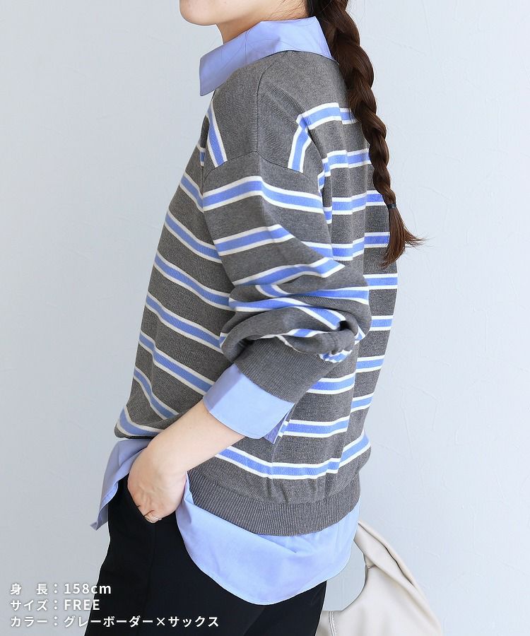 レディース トップス ニット 重ね着 レイヤード シャツ カジュアル シンプル 長袖 春 カジュアル シンプル 大人女子 30代ファッション 30代コーデ 40代ファッション 40代コーデ ブラック 黒 オフホワイト 白 グレー ストライプ サックス