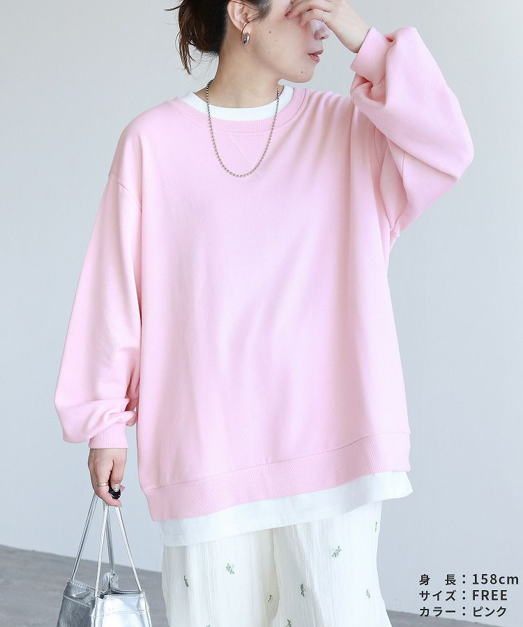 レディース シンプル カジュアル スウェット トレーナー プルオーバー トップス 長袖 重ね着 レイヤード風 楽ちん ゆったり 着回し 春 秋 大人女子 30代ファッション 30代コーデ 40代コーデ ママ 母 ママコーデ 黒 ブラック グレー ピンク パープル