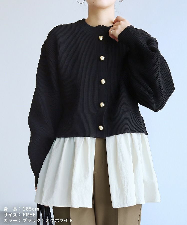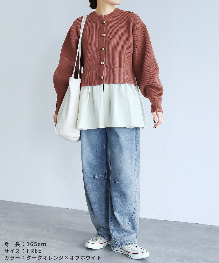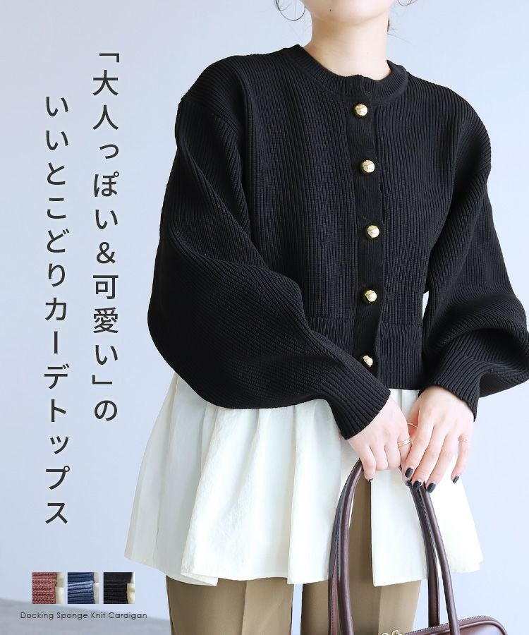 レディース トップス ニット セーター 軽量 軽い 金ボタン 羽織 カーディガン カーデ ニットカーデ スポンジニット スポンディッシュニット ウエストフレア ウエストギャザー 袖口タック 異素材 切替 ドッキング ドッキングデザイン ペプラム たぽん袖 ぽわん袖 バルーン袖 バルーンスリーブ ボリューム袖 長袖 クルーネック 丸首 キレイめ カジュアル フェミニン お腹カバー 体型カバー シンプル 大人女子 30代ファッション 30代コーデ 無地 バイカラー 配色 くすみカラー ダークオレンジ オレンジ ブルー 青 ホワイト 白 ブラック 黒