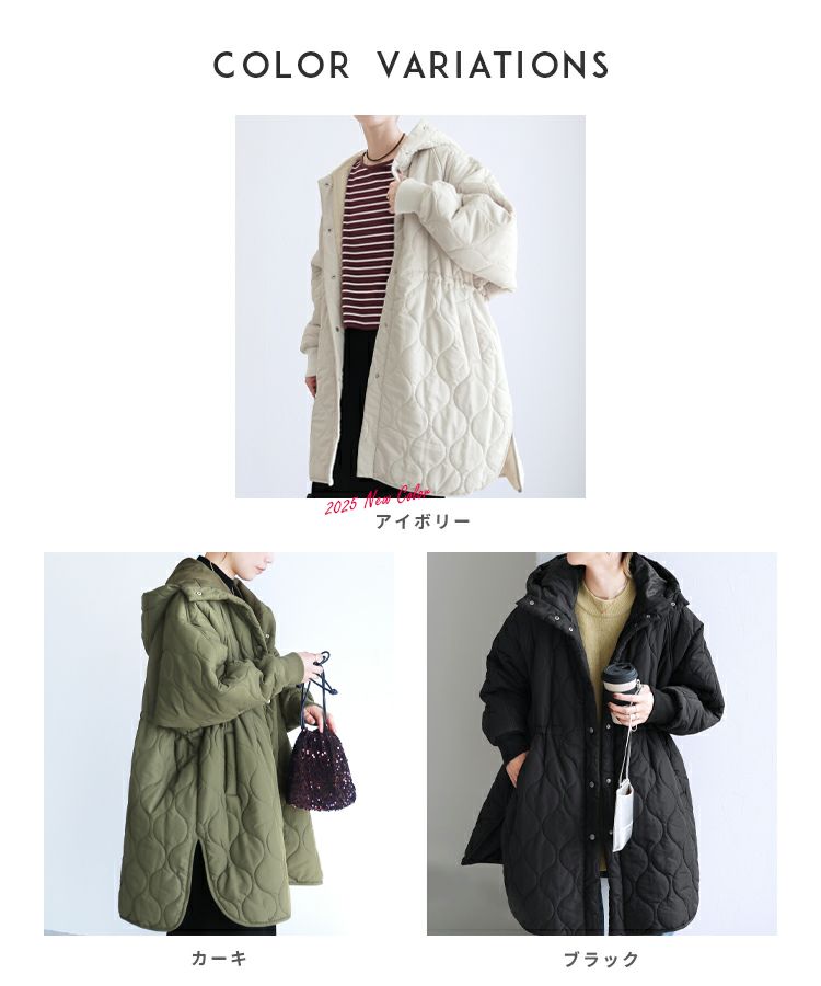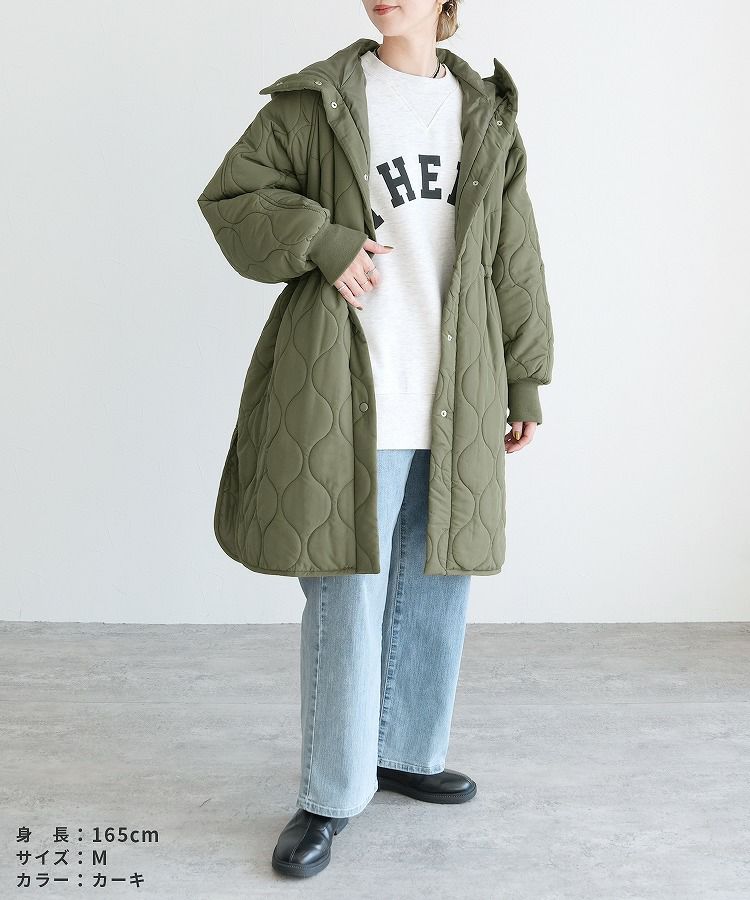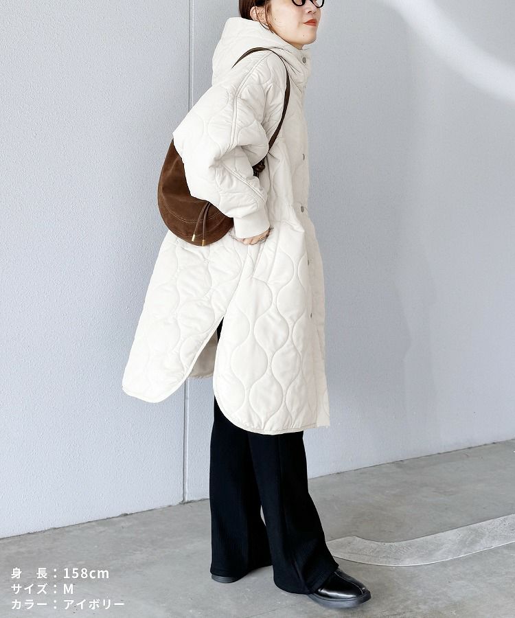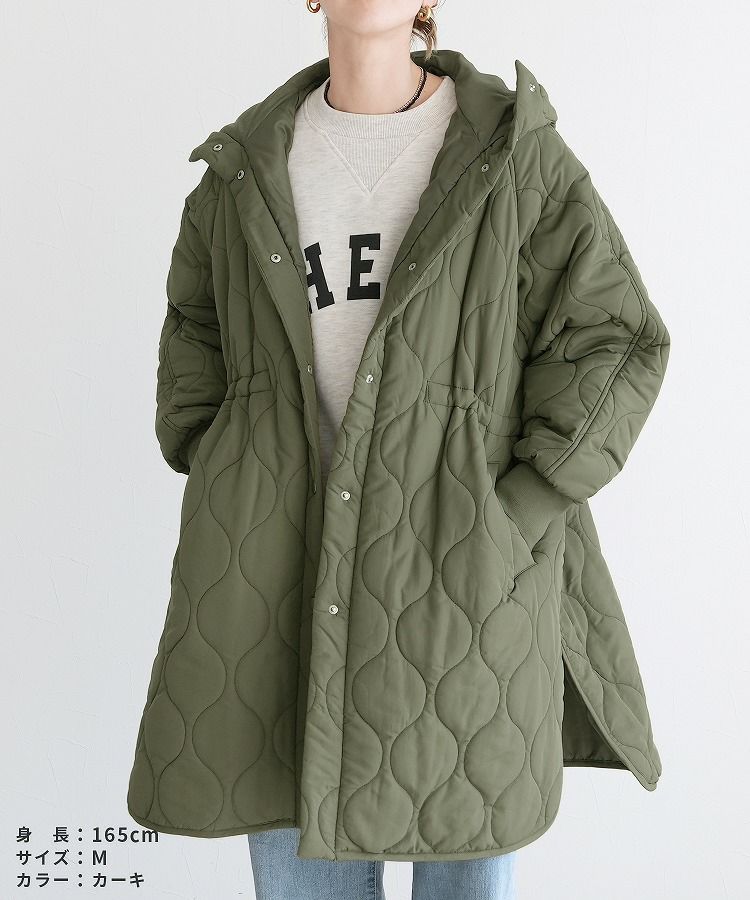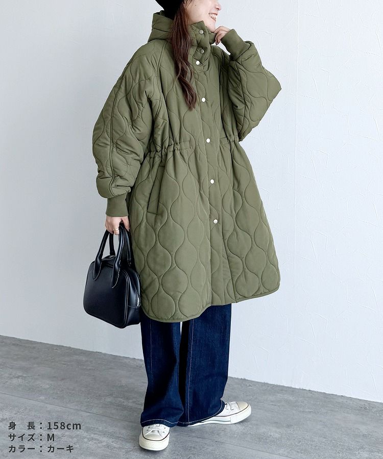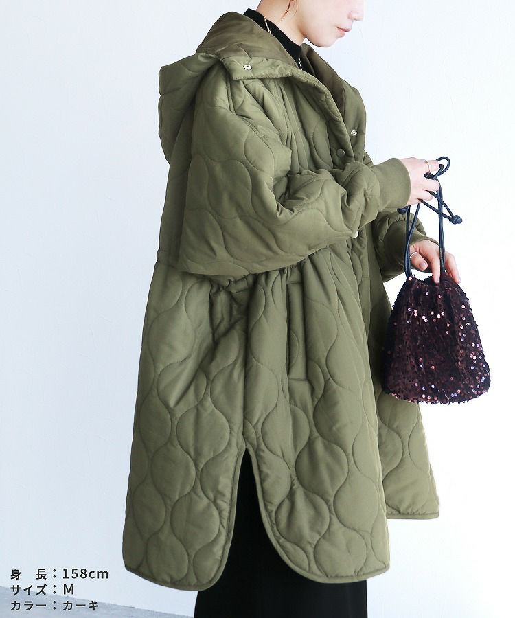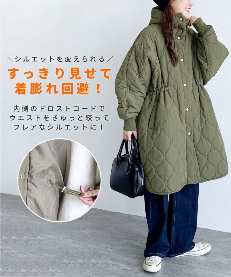 レディース アウター コート ジャケット ジャンパー ジャンバー ロングコート ロング丈 ロング 丈長め 長め 長い 膝上 ひざ上 膝丈 ひざ丈 ハイネック フード付き ライトアウター 長袖 長そで 十分袖 十分そで 10分袖 キルティングアウター キルティングコート キルティングジャケット キルトアウター キルトコート キルトジャケット キルティング キルト ひょうたん柄 ひょうたんキルト ドロスト ウエストドロスト 楽ちん 楽チン カジュアル ナチュラル おしゃれ オシャレ 可愛い かわいい きれいめ キレイめ 大人 オトナ 上品 シンプル ベーシック 自転車 保育園 幼稚園 送り迎え 送迎 お見送り ママファッション ママコート オフィススタイル オフィスカジュアル オフィス 会社 職場 職場着 仕事着 仕事 通勤 ol OL 通学 学校 学生 高校 高校生 大学 大学生 20代 30代 40代 50代 60代 カーキ ブラック 黒 アイボリー オフホワイト 白