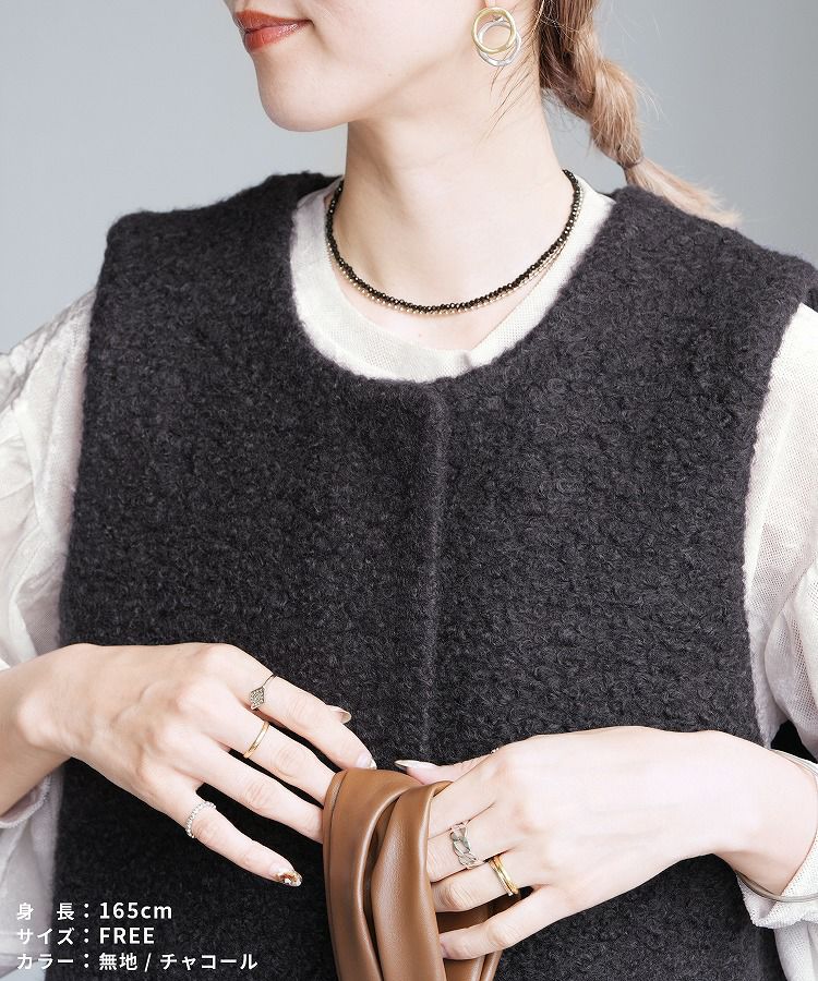レディース トップス アウター ベスト ジレ 無地 チェック柄 ブークレ ブークレー 体型カバー スナップボタン ボタン仕様 ポケット付き ポケット ふわふわ ノースリーブ クルーネック 丸首 キレイめ カジュアル フォーマル シンプル 七五三 お祝い 入学式 大人女子 30代ファッション 30代コーデ ママ ママコーデ ホワイト エクリュ 白 チャコール グレー ベージュ