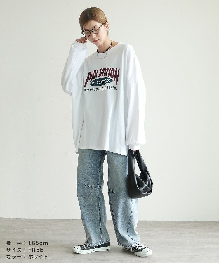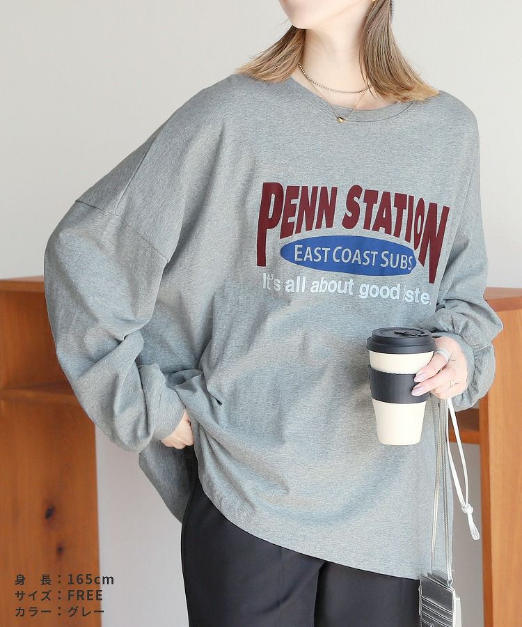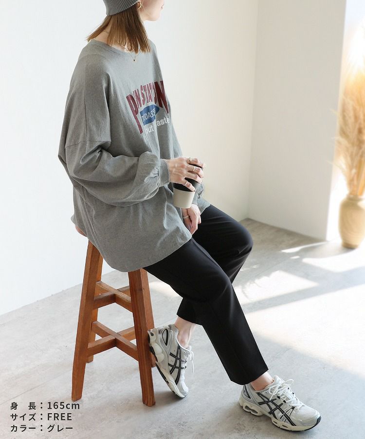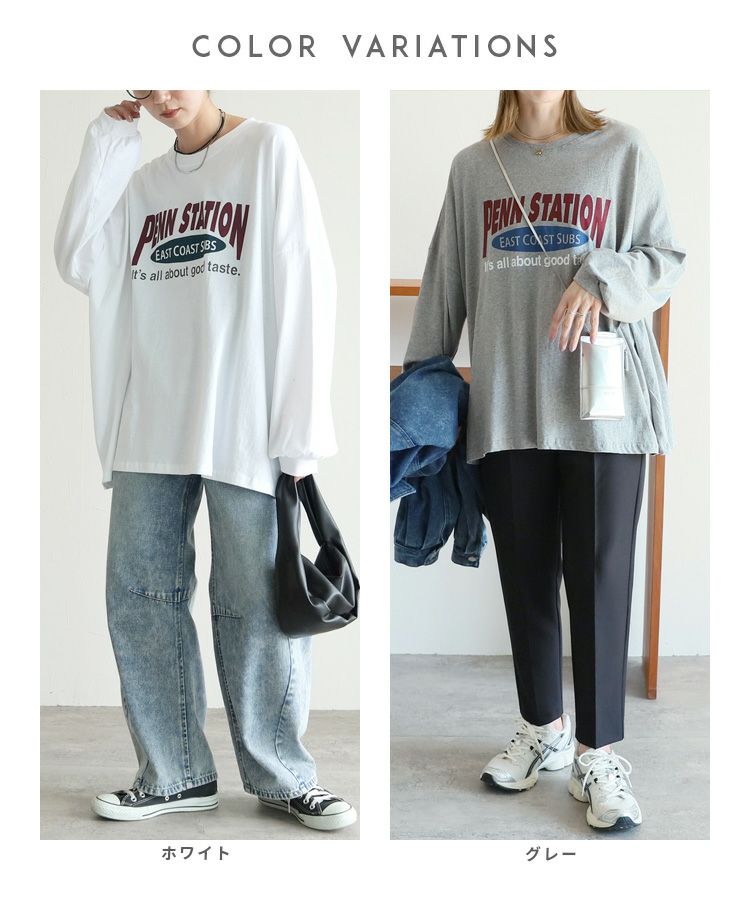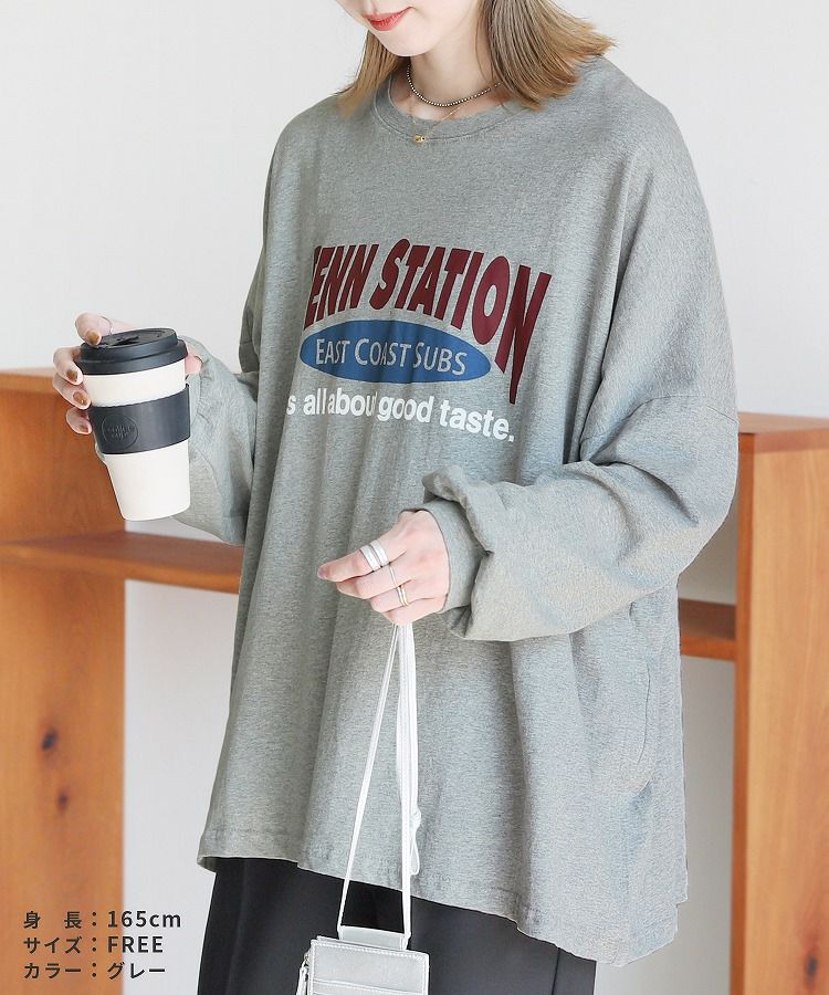 レディース トップス プルオーバー Tシャツ ロンT ロゴT ロゴ プリントロゴ オーバーサイズ ビッグサイズ メンズライク ヴィンテージ 秋 長袖 クルーネック 丸首 カジュアル シンプル 大人女子 30代ファッション 30代コーデ プリント オートミール ホワイト 白 ブラック 黒 グレー