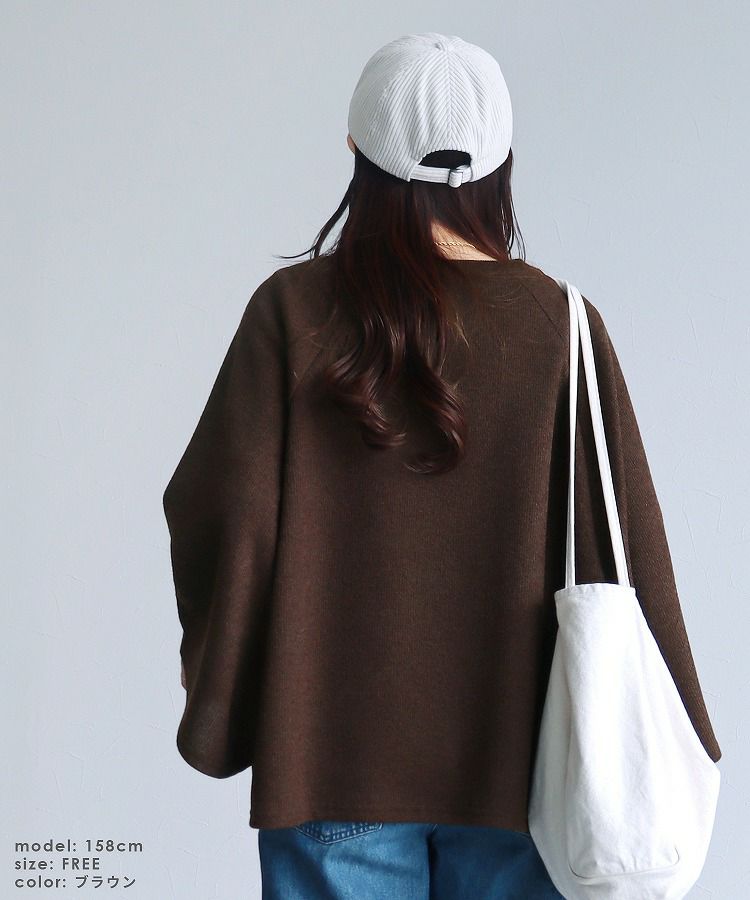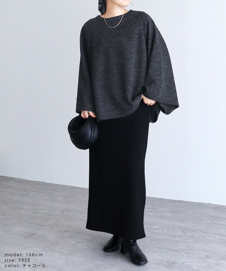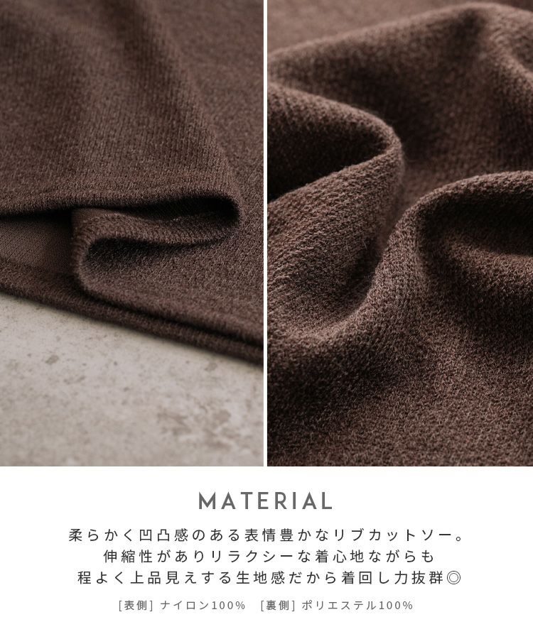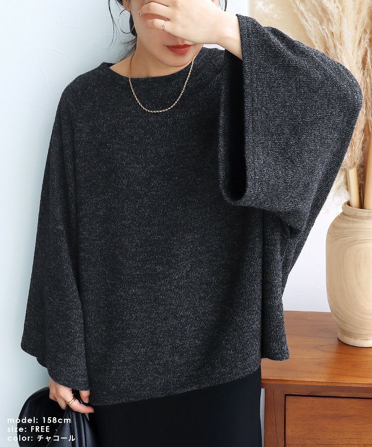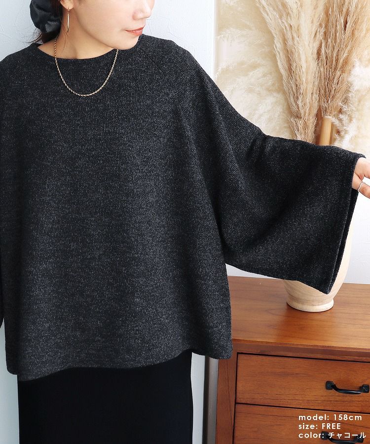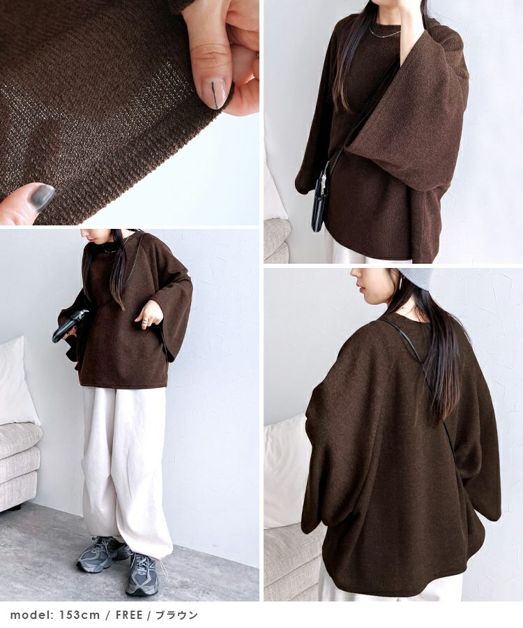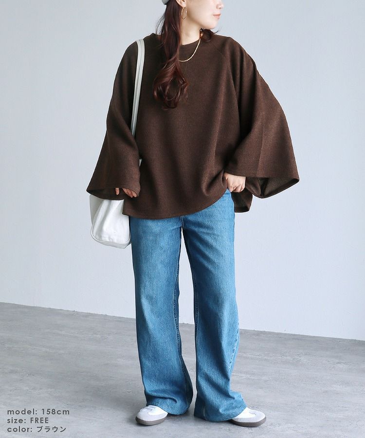 レディース トップス カットソー ニットソー プルオーバー 無地 リブ ロング袖 ロンT ワイド袖 ワイドスリープ ベルスリープ ベル袖 長袖 クルーネック 丸首 キレカジ カジュアル シンプル キレイめ 大人女子 30代ファッション 30代コーデ 体型カバー 細見え チャコール ダークカラー ブラウン 茶