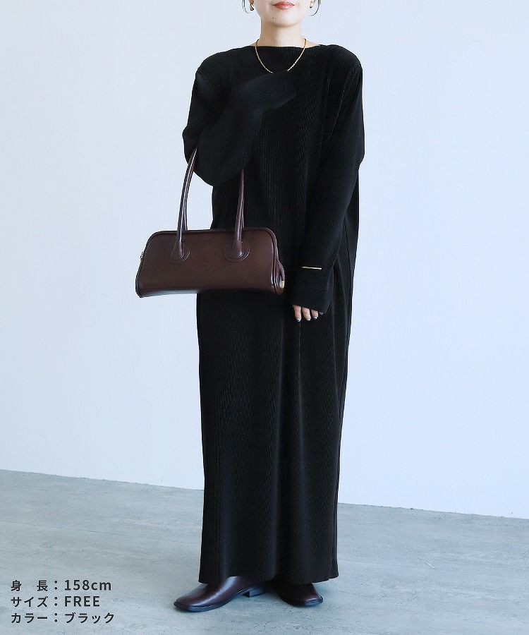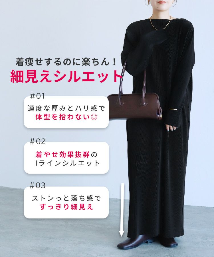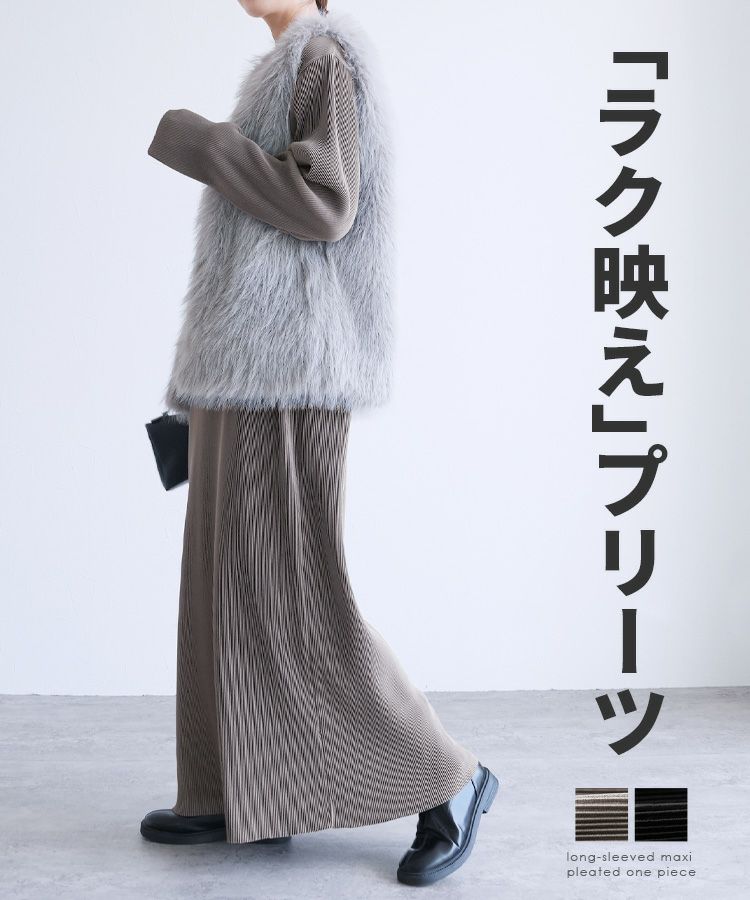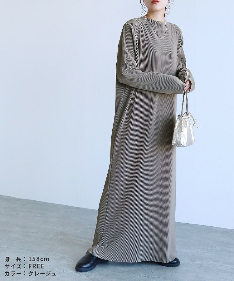 レディース ワンピース ロング マキシ プルオーバー セルフカット カットオフ プリーツ アコーディオンプリーツ ゆったり 長袖 クルーネック 丸首 アイロン要らず キレイめ キレカジ カジュアル ワンマイルウェア イージーケア 楽ちん 妊婦 マタニティ 時短 落ち感 シンプル 大人女子 30代ファッション 30代コーデ 無地 グレージュ グレーダークベージュ ブラック 黒 くすみカラー