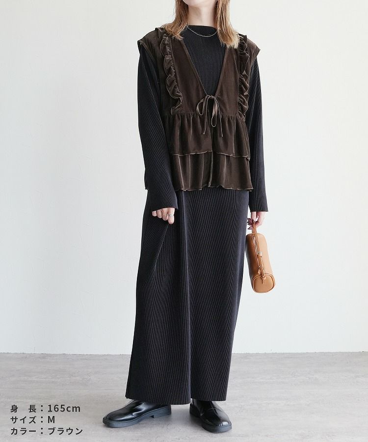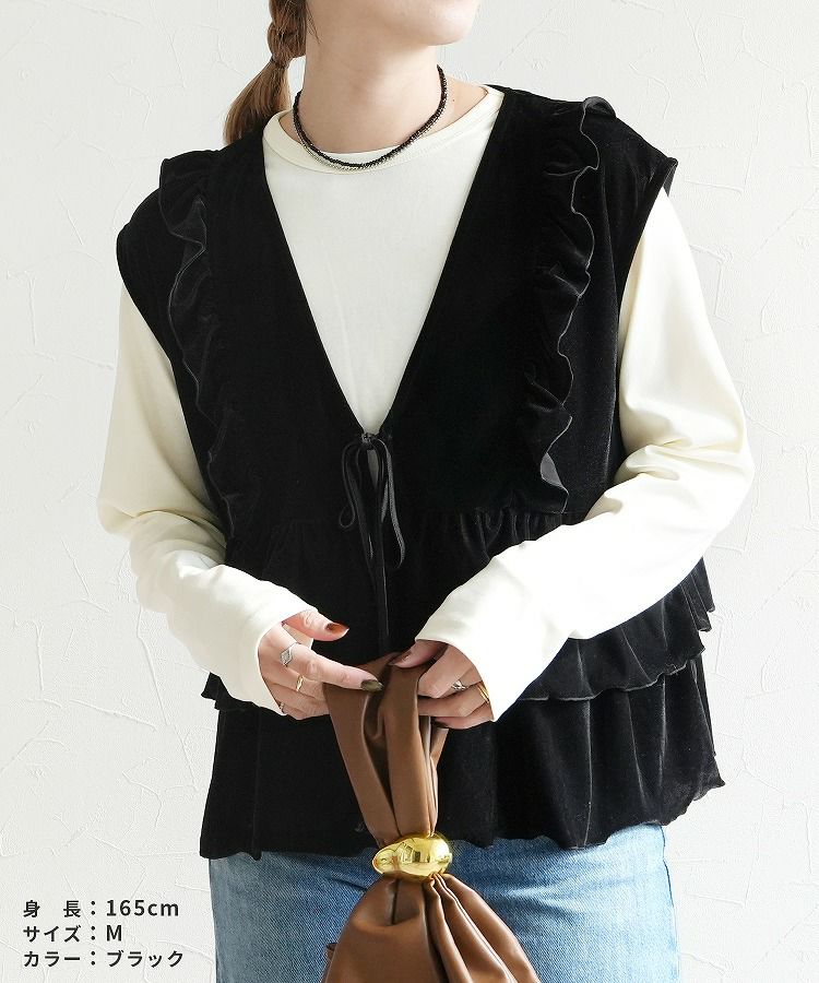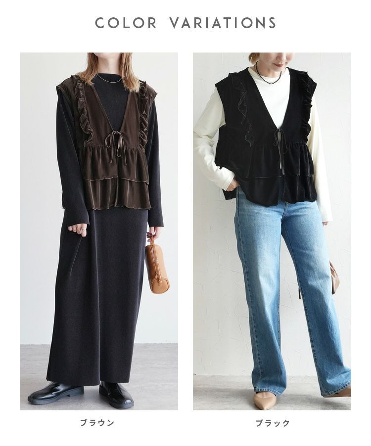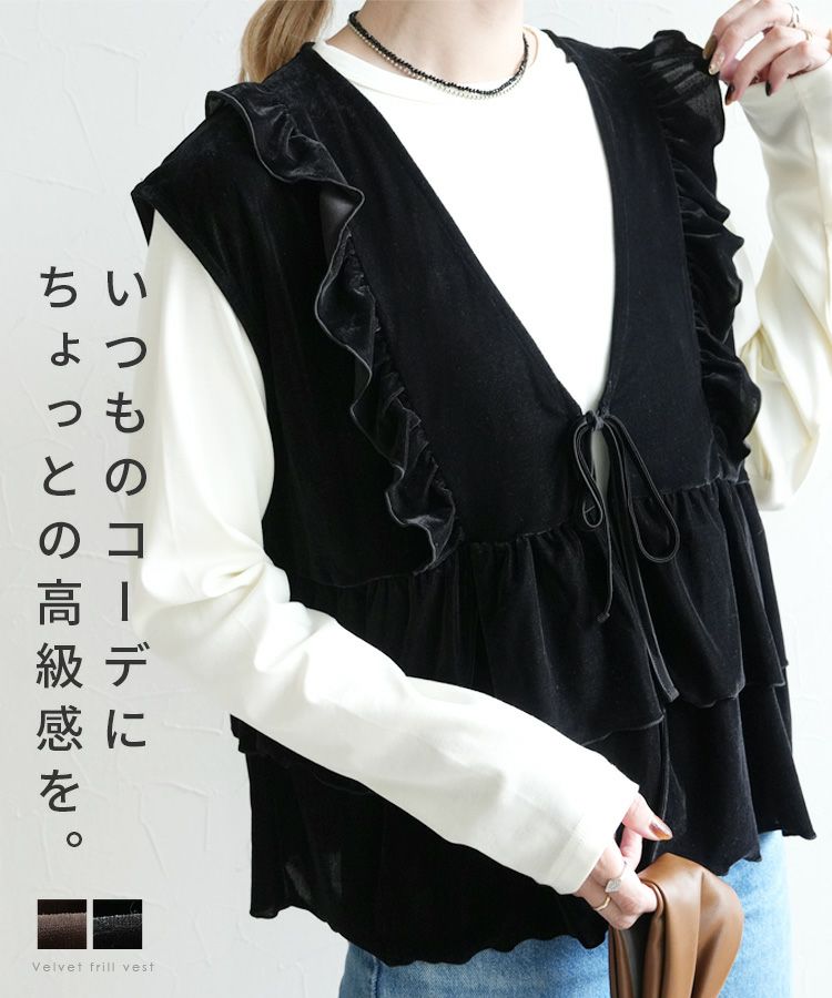 レディース トップス ベスト ベロア 光沢感 起毛 保温性 シンプル カジュアル きれいめ フォーマル オフィス レイヤード 羽織り 楽ちん 体型カバー おしゃれ 秋 大人女子 30代ファッション 30代コーデ 40代コーデ 50代コーデ ママ 黒 ブラック ブラウン