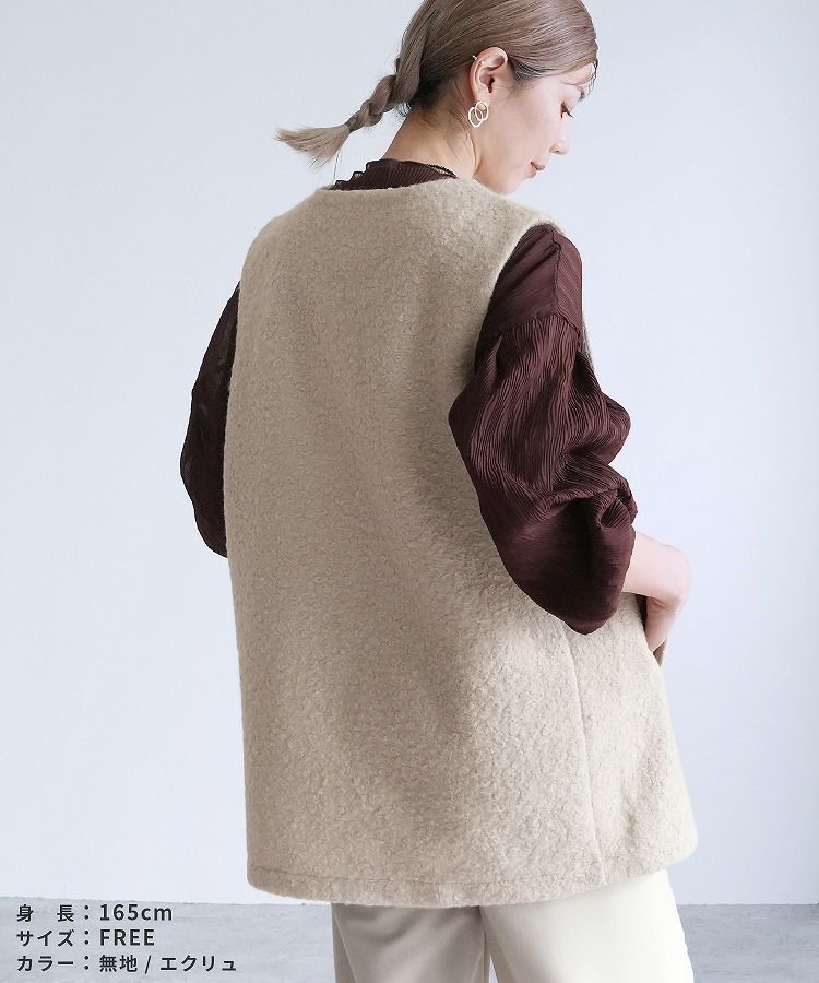 レディース トップス アウター ベスト ジレ 無地 チェック柄 ブークレ ブークレー 体型カバー スナップボタン ボタン仕様 ポケット付き ポケット ふわふわ ノースリーブ クルーネック 丸首 キレイめ カジュアル フォーマル シンプル 七五三 お祝い 入学式 大人女子 30代ファッション 30代コーデ ママ ママコーデ ホワイト エクリュ 白 チャコール グレー ベージュ