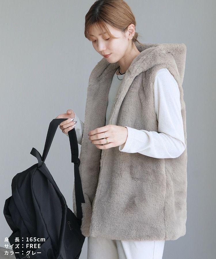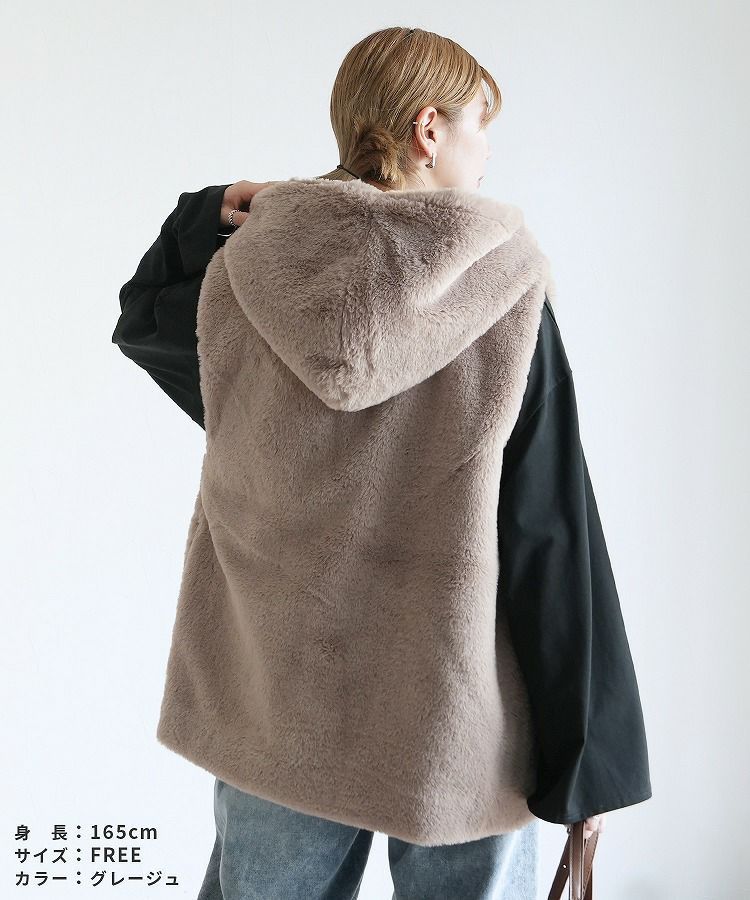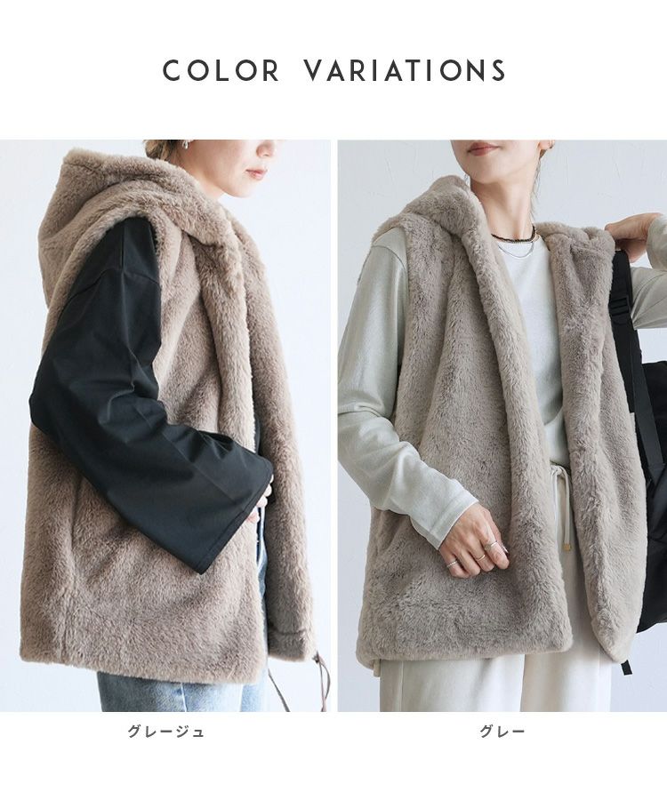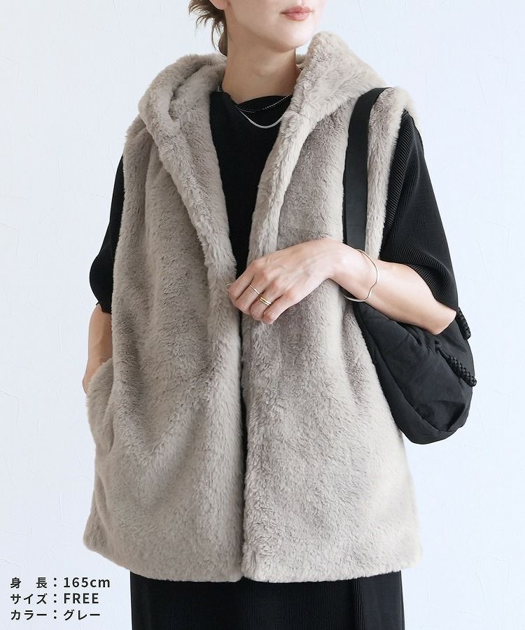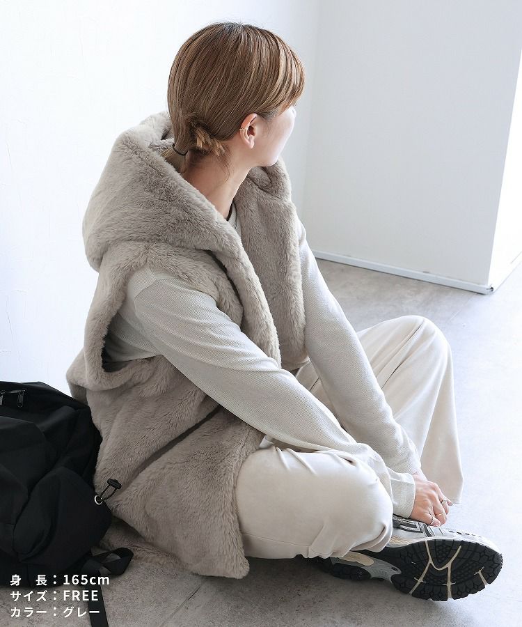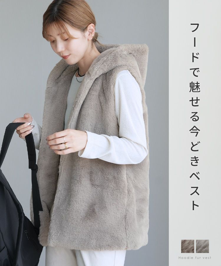 レディース 2025年秋新作 アウター ベスト ファーベスト フード ファー ポケット もこもこ 暖かい カジュアル シンプル 楽ちん 秋 大人女子 30代ファッション 30代コーデ グレージュ グレー