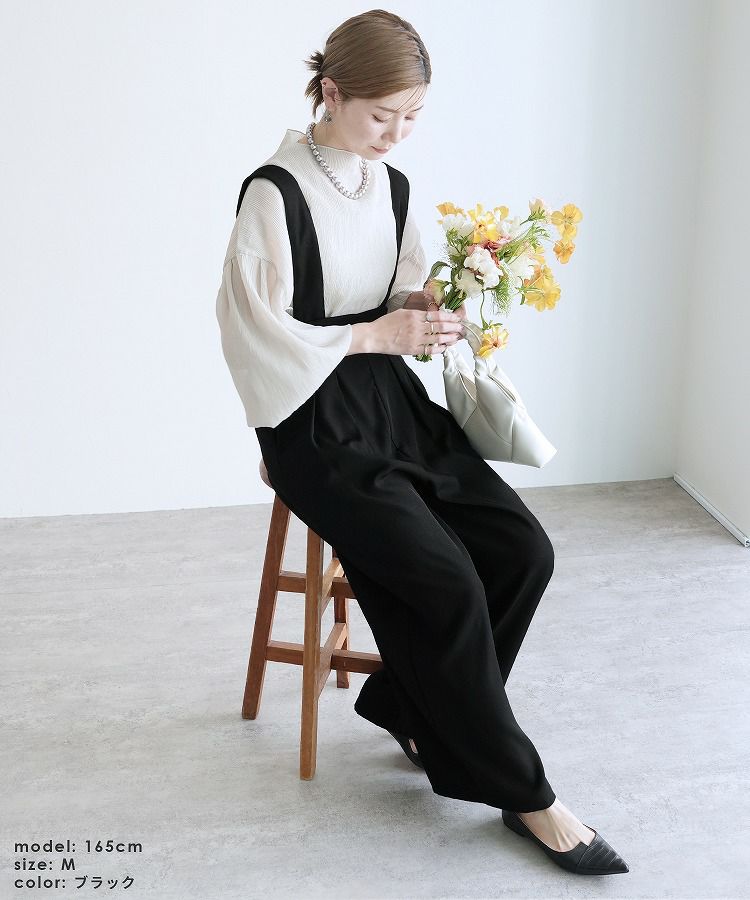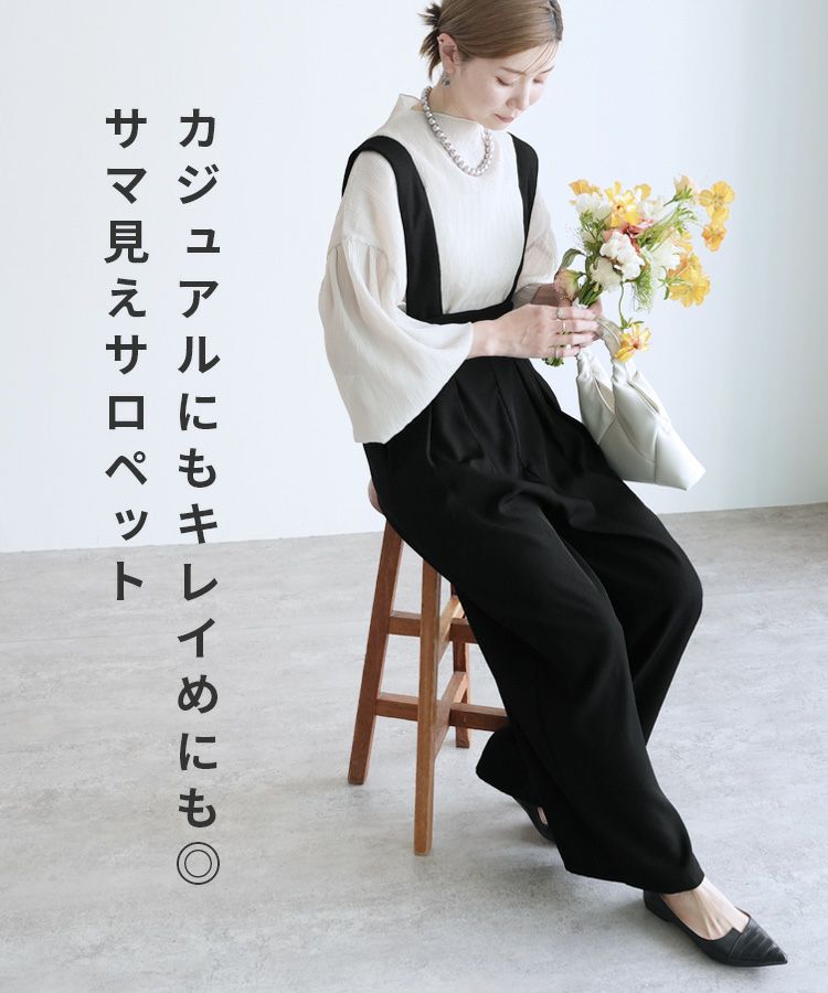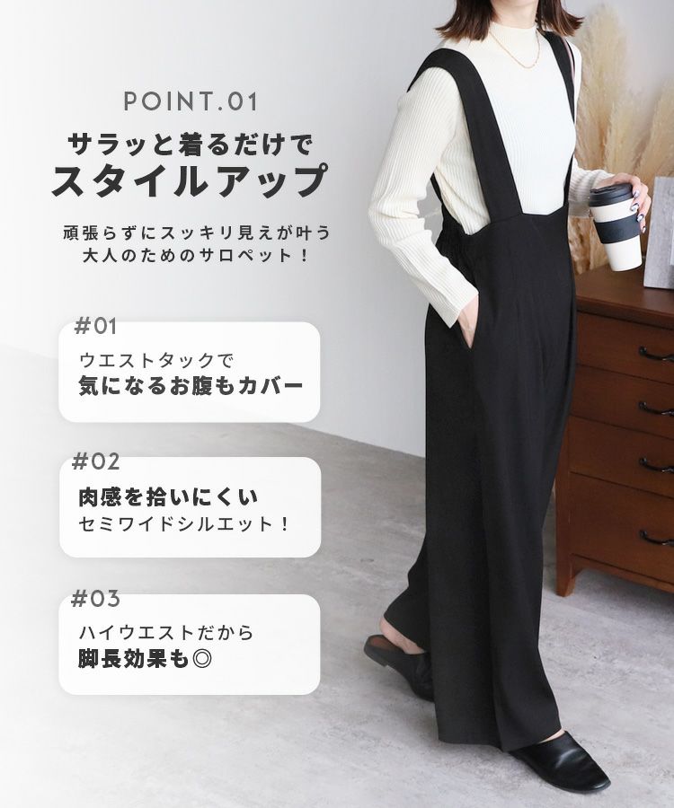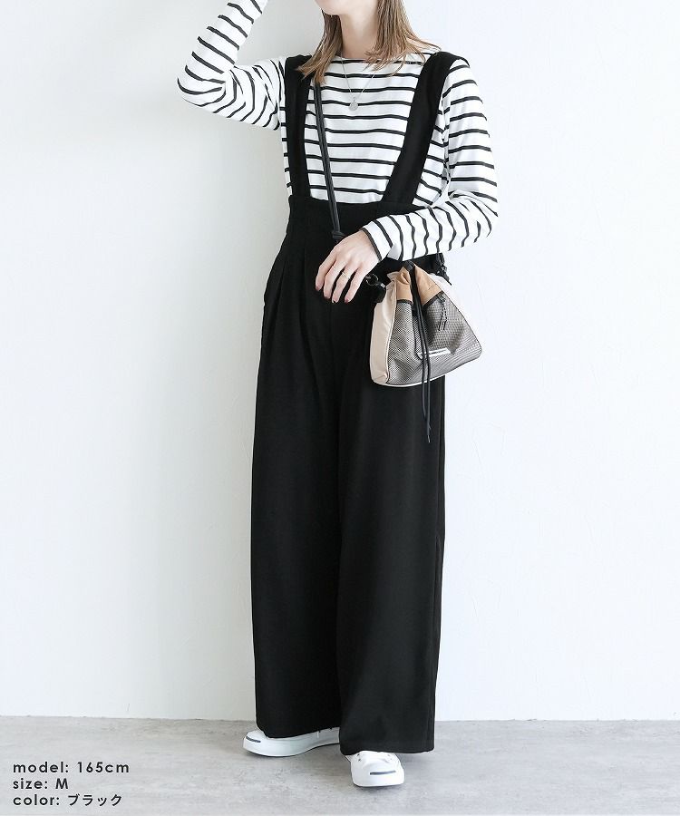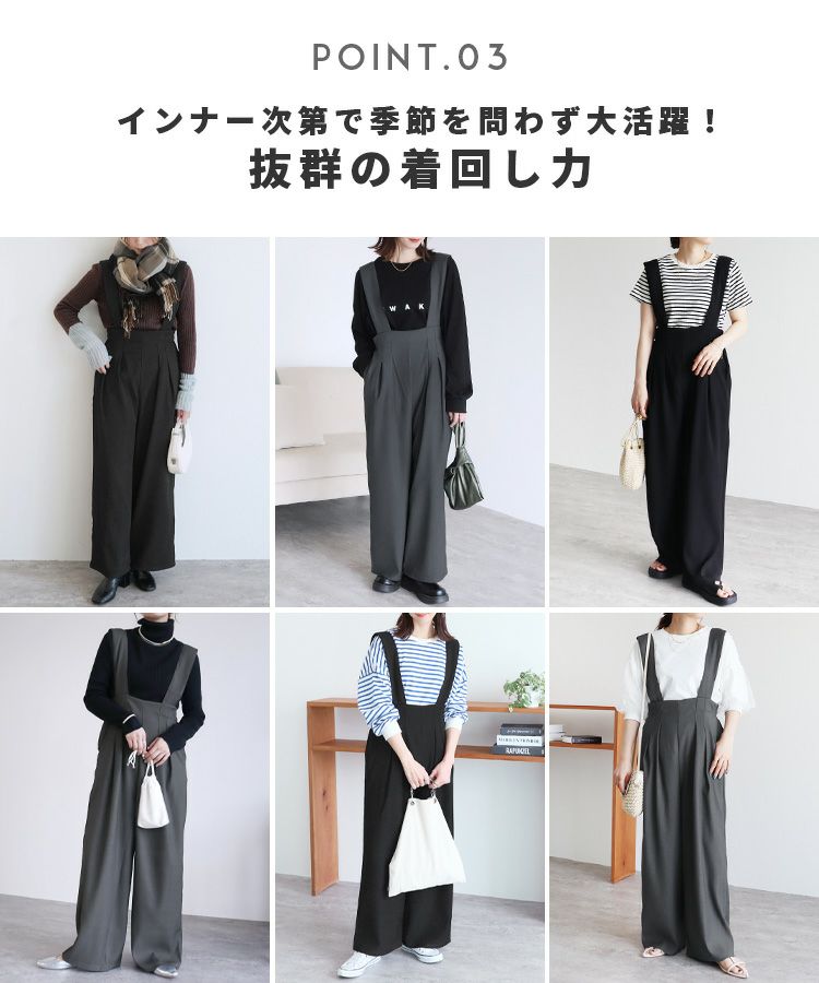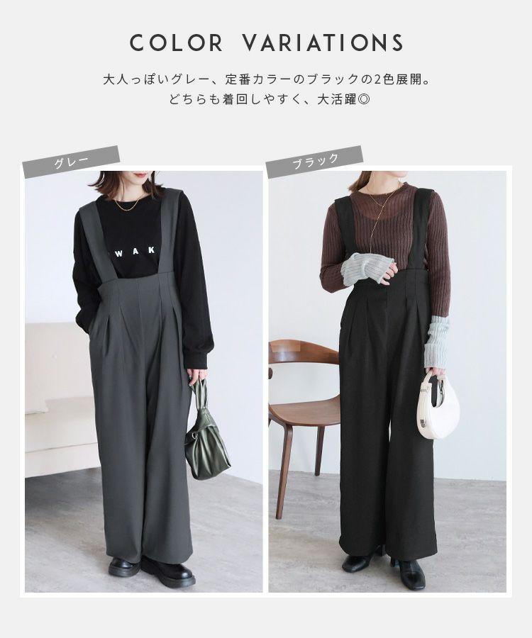 レディース サロペット オーバーオール カジュアル シンプル パンツ ポケット レイヤード ワイド 着回し ハイウエスト タック きれいめ スタイルアップ 大人女子 30代ファッション 30代コーデ グレー ブラック 灰色 黒