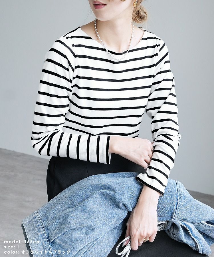 レディース ボーダー カットソー Tシャツ プルオーバー トップス 薄手 長袖 着回し 楽ちん カジュアル シンプル コンパクト ジャストサイズ Mサイズ Lサイズ コットン100% 綿 秋服 春服 女性 オフホワイト 白 ブラック 黒