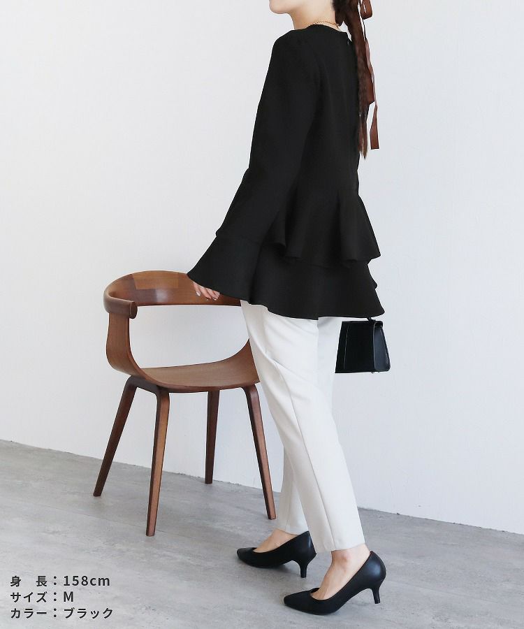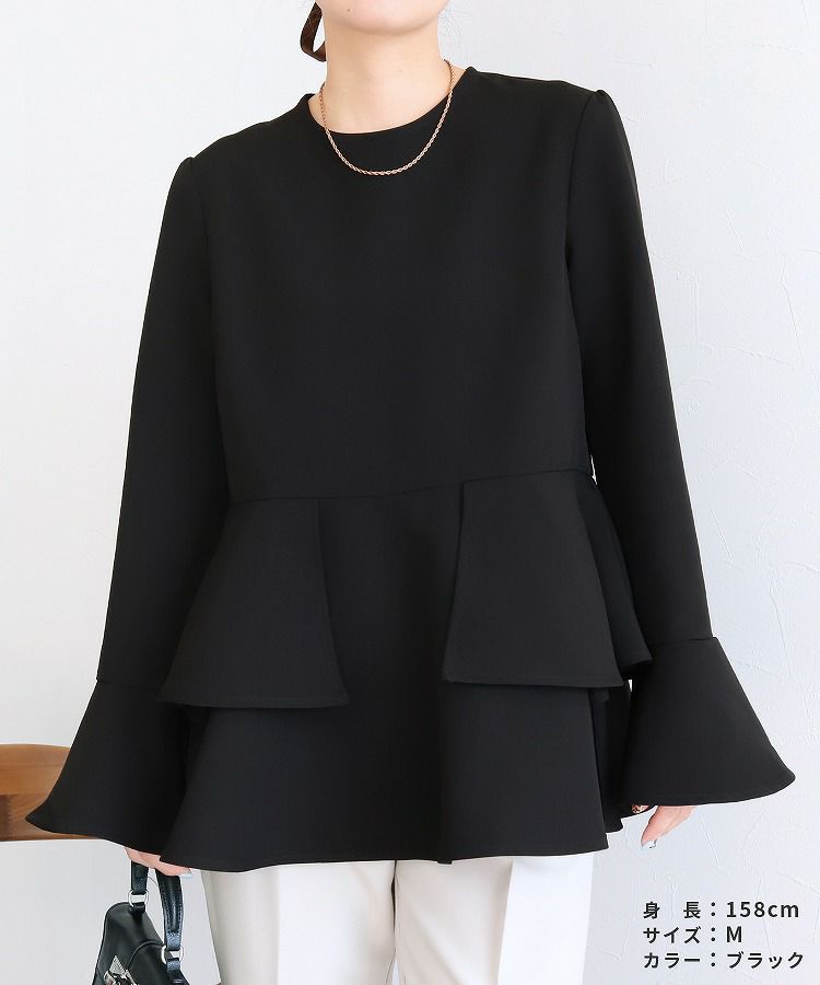 レディース トップス プルオーバー フレアスリーブ ペプラム 体型カバー 上品 シンプル オケージョン 長袖 クルーネック 丸首 カジュアル 大人女子 30代ファッション 30代コーデ ベージュ ブラック