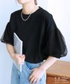 レディース トップス カットソー Tシャツ プルオーバー 袖チュール チュール重ね 異素材 ボリューム袖 半袖 クルーネック 丸首 キレカジ カジュアル シンプル フェミニン 大人可愛い ガーリー 大人女子 30代ファッション 30代コーデ 無地 ホワイト 白 ブラック 黒