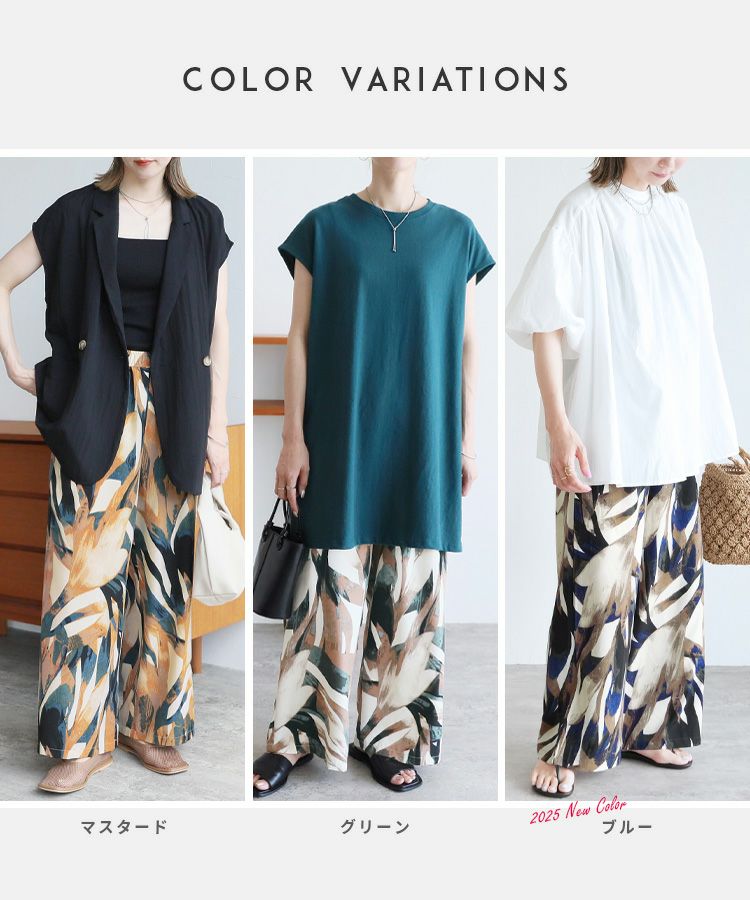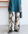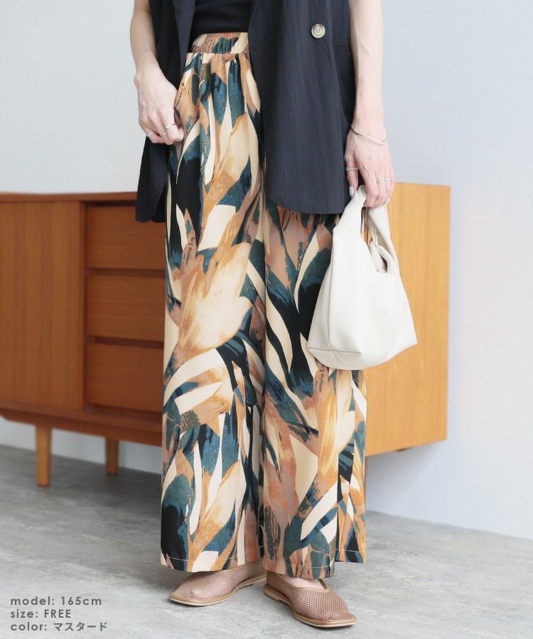 レディース ボトムス パンツ ワイドパンツ イージーパンツ 柄パンツ プリント カジュアル シンプル 楽ちん ウエストゴム ポケット 夏 大人女子 30代ファッション 30代コーデ マスタード グリーン ブルー